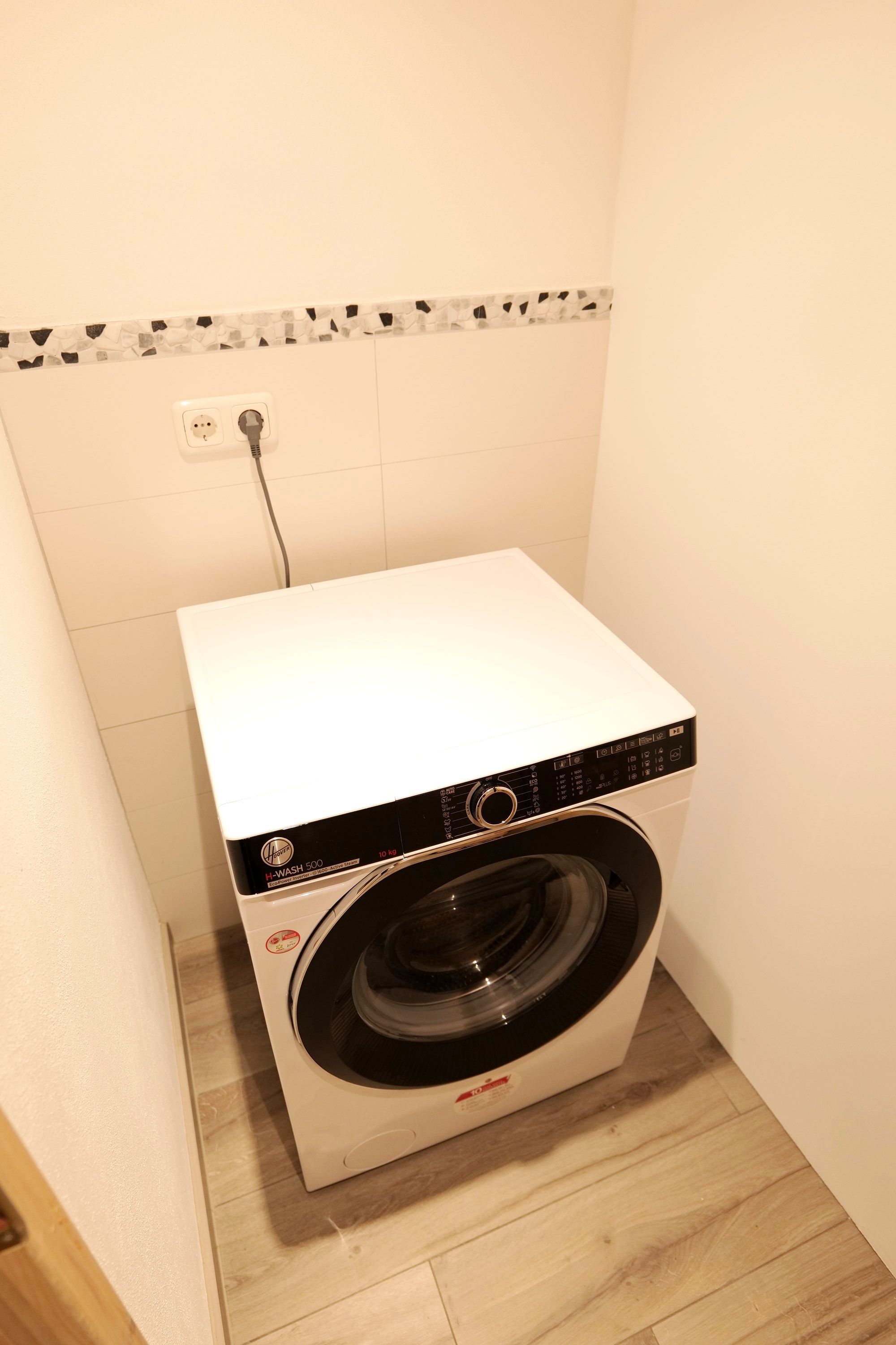 - Waschmaschine im Waschmaschinenraum, Wäscheständer