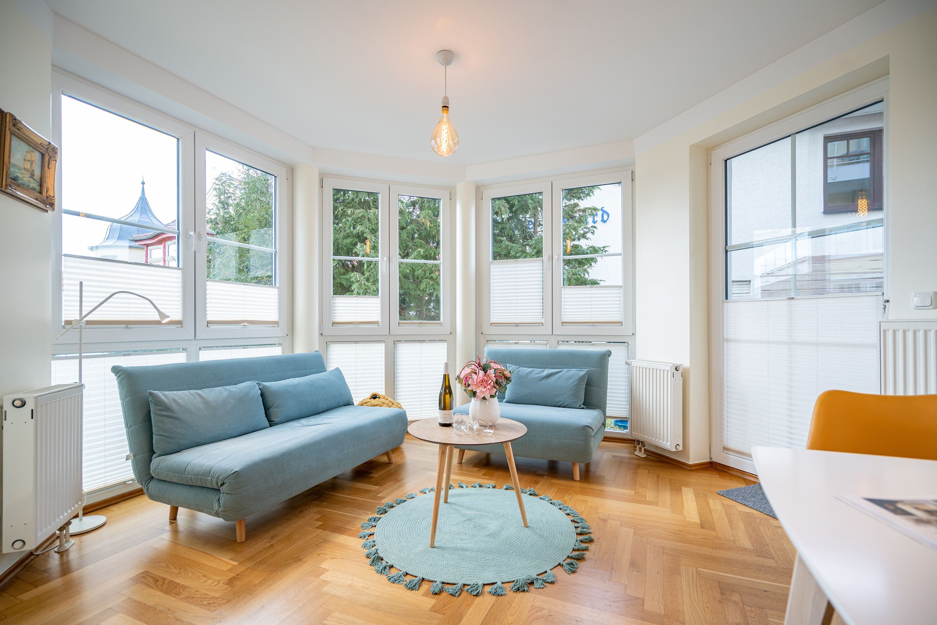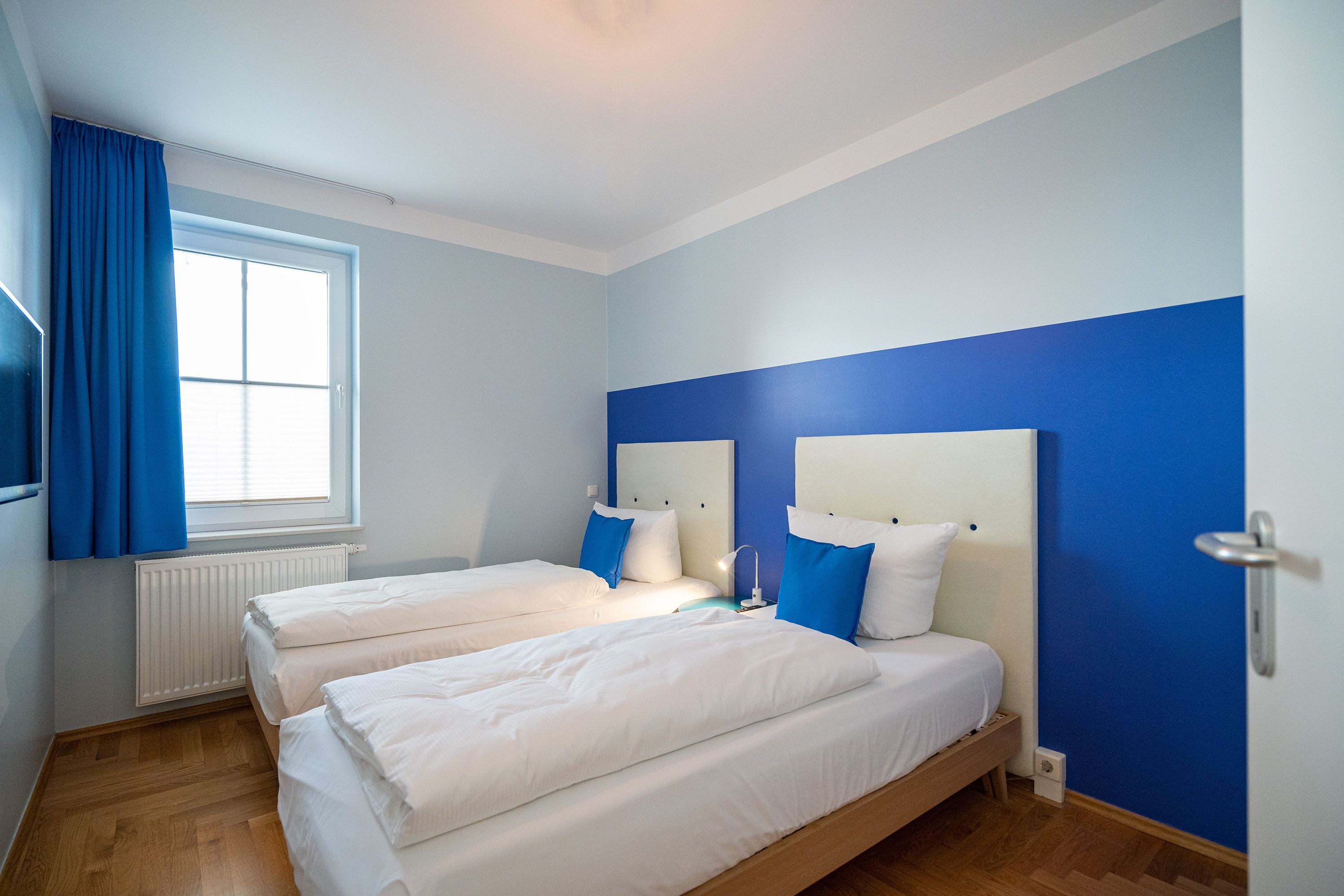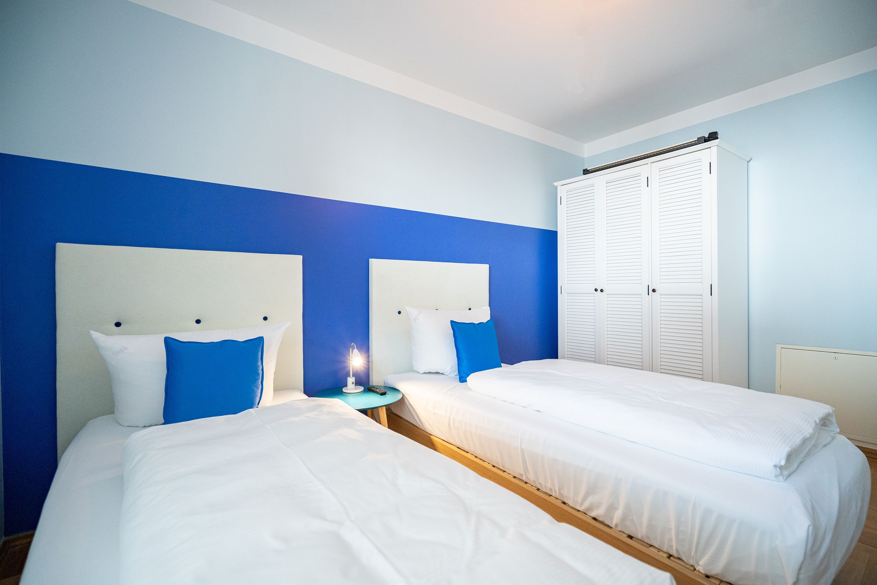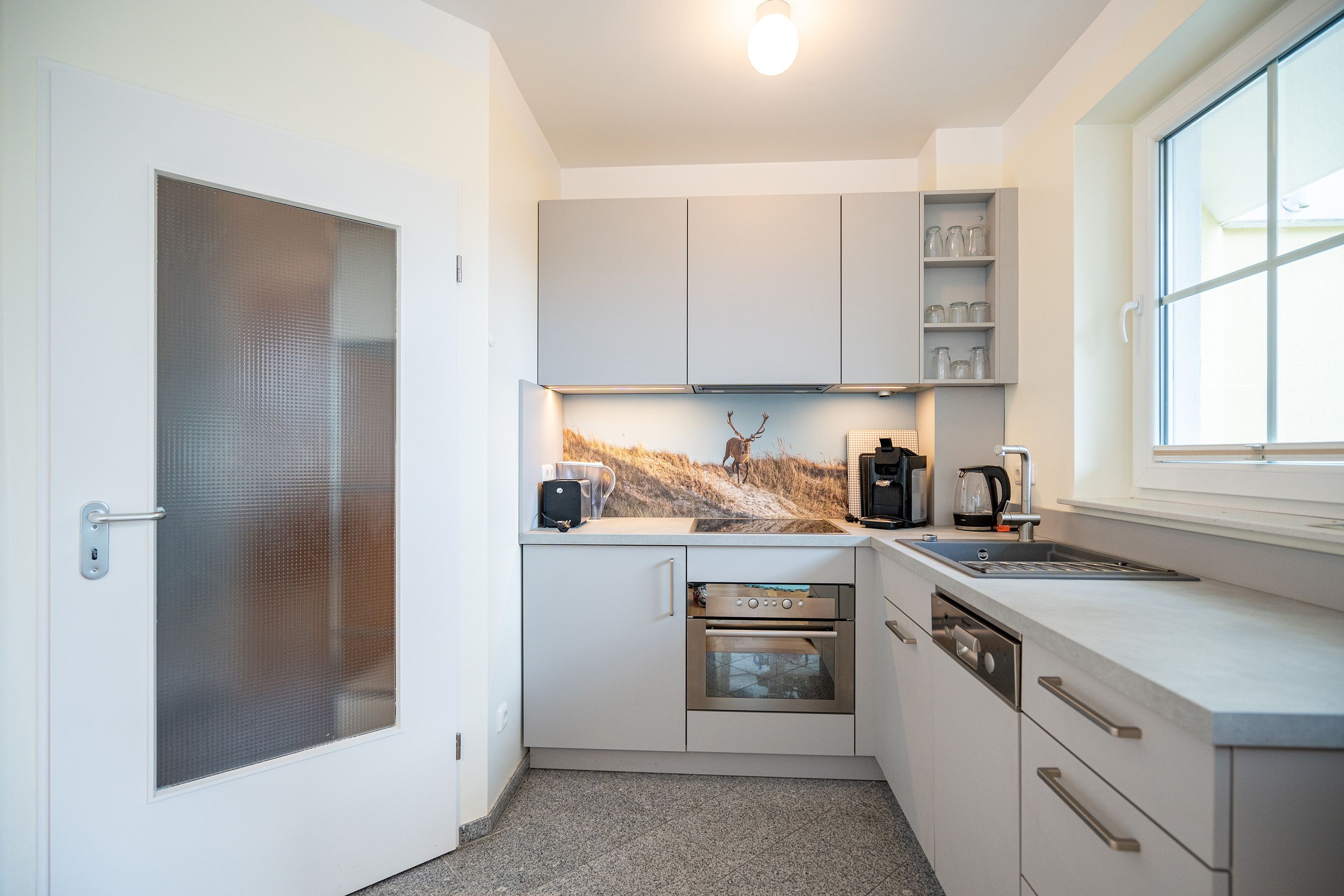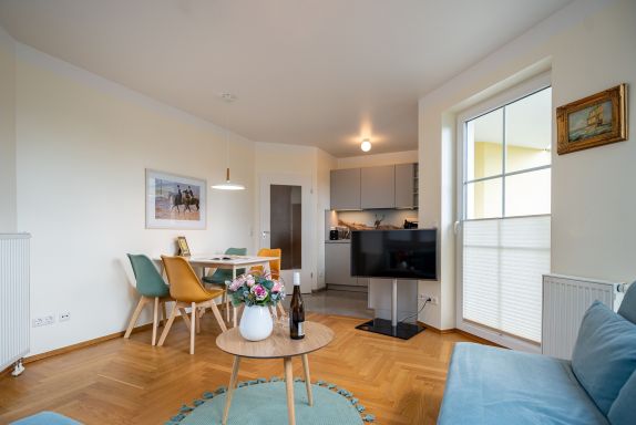 Strandurlaub beginnt da, wo der Strand nur 20 Meter entfernt ist. Im Appartement A03 in der Dünenresidenz Bansin trifft genau das zu. Das 3-Zimmer-Appartement im Erdgeschoss bietet auf 56 Quadratmetern Platz für bis zu 4 Strandurlauber. Über den kleinen Erker im Wohn-Essbereich mit seinen bodentiefen Fenstern und dem kleinen Balkon (4qm, Südausrichtung) mit einem Tisch und zwei Stühlen gelangt die Usedomer Sonne direkt zu Ihnen ins Appartement. Eine Sitzecke mit zwei Sofas (2er und 1er) sowie ein Flat-TV sorgen für gemütliche Abende nach einem langen Strandtag. Genießen Sie das Rauschen der Ostsee auch während der Abendbrotszeit in der angrenzenden Essecke für bis zu 4 Personen. Zum Wohnbereich gehört außerdem die moderne Küche, die mit allem ausgestattet ist, was das Kochherz höher schlagen lässt. Ein wahrer Ostseetraum sind die beiden Schlafzimmer. Betten Sie sich bequem auf dem Boxspringbett (1,80m x 2,00m) oder machen Sie es sich in einem der beiden Einzelbetten (jeweils 0,90m x 2,00m) im zweiten Schlafzimmer gemütlich, falls Sie getrenntes Schlafen bevorzugen. Am Morgen haben Sie die Möglichkeit sich auf der 15 Quadratmeter großen Terrasse mit Westausrichtung zu begegnen, die aus beiden Schlafzimmern zu begehen ist. Hier wurde auch an Loungemöbel sowie einen Tisch mit zwei Stühlen gedacht, falls sie eine kleine Auszeit vom Meer benötigen. Ein Duschbad mit Waschtisch und WC rundet dieses Appartement ab. Außerdem sind bei Ihrer Anreise die Betten bereits bezogen und Handtücher liegen für Sie bereit. In der hauseigenen Tiefgarage ist ein Stellplatz für Sie reserviert. Kostenfreies WLAN zählt ebenfalls zu den Vorzügen dieses Feriendomizils.