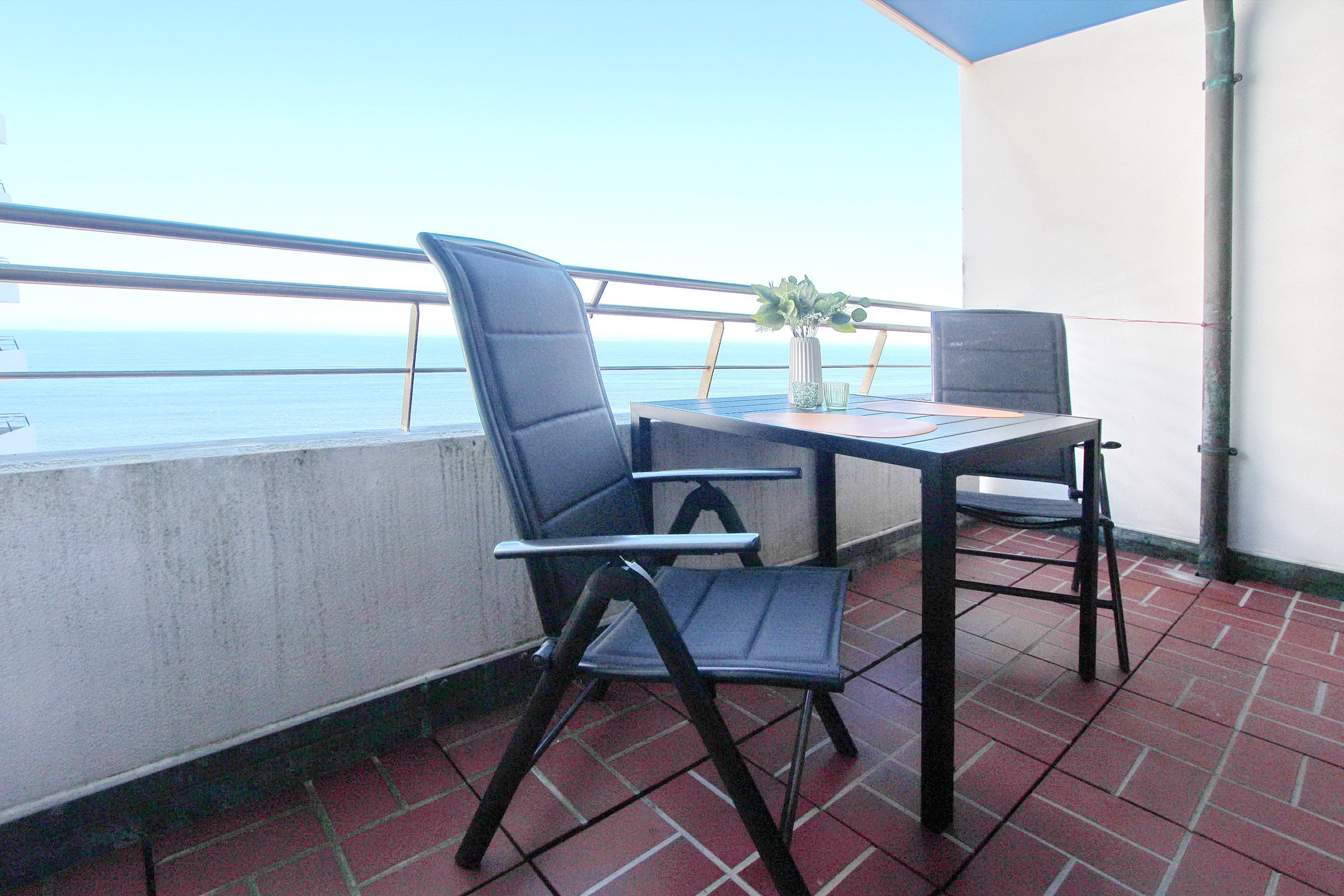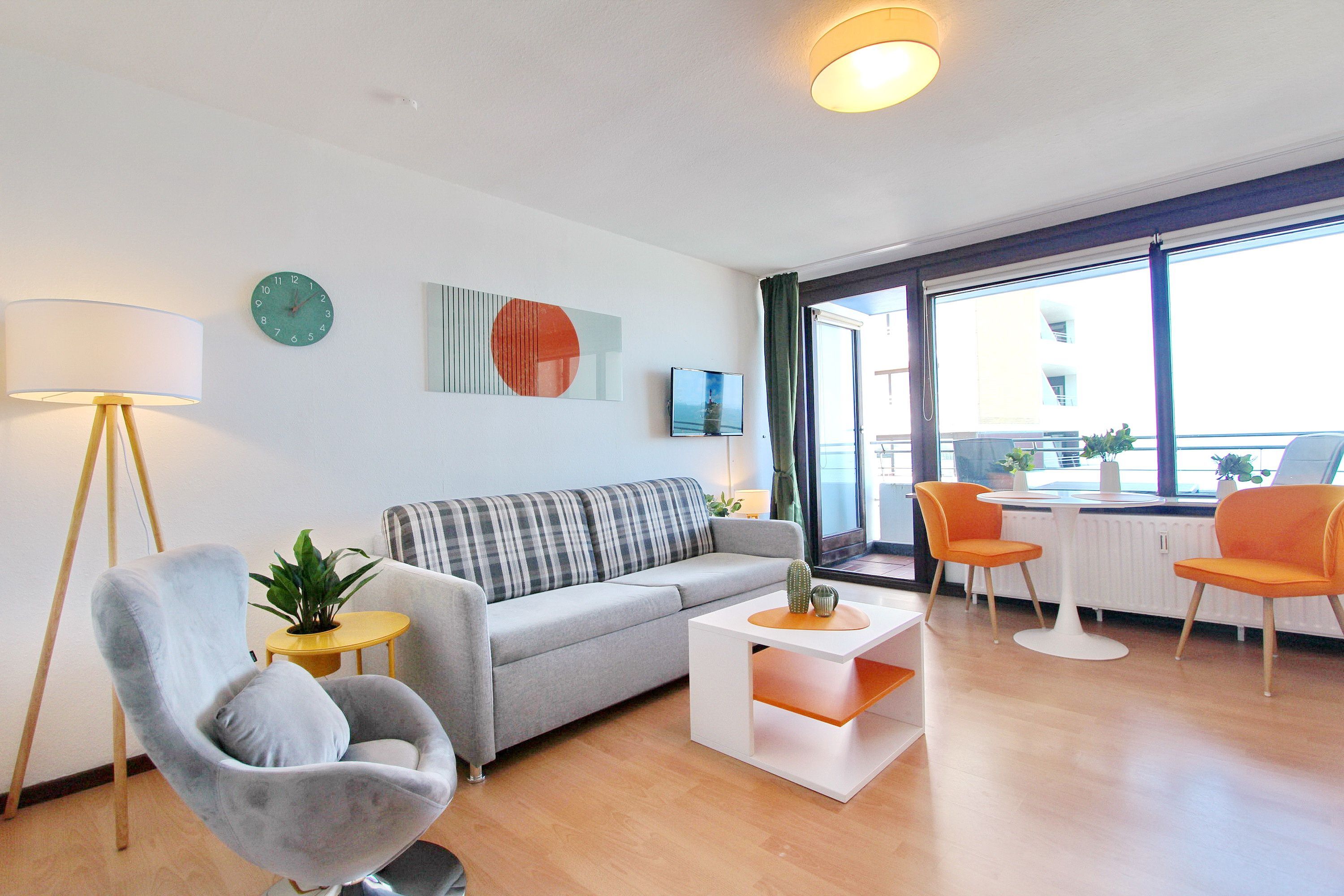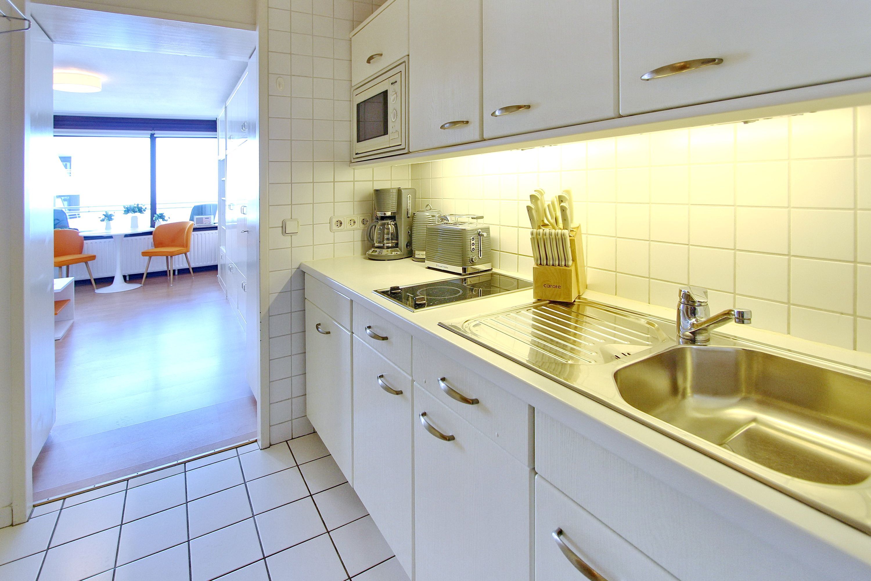 Einzimmerwohnung in der 9. Etage im Haus Sylter Welle mit einem schönen Blick auf den Strand und das Meer. Der kombinierte Wohn-/Schlafraum mit vorgelagertem Westbalkon verfügt über Einzelschrankbetten, einen Essplatz mit 2 Stühlen und eine gepolsterte Sitzbank mit Fernsehstuhl. Die Wohnung hat Laminatboden. Das Badezimmer hat eine Dusche und einen Handtuchtrockner. In der Einbauküche mit Cerankochfeld und Mikrowelle im Flur können sie sich selbst verpflegen. Zur technischen Ausstattung gehört : ein Flachbildfernseher von Panasonic (Smart TV) und ein Radio mit CD Player. Das freie WLAN Netzwerk (WEG Haus Sylter Welle - Passwortfrei - ohne Gewähr) steht ihnen kostenfrei zur Verfügung. Wohnungsgröße: ca. 34 m².
