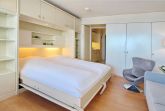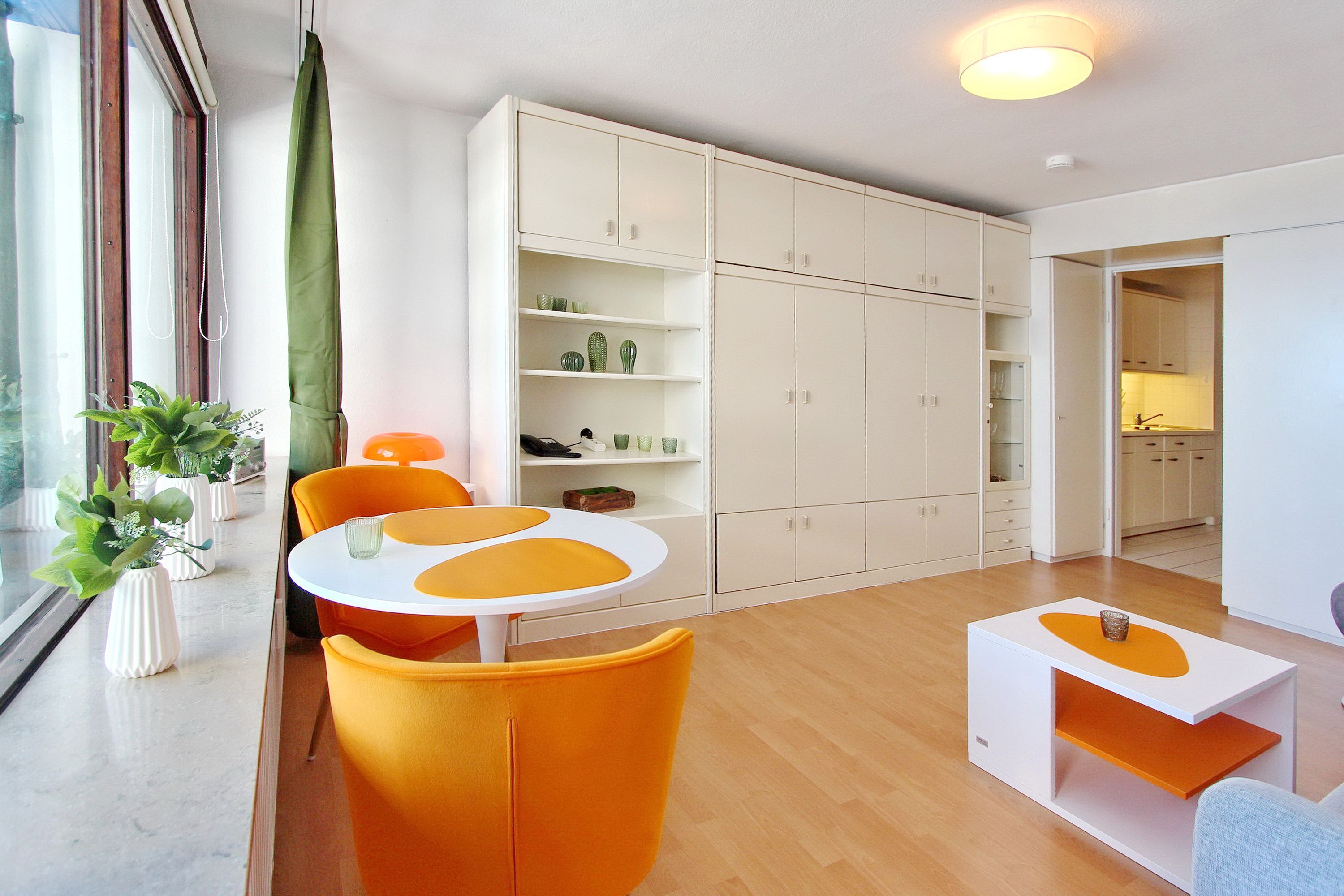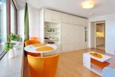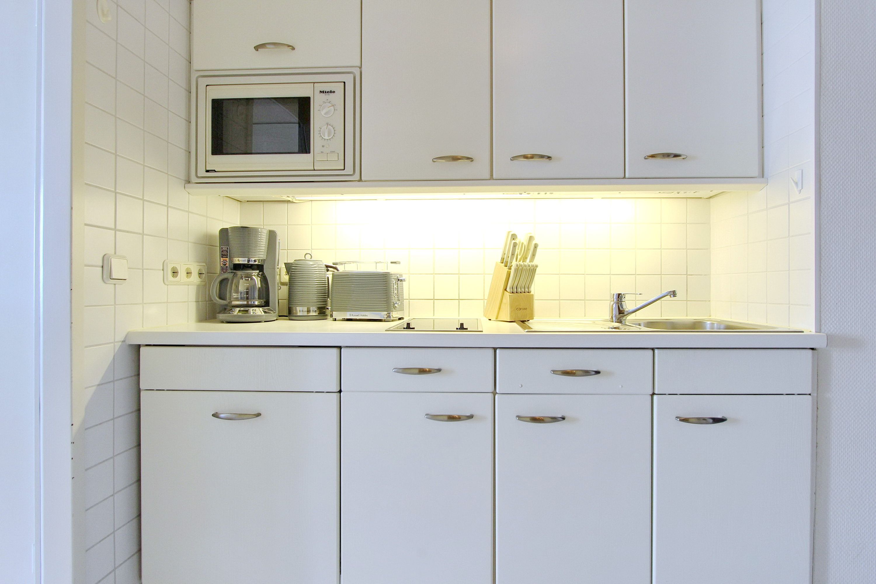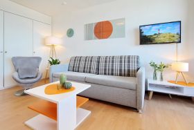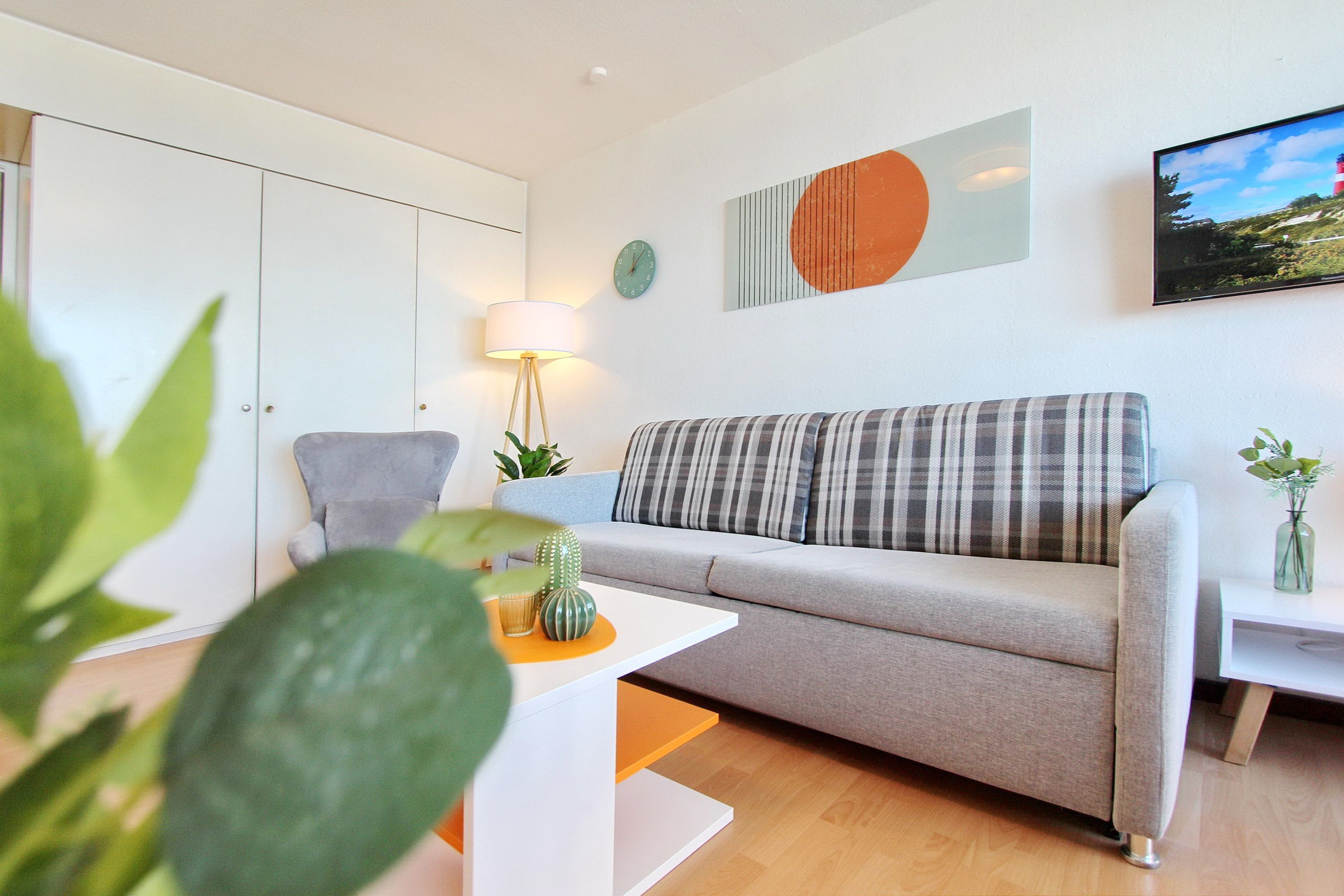 Einzimmerwohnung in der 9. Etage im Haus Sylter Welle mit einem schönen Blick auf den Strand und das Meer. Der kombinierte Wohn-/Schlafraum mit vorgelagertem Westbalkon verfügt über Einzelschrankbetten, einen Essplatz mit 2 Stühlen und eine gepolsterte Sitzbank mit Fernsehstuhl. Die Wohnung hat Laminatboden. Das Badezimmer hat eine Dusche und einen Handtuchtrockner. In der Einbauküche mit Cerankochfeld und Mikrowelle im Flur können sie sich selbst verpflegen. Zur technischen Ausstattung gehört : ein Flachbildfernseher von Panasonic (Smart TV) und ein Radio mit CD Player. Das freie WLAN Netzwerk (WEG Haus Sylter Welle - Passwortfrei - ohne Gewähr) steht ihnen kostenfrei zur Verfügung. Wohnungsgröße: ca. 34 m².