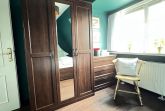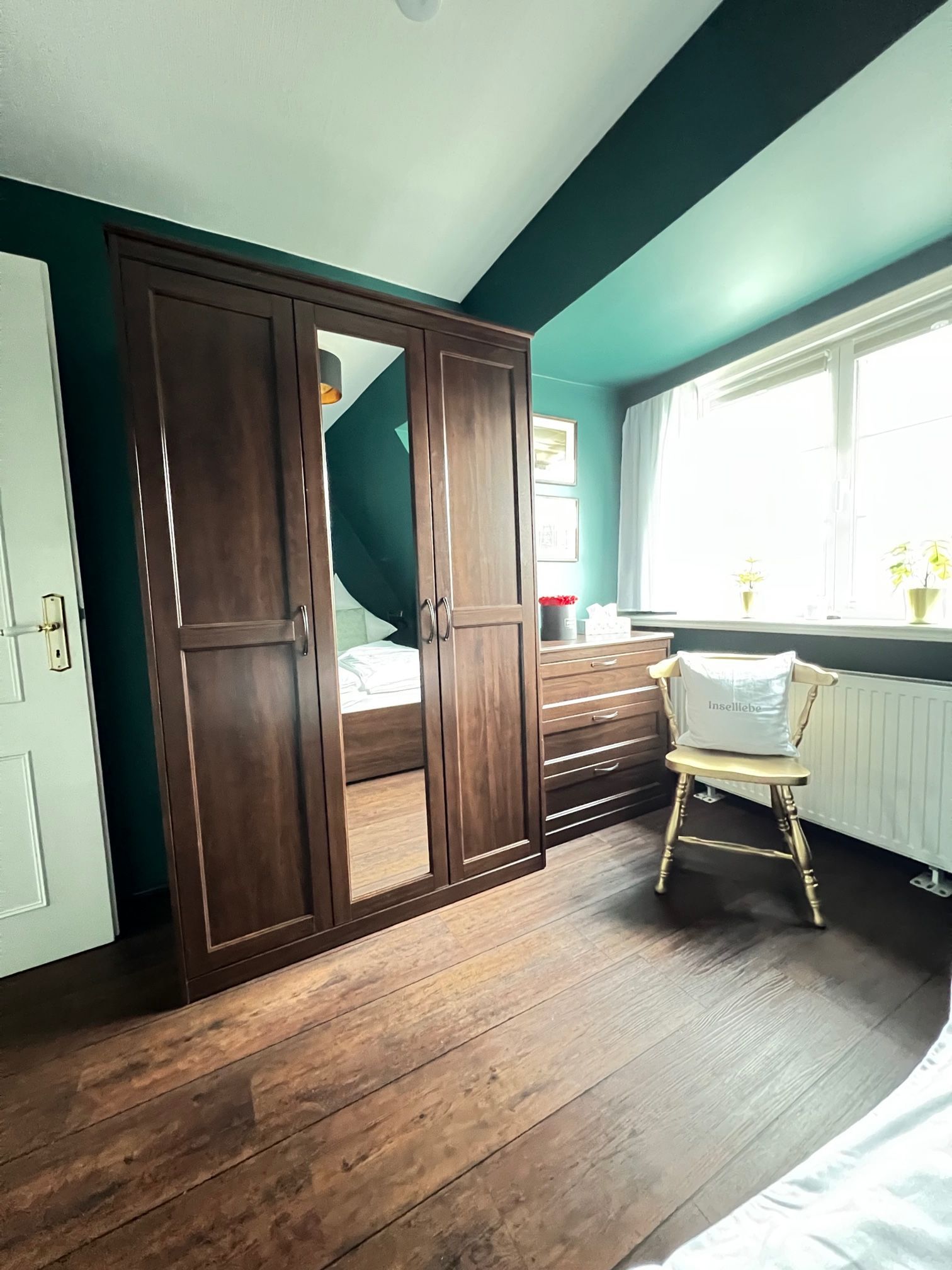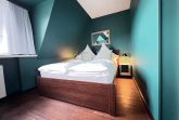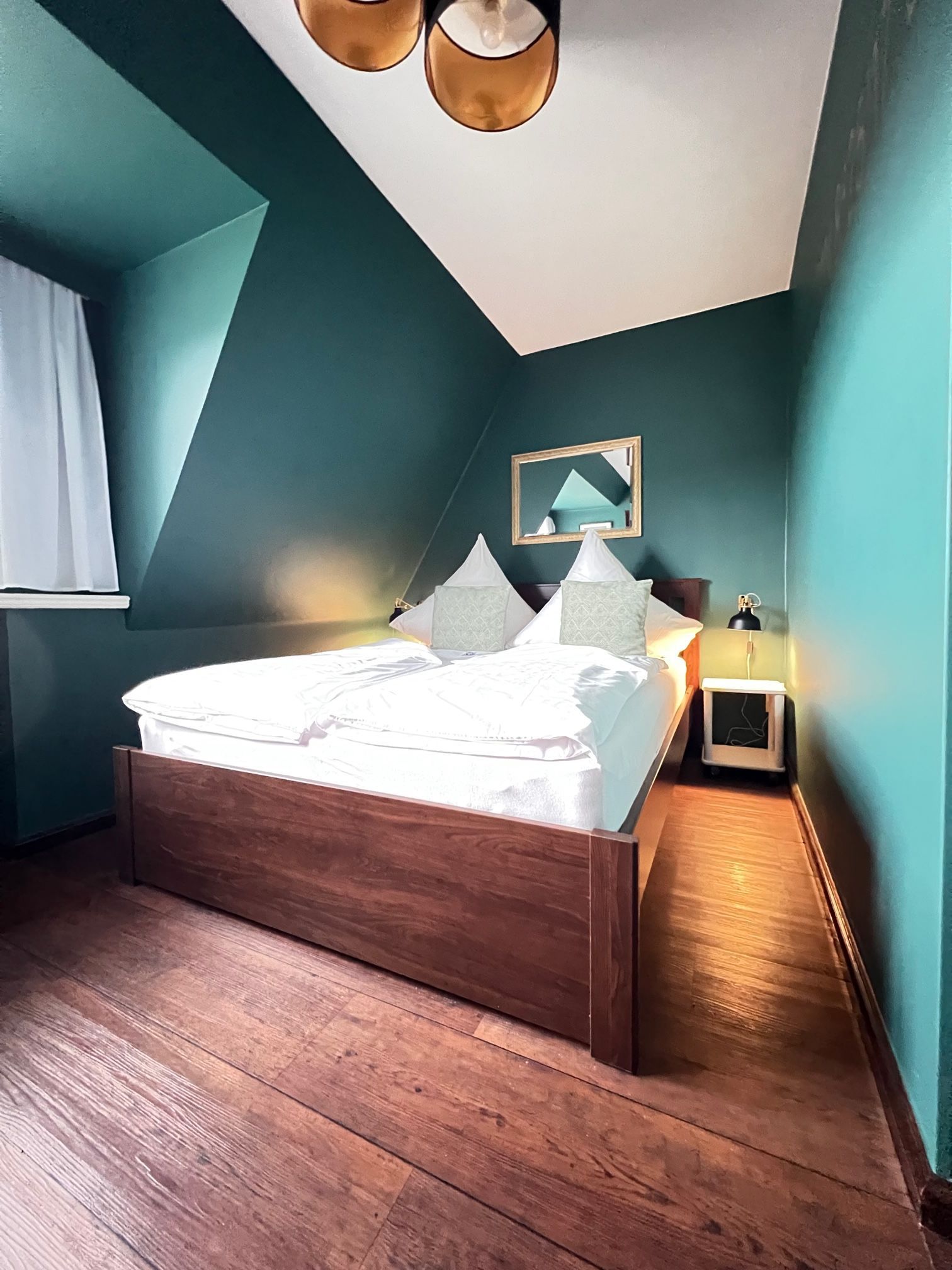 Personen ausgelegt. Die in Pastellfarben gehaltenen Wandtöne und der dunkle Holzboden verleihen der