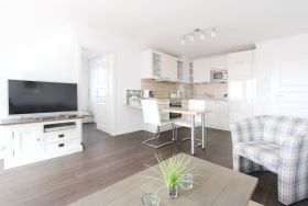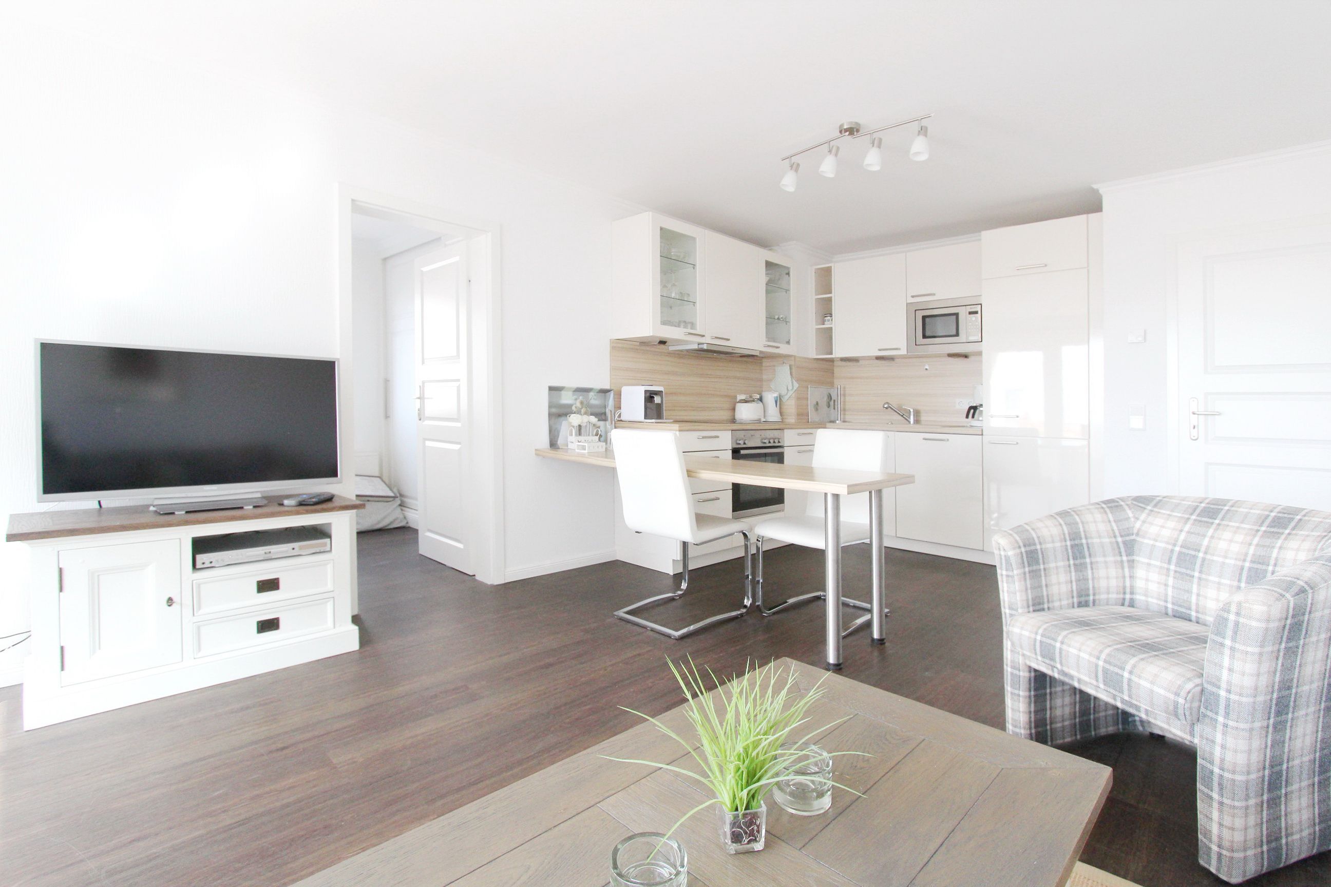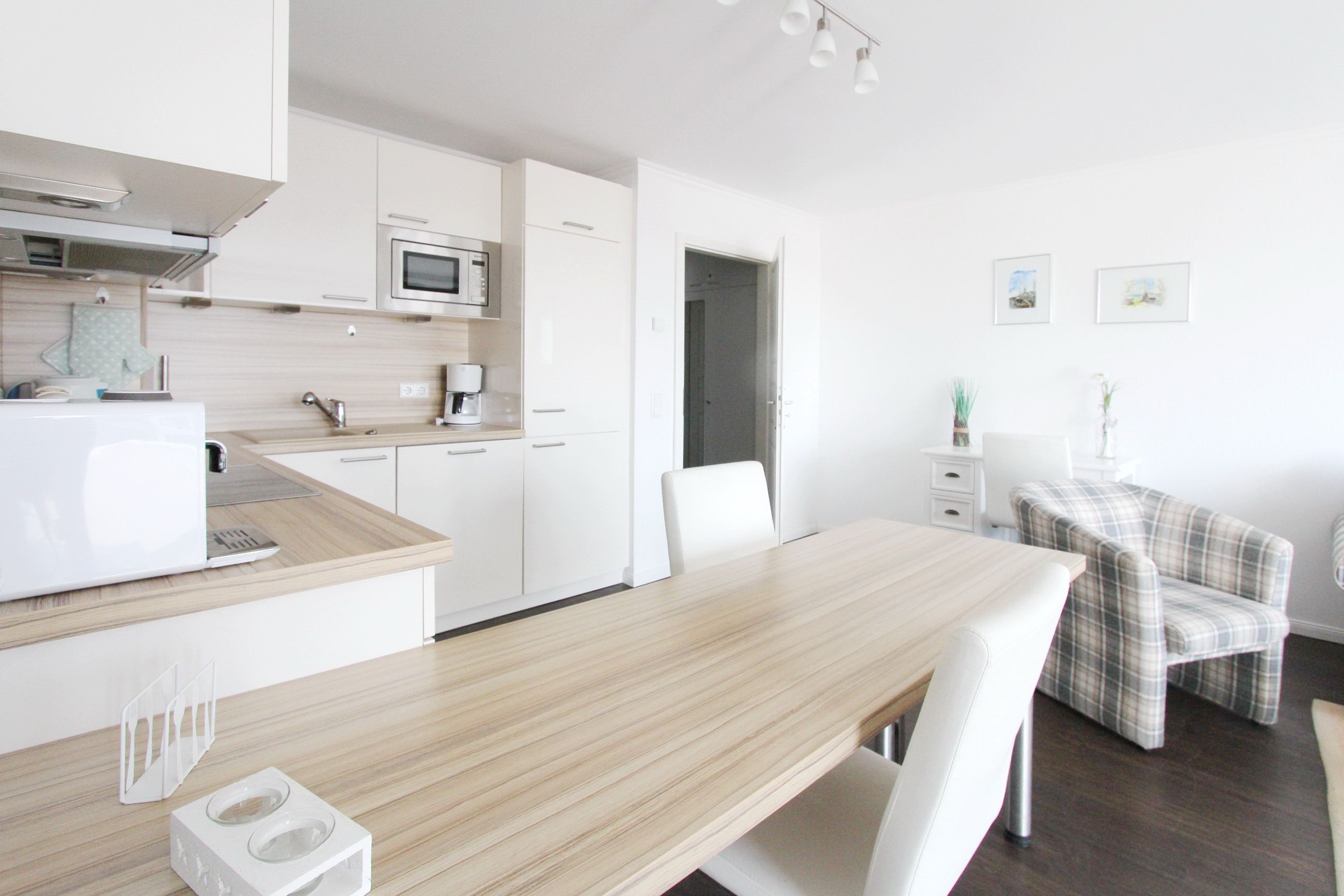 Gemütliche 2 Zimmerwohnung in der 3. Etage im Haus Westerhörn im Beach House Stil wenige Schritte vom Strand entfernt. Hell und freundlich eingerichteter Wohnraum mit vorgelagertem Westbalkon, kleines Meerblickchen inklusive. In der Wohnung steht ihnen eine große Couch und ein Fernsehsessel zur Verfügung, sowie ein Schreibtisch zum erledigen ihrer Urlaubspost und ein Essplatz mit 2 Stühlen. In der offenen Küchenbar mit Backofen, Ceranfeld, Mikrowelle, zusätzlicher Kaffeekapselmaschine und Spülmaschine können sie sich selbst verpflegen. Das separate Schlafzimmer verfügt über ein Doppelbett und einen großen Kleiderschrank mit viel Stauraum. Designfussboden in Holzoptik wurde in der ganzen Wohnung verlegt. Im hellen Badezimmer gibt es eine Dusche und einen Handtuchtrockner. Zur technischen Ausstattung der Wohnung gehört: ein Flachbildfernseher, ein DVD Player, eine IPod Station und ein Radio. Freies WLAN ist kostenfrei vorhanden (die Zugangsdaten stehen auf der Telekom Speedbox). Wohnungsgröße: ca. 45 m².