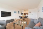 zwei Sesseln und TV. Hier kann man auch bei friesischem Nieselwetter den unvergleichlichen Meerblick durch die bodentiefen Fenster geniessen.