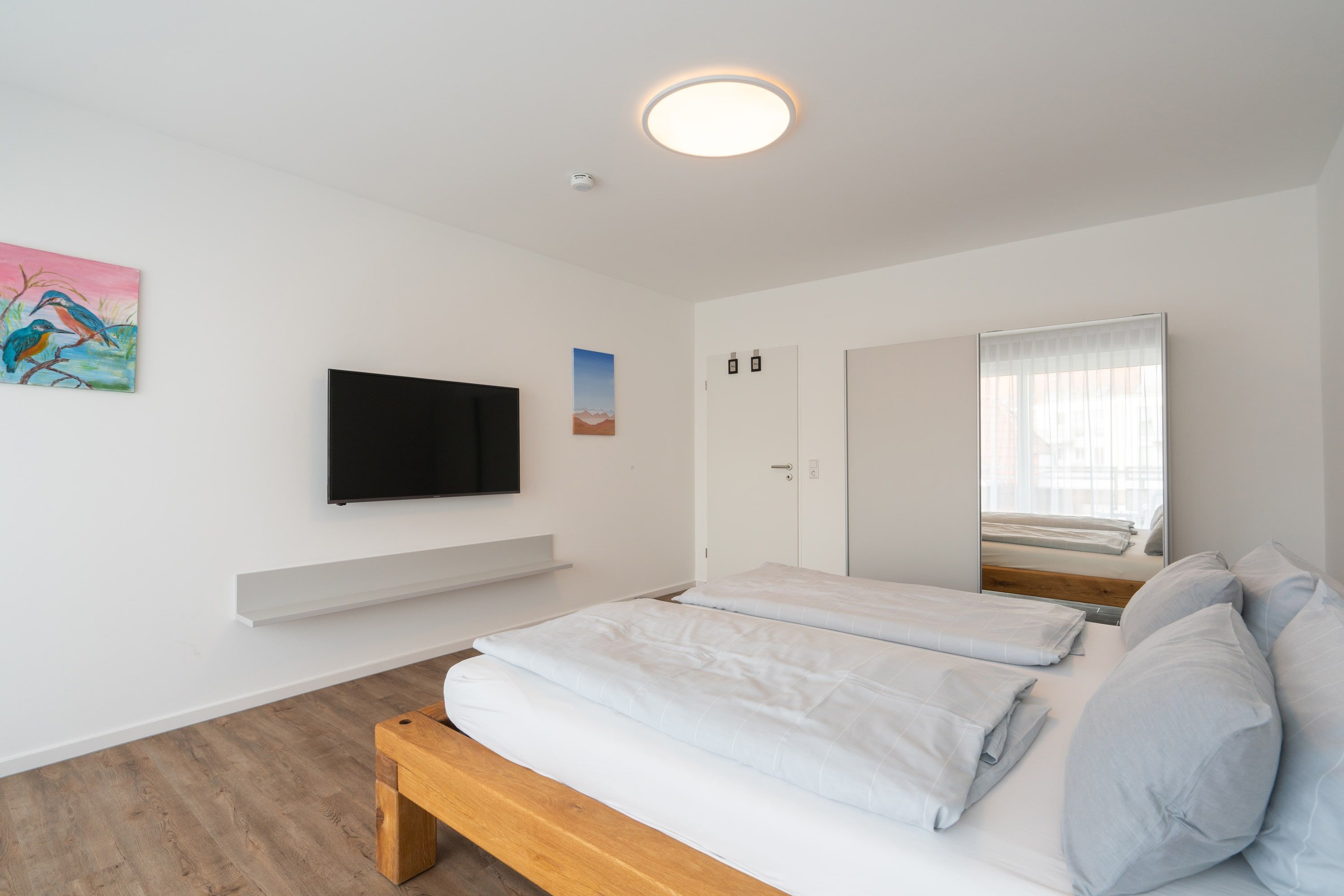 Im separaten Schlafzimmer gibt es neben dem gemütlichen Doppelbett (180cm Breite) reichlich Stauraum und einen weiteren Fernseher.