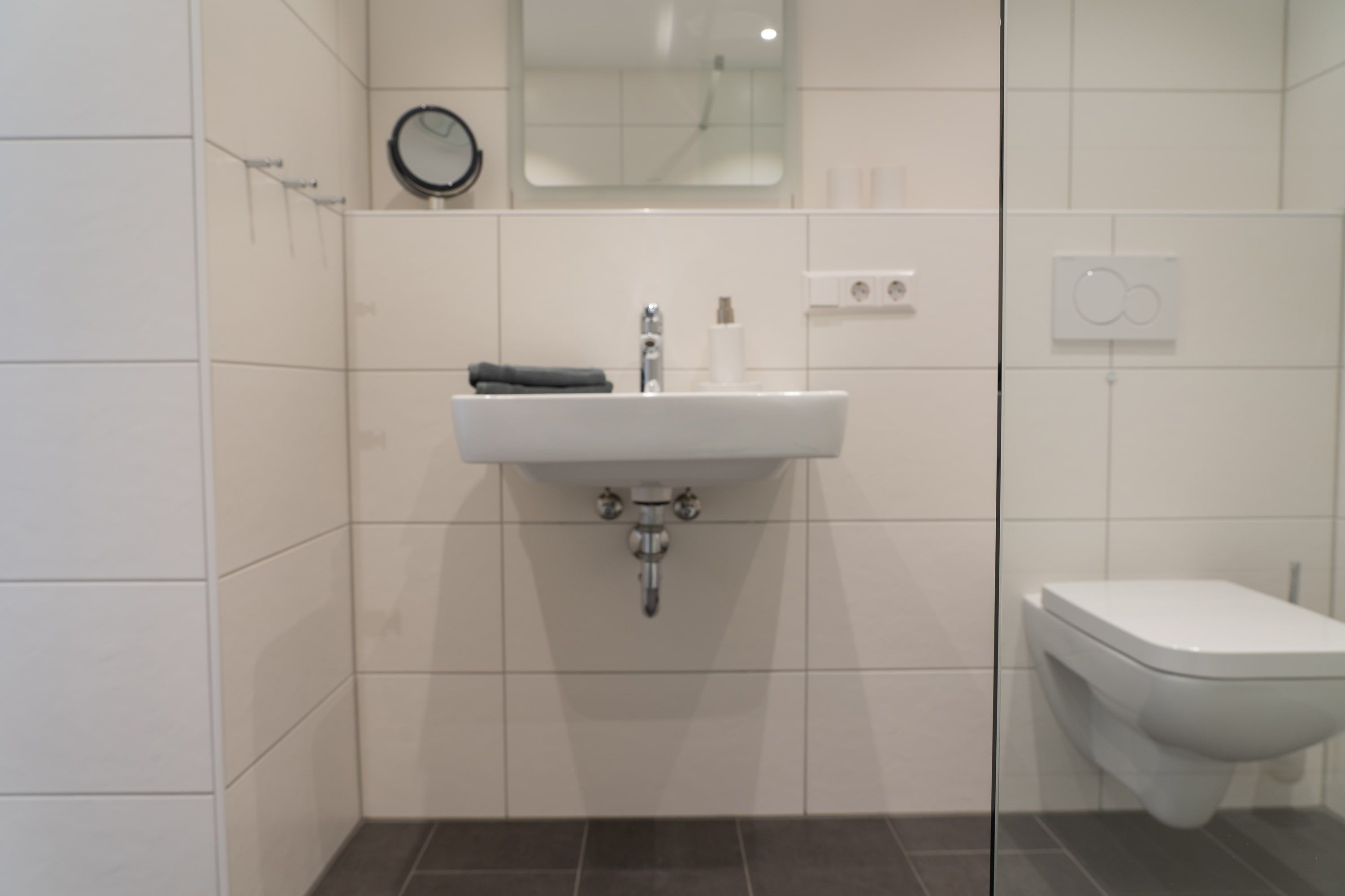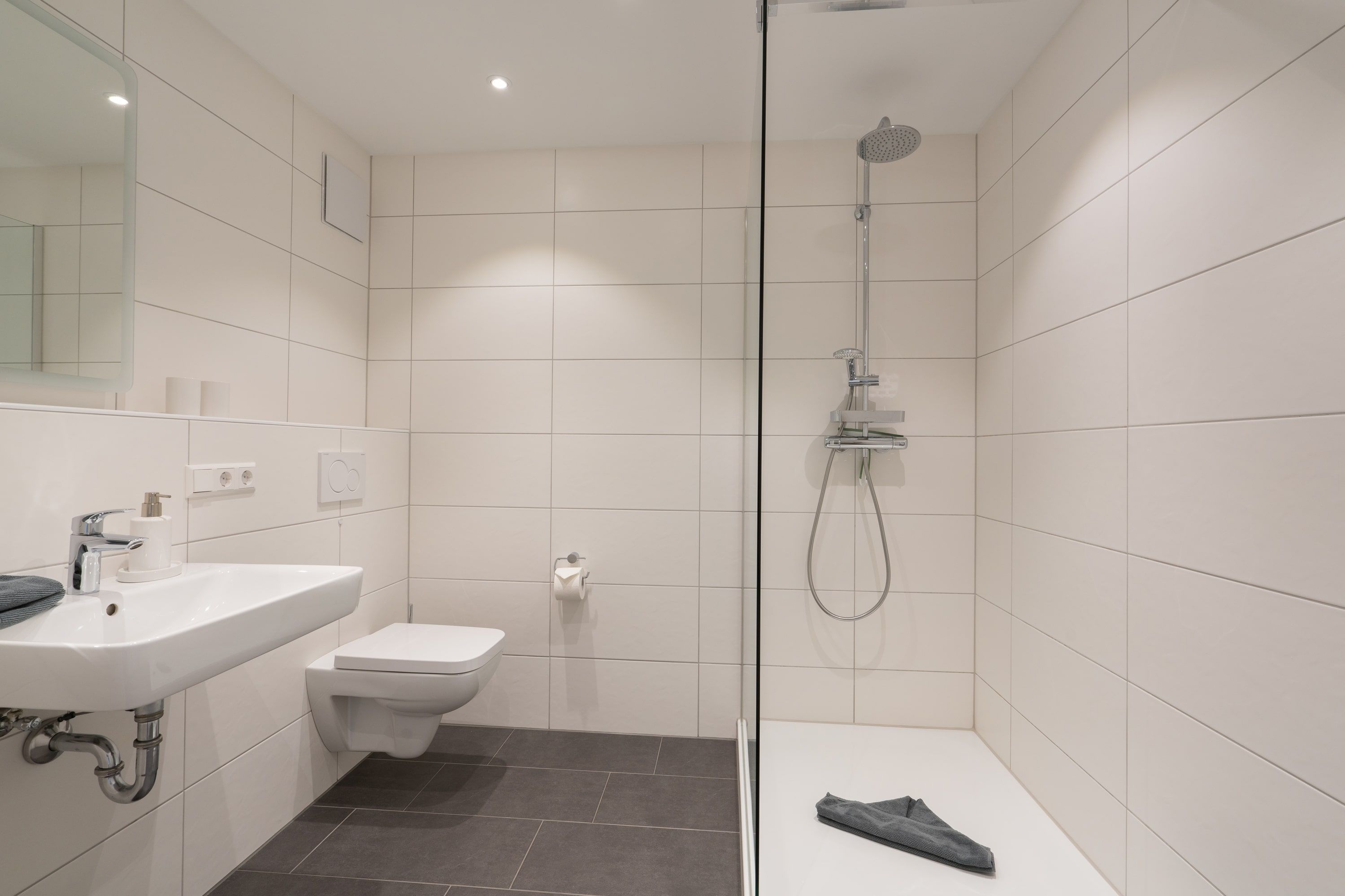 Das große, moderne Duschbad hat eine bodentiefe Dusche.