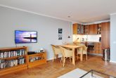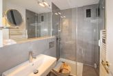 Ferienwohnung in der 5. Etage des Haus Eydum mit tollem Blick auf die Nordsee. Wenn man die Wohnung betritt steht man im Flur, im dem sich Schränke mit viel Stauraum befinden. Vom Flur geht eine Abstellkammer ab und das Badezimmer mit Dusche, Handtuchtrockner, Fön und Kosmetikspiegel. Der Einstieg der Dusche ist niedrig. Im Wohn-/Esszimmer gibt es eine bequeme Couch, 2 Korbstühle und ein Sideboard, zum offenen Küchenbereich gibt es einen Tisch mit 2 Stühlen. Um sich selbst zu verpflegen ist die Küche voll ausgestattet und verfügt über einen Geschirrspüler, ein 4 Platten Ceranfeld und einen großen Kühlschrank mit Gefrierfach. Selbst ein Smoothiemaker von WMF und eine zusätzliche Nespressomaschine sind vorhanden.