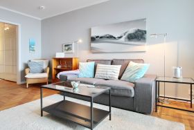 Vom Wohnbereich geht es in das kleine Schlafzimmer mit Fenster. Es steht ein Doppelbett drin, dass nur von einer Seite begehbar ist. Vom Wohnbereich kann man auf den Balkon gehen. Sie sitzen dort auf Rattanmöbeln (3 Stühlen und ein Tisch). Zur technischen Ausstattung der Wohnung gehört ein Smart Fernseher von Panasonic (mit T-Home Entertain), ein DVD Player und eine Soundbox von Bose. Das WLAN des Eigentümers können Sie kostenfrei nutzen (die Zugangsdaten finden sie auf dem Router in der Wohnung). Den kostenfreien Parkplatz Nr. 69 (hinter dem Haus, rechte Seite, 5. Stellplatz von unten gezählt) können Sie gerne nutzen. Eine große Auswahl an Büchern und DVDs steht Ihnen in dieser Nichtraucherwohnung zur Verfügung. Die Wohnungsgröße ist ca. 45 m².
