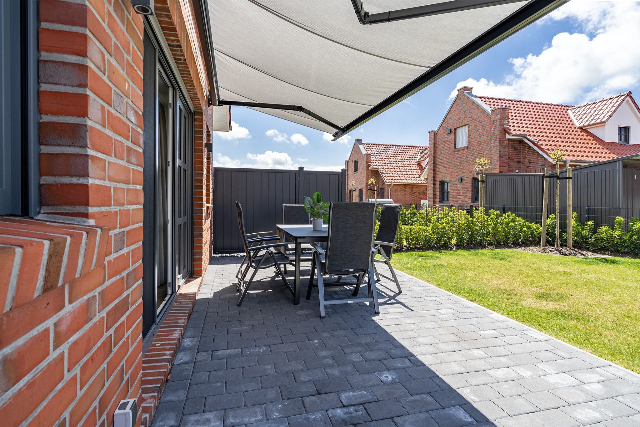 Auch Hunde sind hier herzlich Willkommen und werden den voll eingezäunten Garten sicher zu schätzen wissen, während Ihre Herrchen die geräumige Terrasse mit elektrischer Markise genießen. Zum Haus gehört neben dem PKW-Stellplatz auch ein Abstellraum mit Lademöglichkeit für E-Bikes.