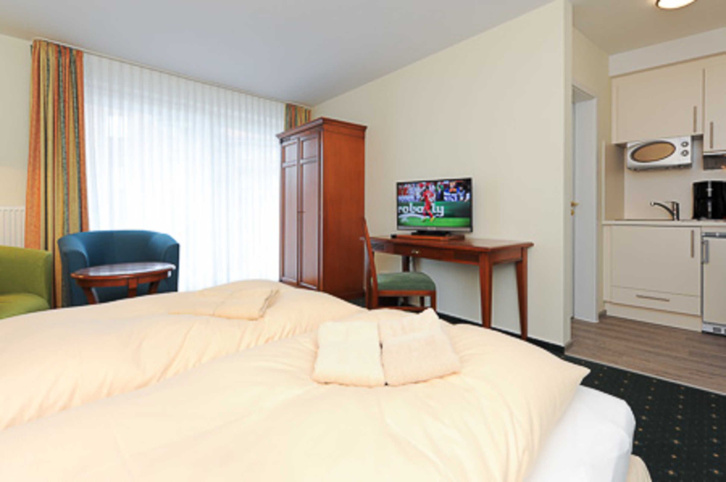 Jedes Apartment ist ca. 45 oder 30 qm groß und verfügt über ein Doppelbett, ein eigenes modernes großes Badezimmer mit Dusche, Waschtisch und WC sowie über einen eigenen Balkon. Die Apartments verfügen über einen vollwertigen Küchenbereich. Unsere Gäste parken auf reservierten Parkplätzen oder gegen einen kleinen Aufpreis in der Tiefgarage und gelangen mit dem Aufzug in das Erdgeschoss. Treppen steigen ist also nicht nötig.
