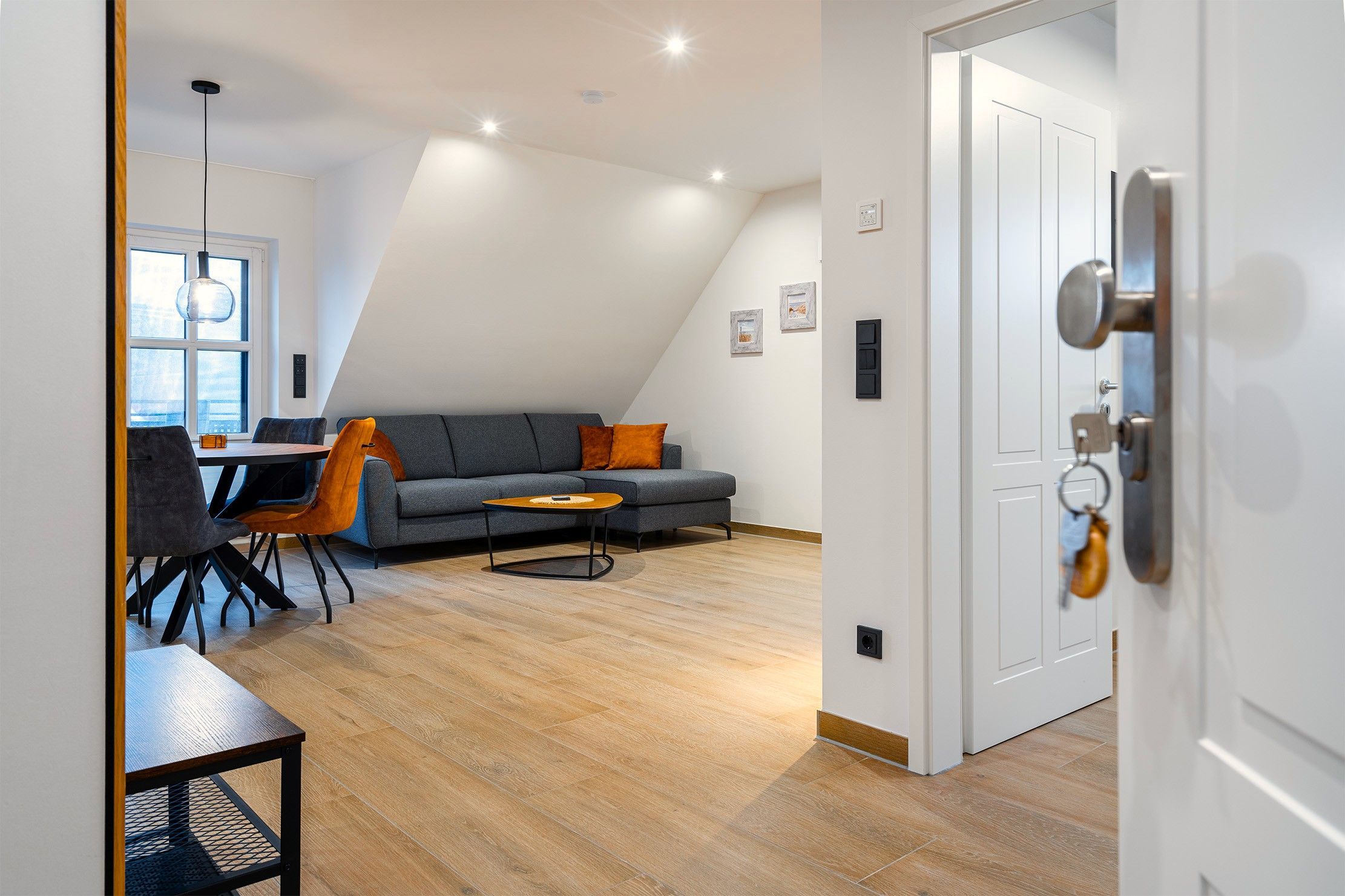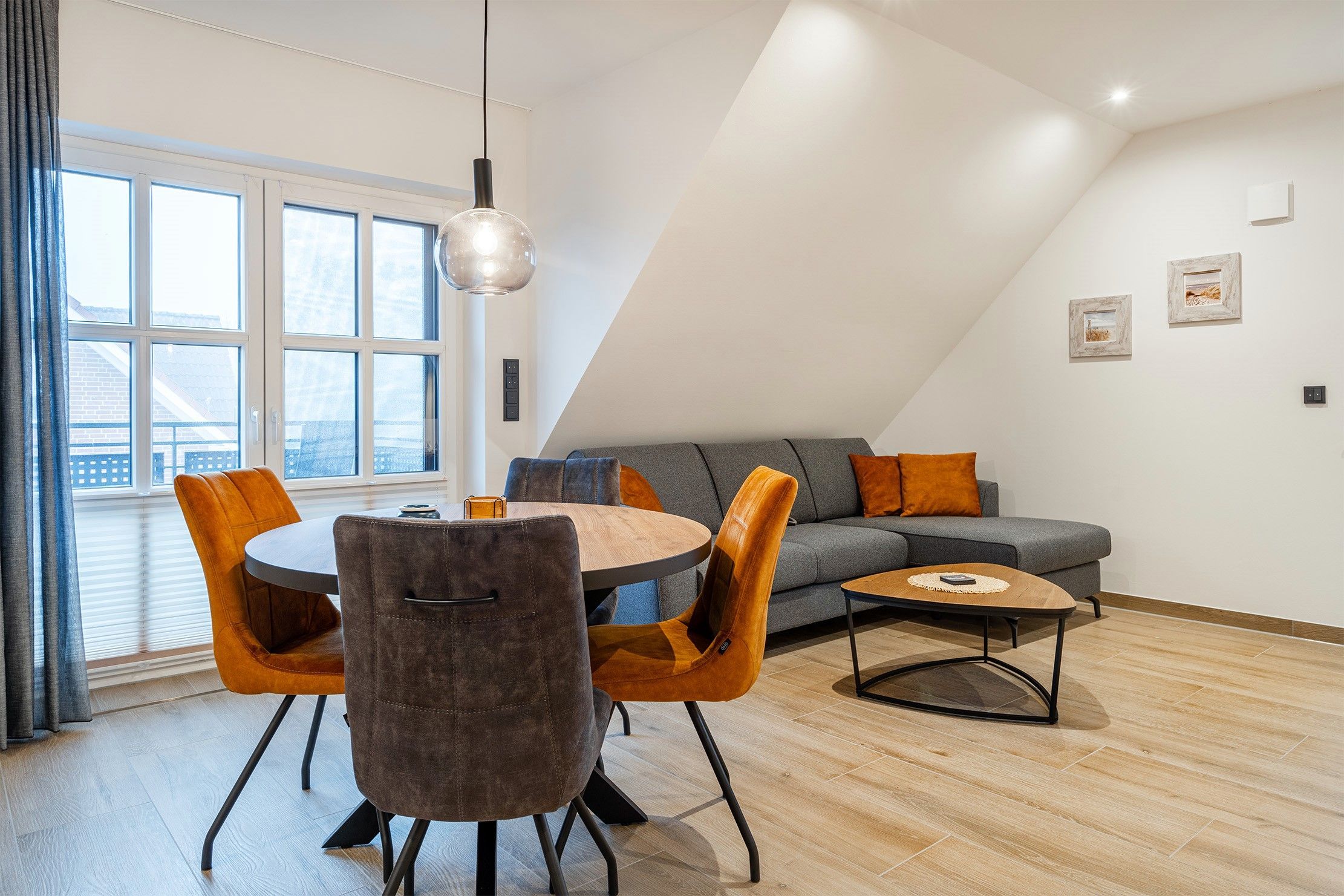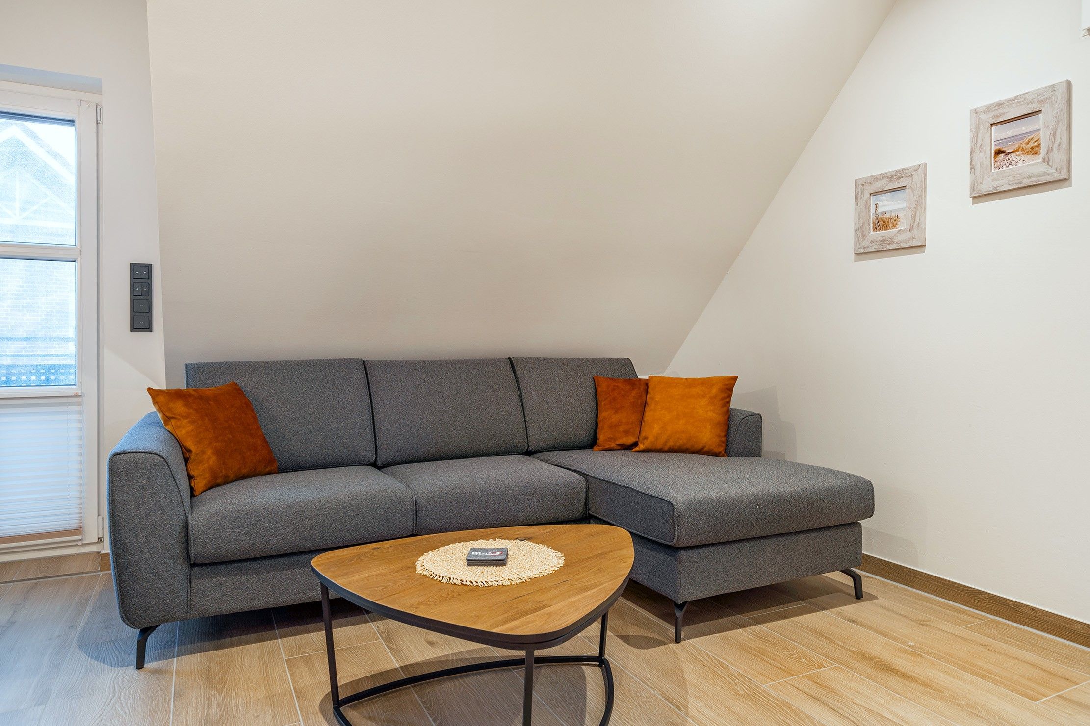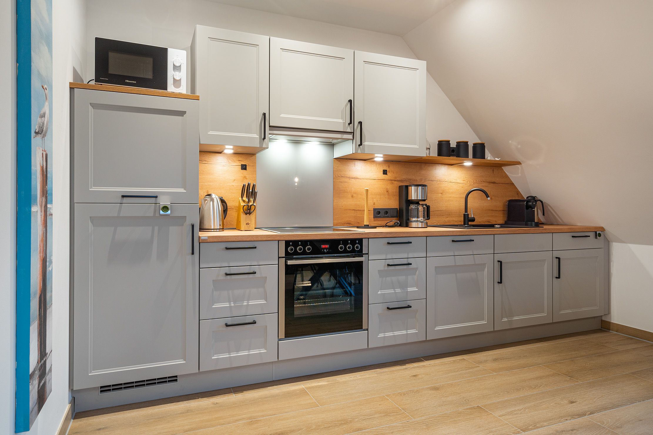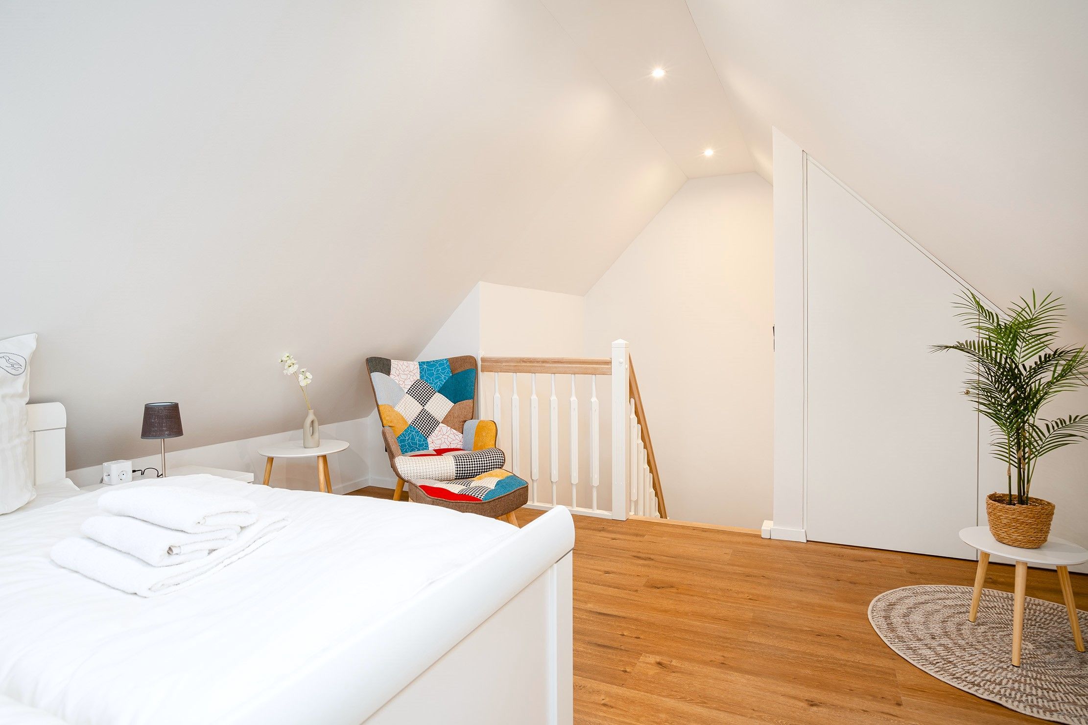 Unsere neue, charmante Obergeschosswohnung Möwenkoje bietet auf 65qm den idealen Rückzugsort für Ihren Greetsiel Urlaub. Der offene Wohnbereich besticht durch seine einladende Atmosphäre und hochwertige Einbauküche, die perfekt in den Raum integriert ist und keine Wünsche offen lässt. Neben einem gemütlichen Schlafzimmer, das erholsame Nächte verspricht, verfügt die Wohnung außerdem über ein helles Tageslichtbad mit einer ebenerdigen Dusche und einen kleinen Abstellraum. Der ausgebaute Spitzboden, der offen als Galerie gestaltet ist, bietet mit dem Lesesessel nicht nur einen gemütlichen Rückzugsort für entspannte Stunden sondern außerdem ein weiteres Doppelbett, sodass insgesamt vier Personen untergebracht werden können (zwei Einzelbetten, die mit Verbindung zum Doppelbett verbunden sind). Ein weiteres Highlight ist der Balkon, auf dem Sie die frische Nordseeluft genießen und den Blick schweifen lassen können. Ein Abstellraum für Ihre Fahrräder sowie ein PKW Stellplatz stehen Ihnen selbstverständlich zur Verfügung.