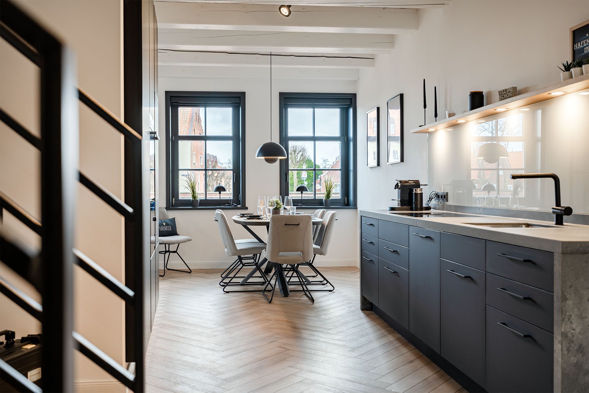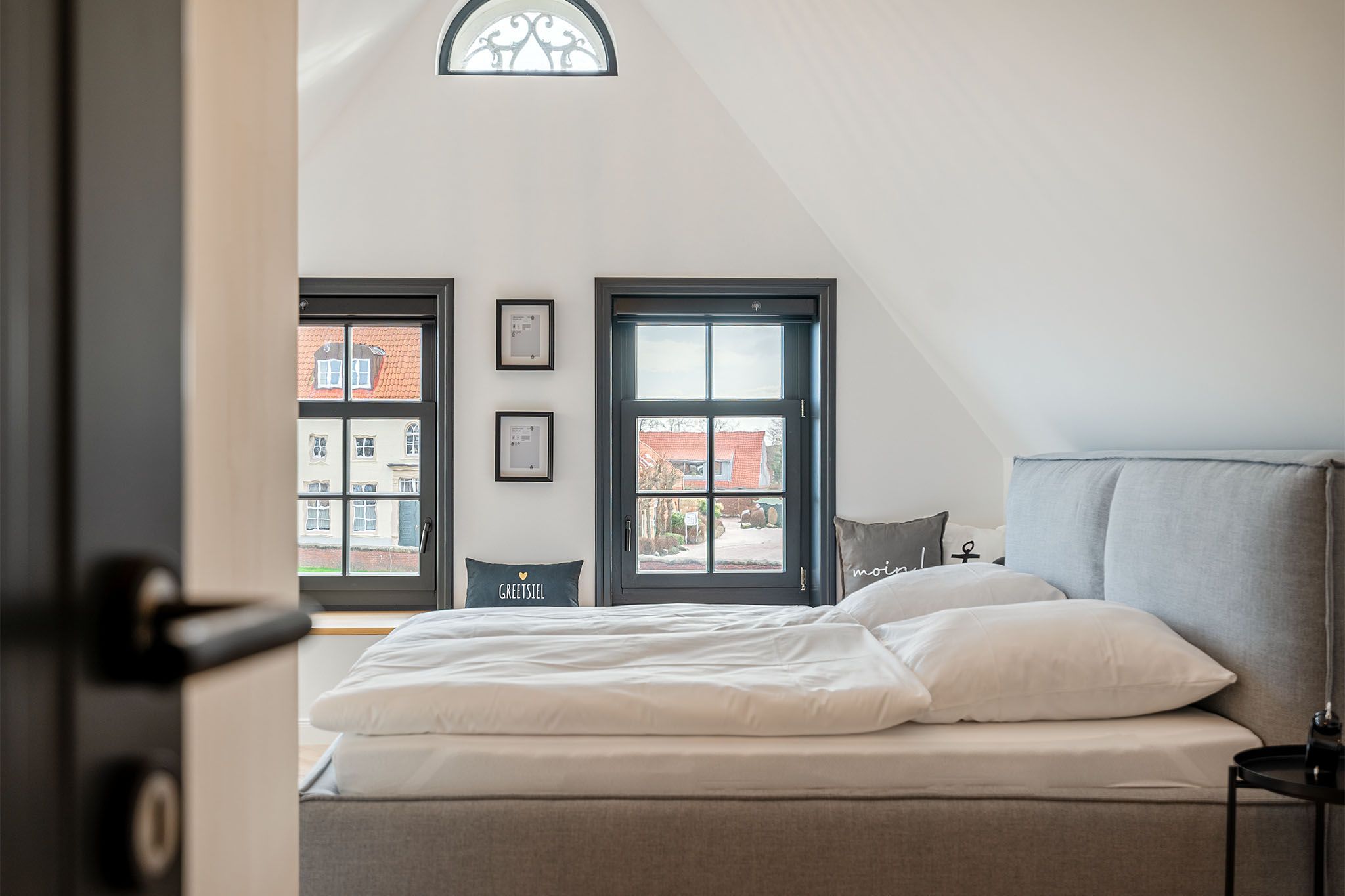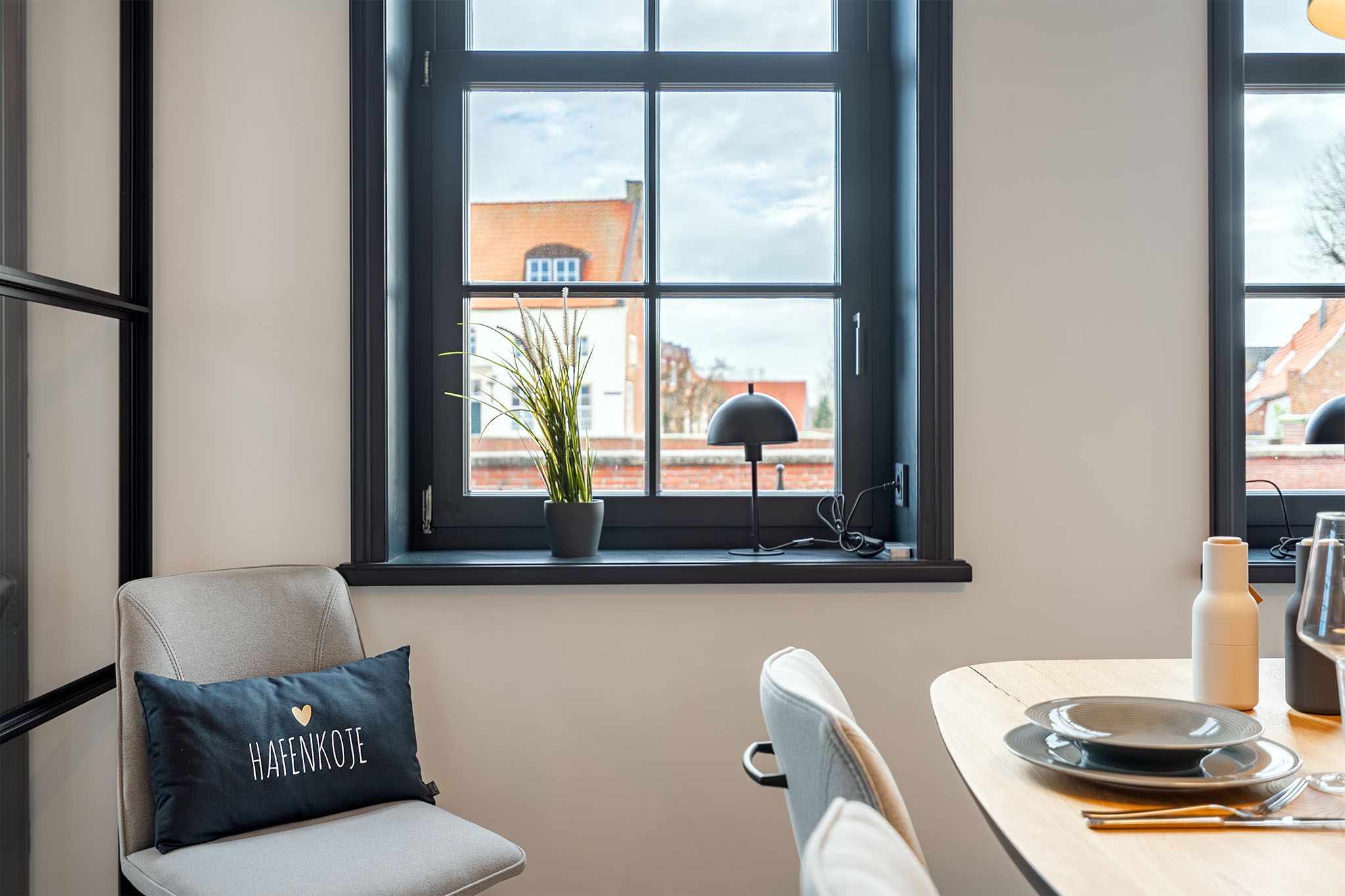 Luxus mitten im Greetsieler Hafen! Das bekannte Glockengiebel-Haus aus dem Jahre 1792 ist Teil der historischen Häuserzeile. Liebevoll und mit hochwertigsten Materialen 2021 komplett renoviert erstrahlt es heute in ganz neuem, modernen Glanz. Zwei Schlafzimmer, eine offene Küche, zwei Bäder und ein Gäste WC bieten exklusiven Komfort für maximal vier Gäste. Nicht nur die Lage, sondern auch die aufwändig restaurierten Details wie der Blick durch einen Glasfußboden in den historischen Keller, das alte Türschloss mit übergroßem Buntbart-Schlüssel oder das Cabrio-Fenster mit direktem Blick auf die Krabbenkutter machen dieses Objekt einzigartig. Zudem bietet Ihnen die private Terrasse Ihren ganz persönlichen Rückzugsort. Selbstverständlich steht Ihnen auch ein Parkplatz zur Verfügung, diesen finden Sie nur wenige hundert Meter entfernt im Ortskern. Zum Be-/Entladen können Sie selbstverständlich direkt vor die HafenKOJE fahren.