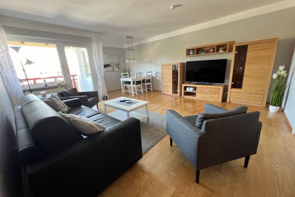 Das Appartement 41 ist ein 2-Raum-Appartement im 3. Obergeschoss für bis zu 4 Personen mit 45 qm. Der möblierte Ostbalkon bietet morgens Sonne und nachmittags Schatten.