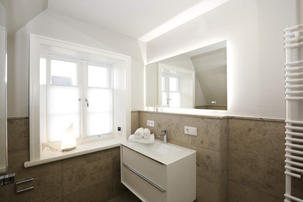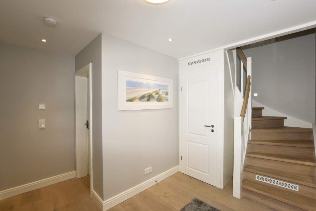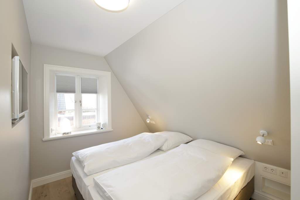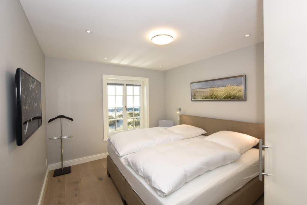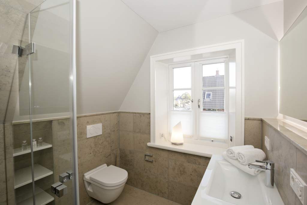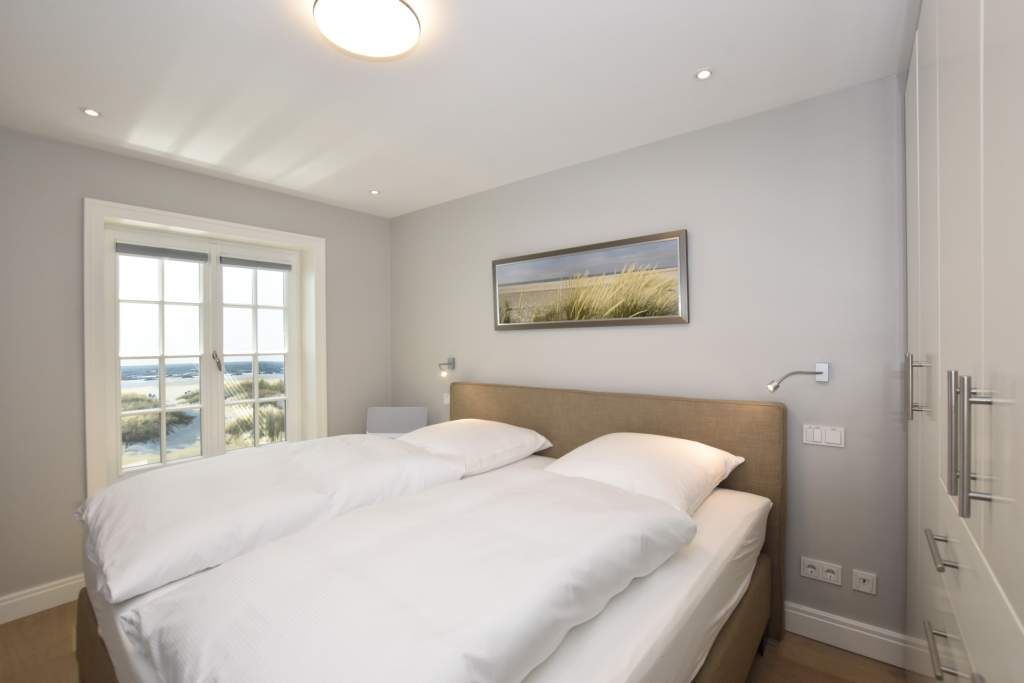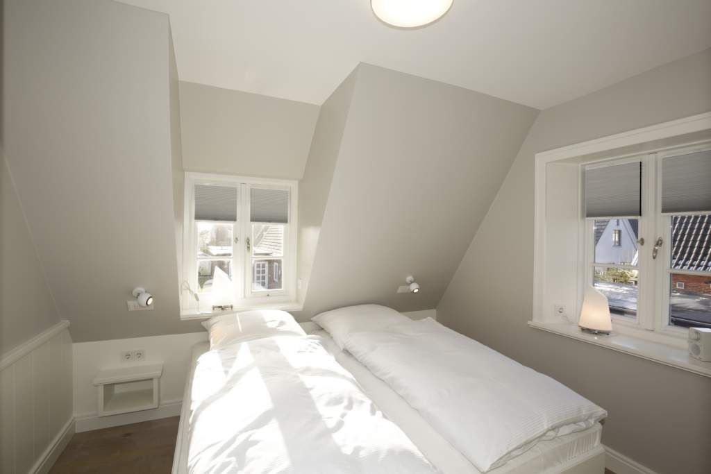 Im Obergeschoss gelangt man über den Flur mit Sekretär (mit Blick über Westerland bis hin zu den Dünen) in zwei weitere hochwertige Schlafzimmer mit Doppelbetten (1,80 x 2,00 m, Einzelmatratzen) und ein weiteres Badezimmer mit Dusche, Waschtisch, Handtuchtrockner, Fön und WC.