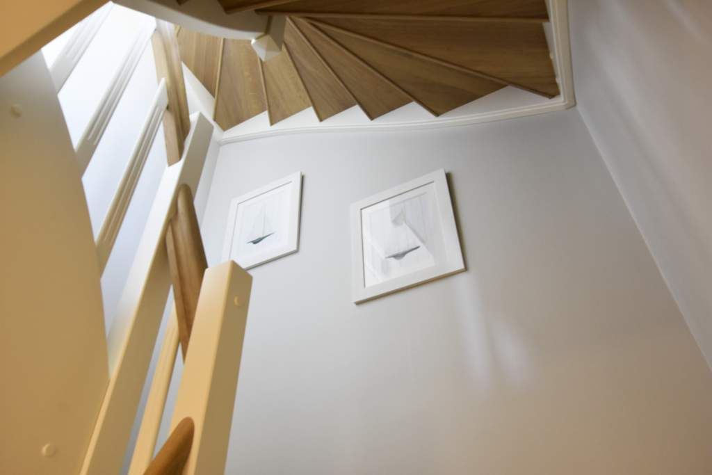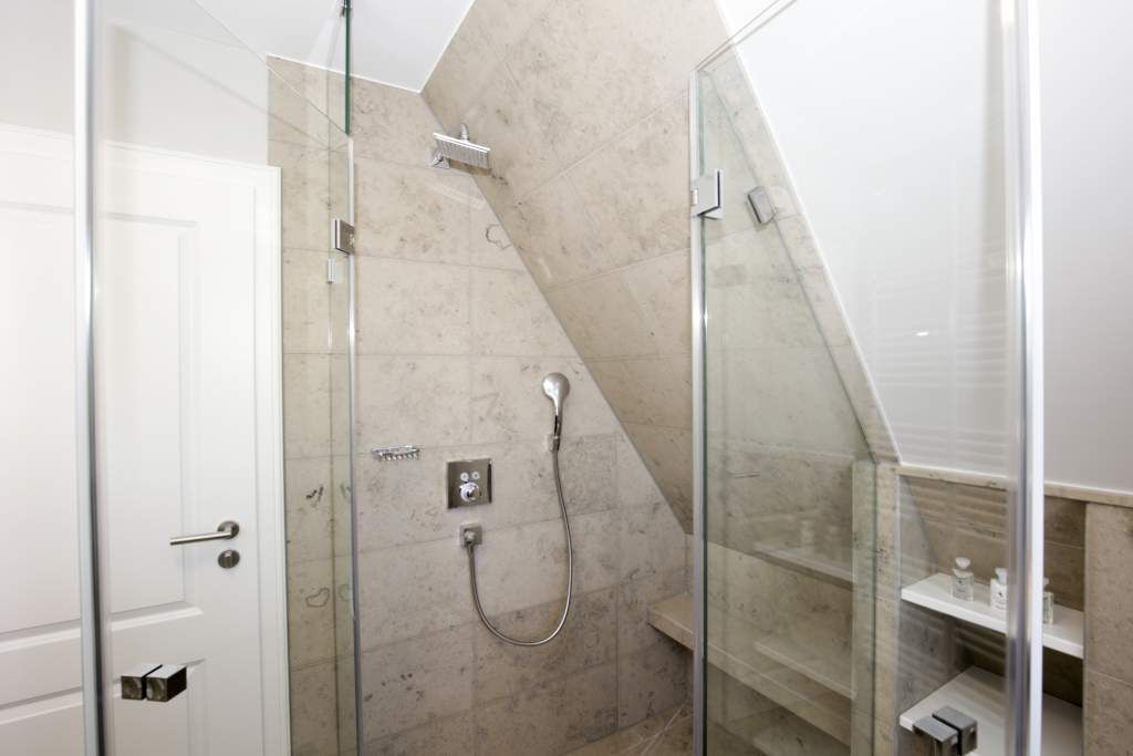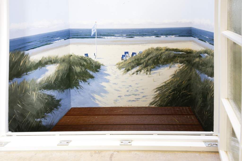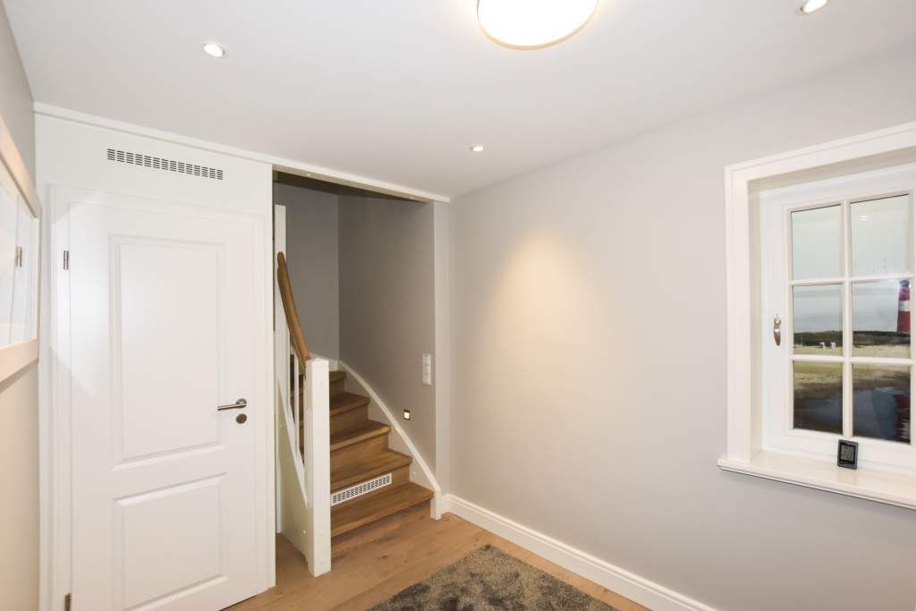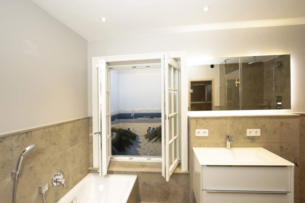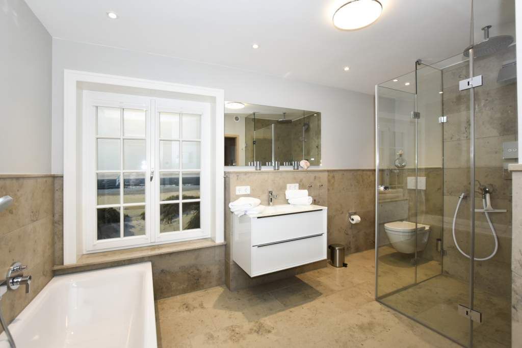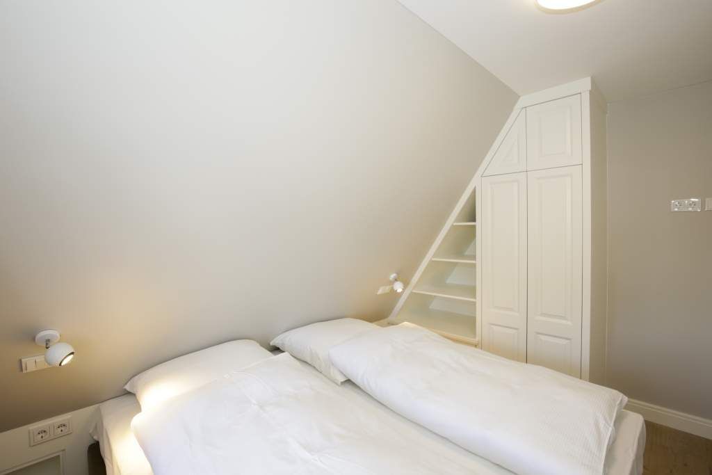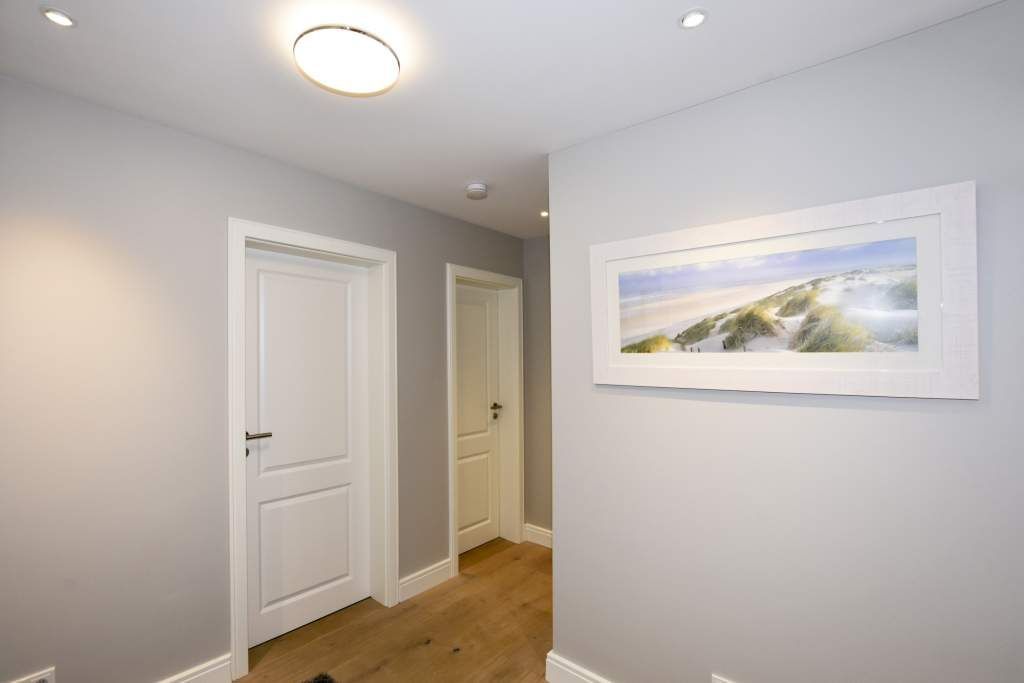 Im Obergeschoss gelangt man über den Flur mit Sekretär (mit Blick über Westerland bis hin zu den Dünen) in zwei weitere hochwertige Schlafzimmer mit Doppelbetten (1,80 x 2,00 m, Einzelmatratzen) und ein weiteres Badezimmer mit Dusche, Waschtisch, Handtuchtrockner, Fön und WC.