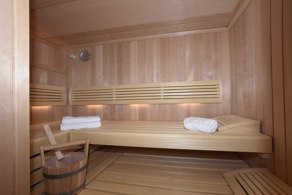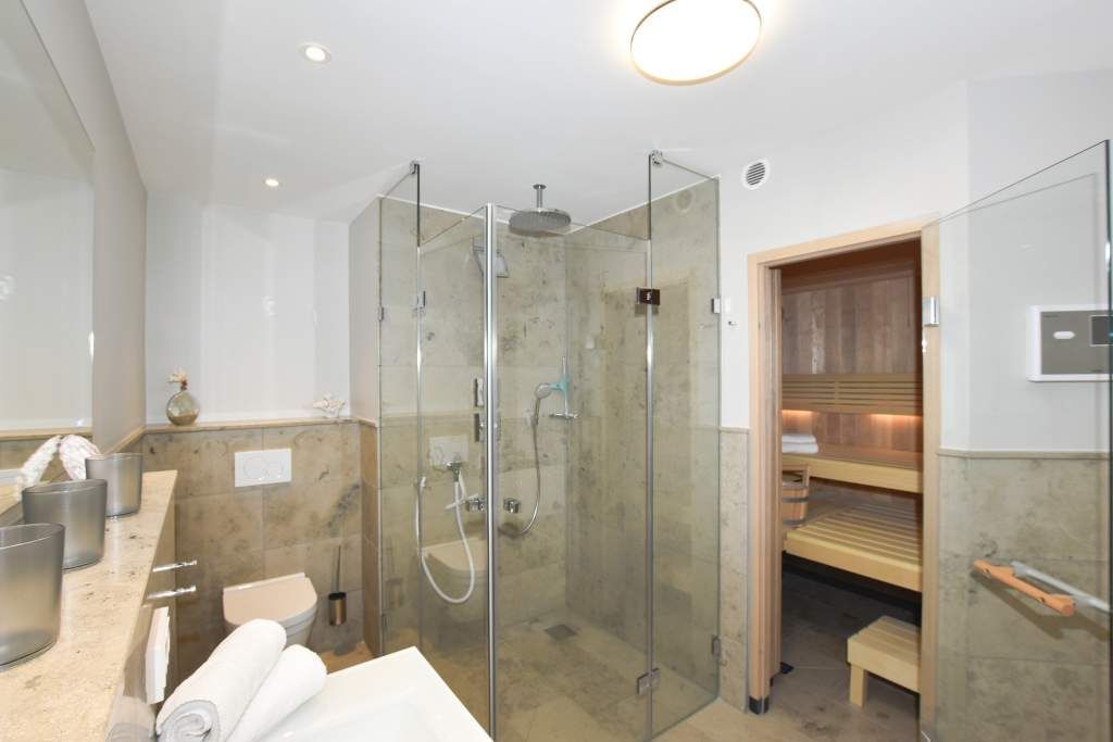 Im Untergeschoss befinden sich ein komfortables Schlafzimmer mit Doppelbett in Übergröße (2,00 x 2,00 m, Einzelmatratzen) und ein großzügiges Badezimmer mit Dusche, Badewanne, Sauna, Waschtisch, Handtuchtrockner, Fön und WC.