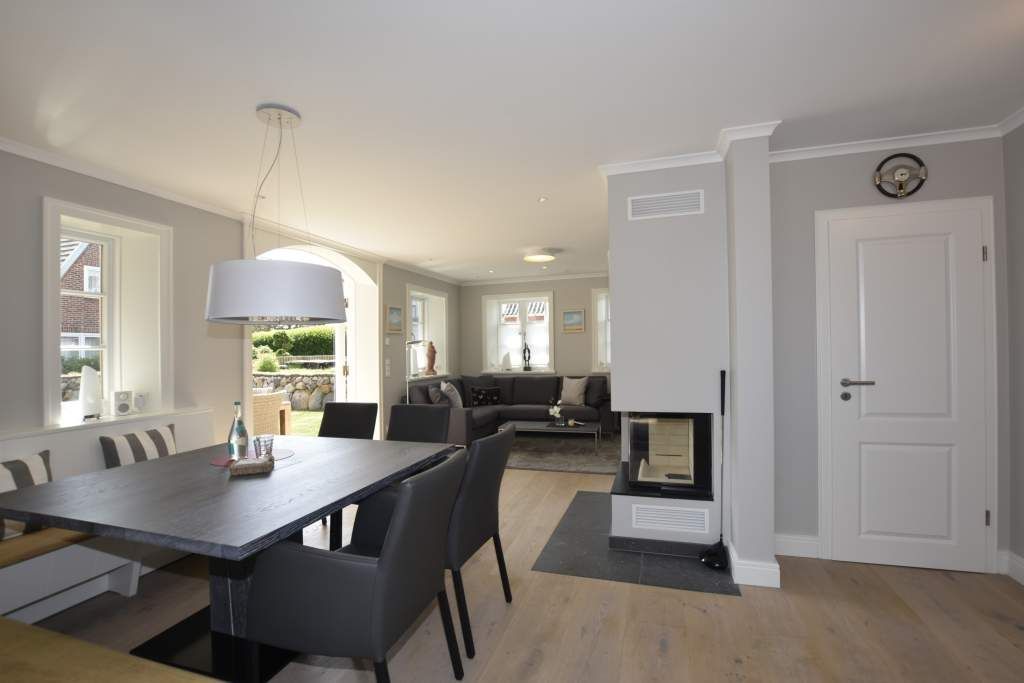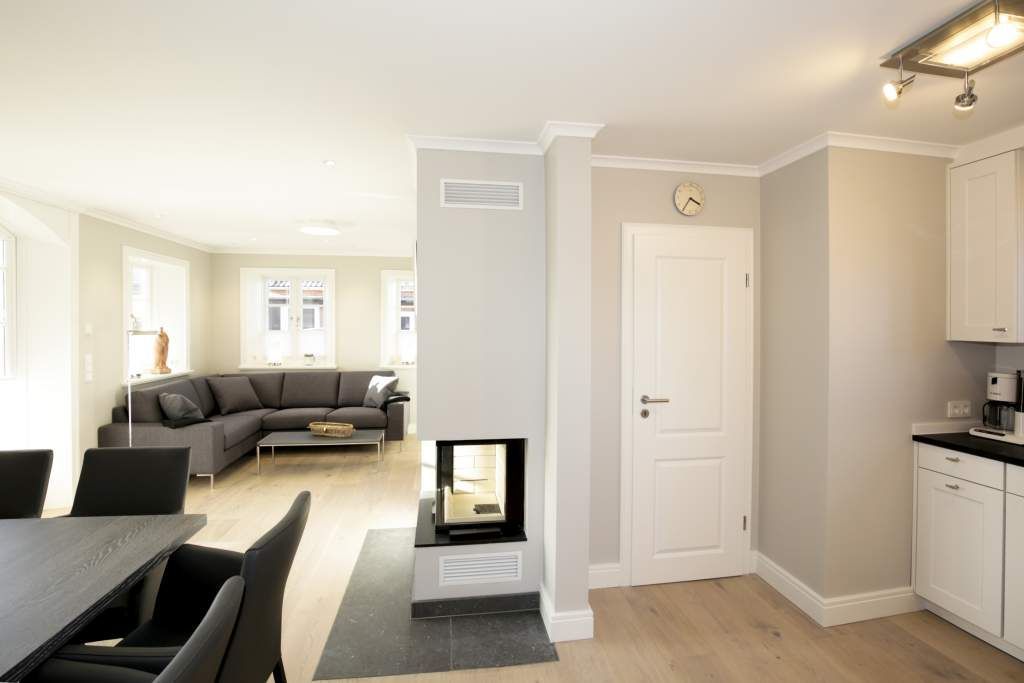 mit Sofa und zwei Sesseln am offenen Kamin aufgeteilt.