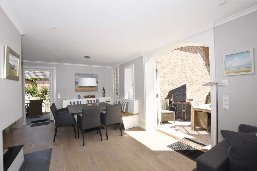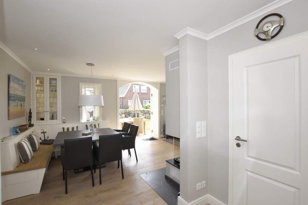 Im Erdgeschoss gelangt man über die Diele in das lichtdurchflutete Wohnzimmer mit Austritt zu Terrasse (mit Strandkorb und Terrassenmöbeln) und Garten.