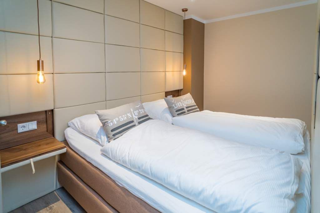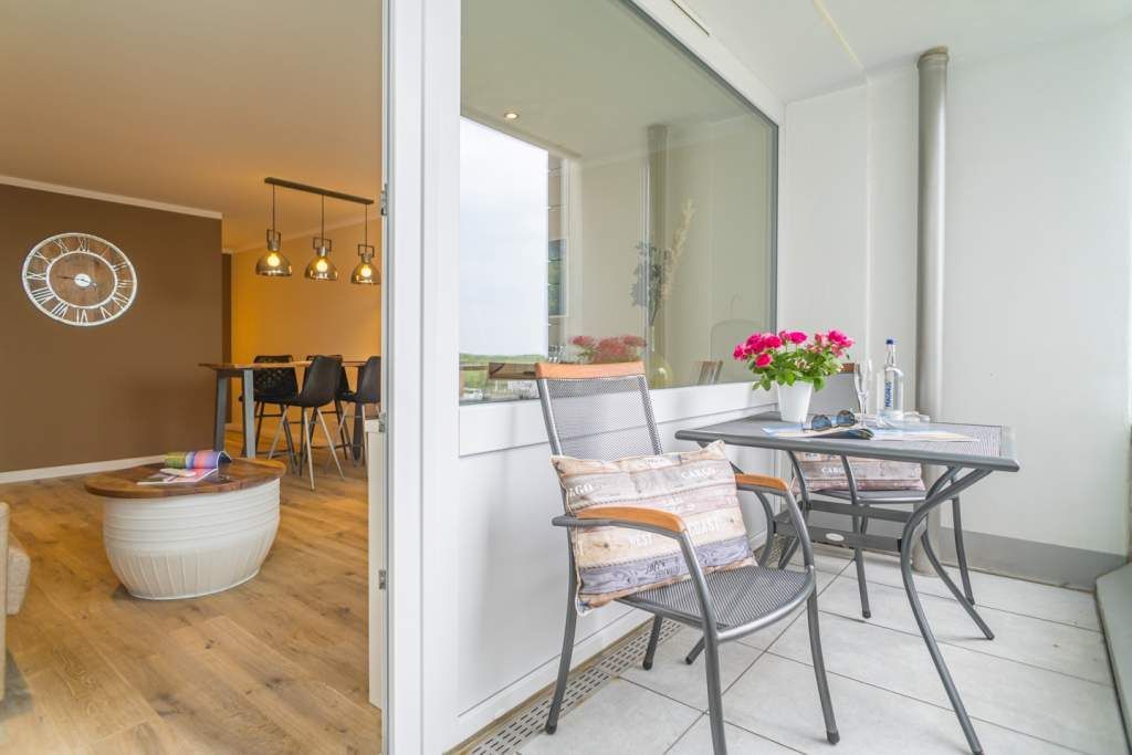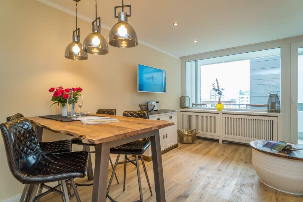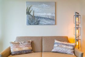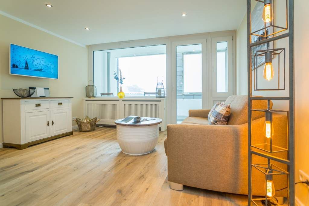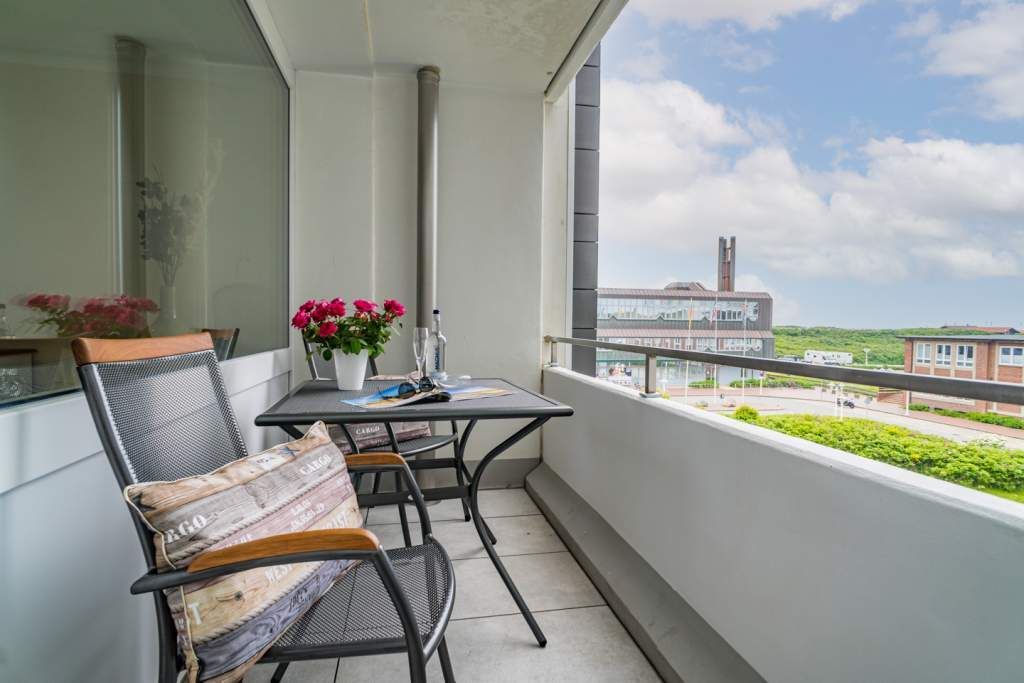 Diese großzügige 1-Zimmer-Nichtraucher-Ferienwohnung (ca. 40 m²) in der 2. Etage überzeugt durch eine clevere Raumaufteilung und einen abgetrennten Schlafbereich mit komfortablem Doppelbett (zwei Einzelmatratzen). Die nach Norden ausgerichtete Loggia mit modernen Balkonmöbeln und weichen Auflagen lädt zu entspannten Stunden ein und bietet einen angenehmen Blick ins Freie.