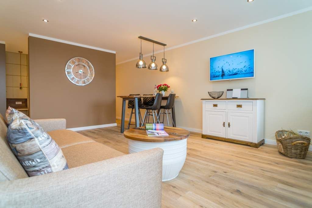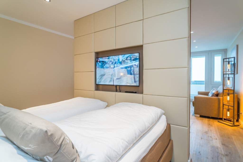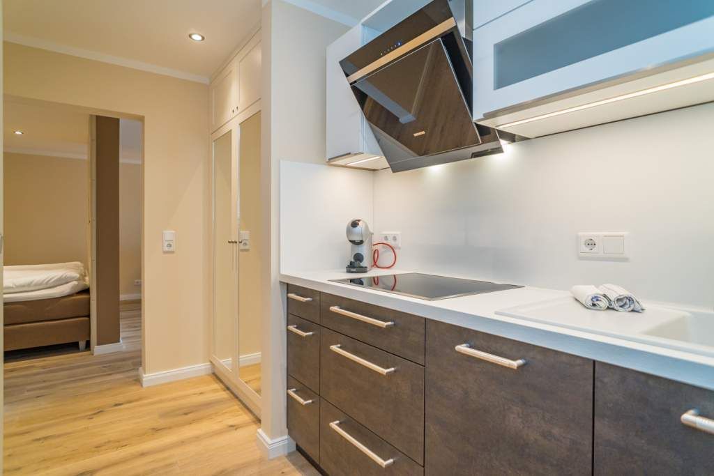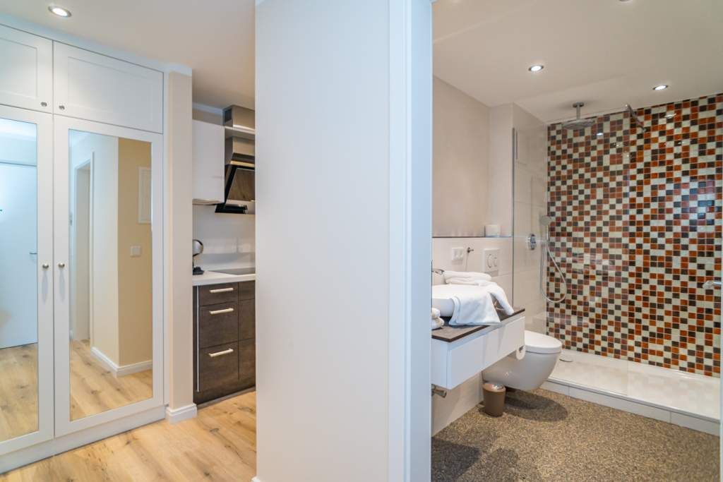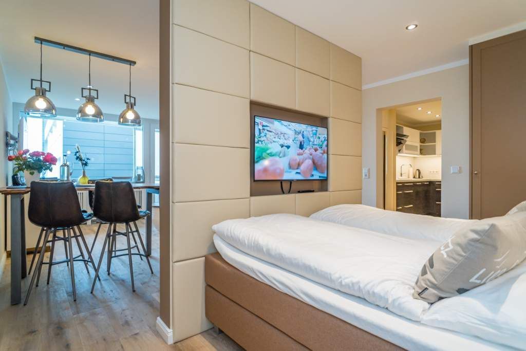 Der einladende Vorflur mit Garderobe führt Sie in den offenen Wohn- und Schlafbereich, der durch seine gemütliche Sitzgarnitur mit Schlafcouch, einem separaten Essplatz und einem großzügigen Kabel-Flachbild-TV besticht ideal, um nach einem ereignisreichen Tag abzuschalten. Die moderne, separate Küche ist voll ausgestattet. Ein Ceranfeld mit 4 Kochfelder, Mikrowelle, Spülmaschine, Kapsel-Kaffeemaschine und Kühlschrank mit 3* Gefrierfach sorgen für kulinarischen Komfort. Wasserkocher und Toaster gehören selbstverständlich zur Grundausstattung. Das neu gestaltete Duschbad beeindruckt mit einer Dusche, die dank extraflachem Einstieg besonders komfortabel ist, ergänzt durch einen eleganten Waschtisch, einen Handtuchtrockner und ein WC.