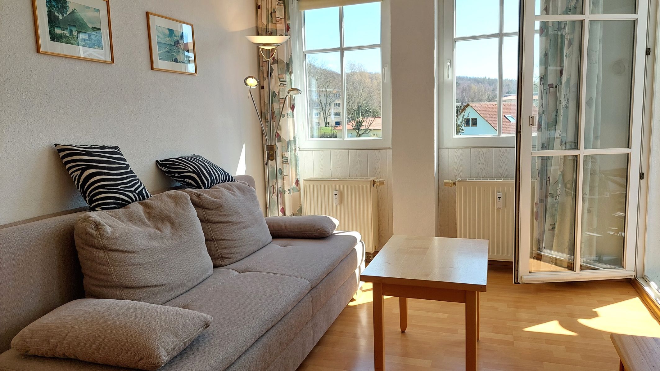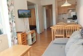 Im Wohnbereich befindet sich ein Schlafsofa samt TV sowie ein weiterer Zugang zum Balkon.