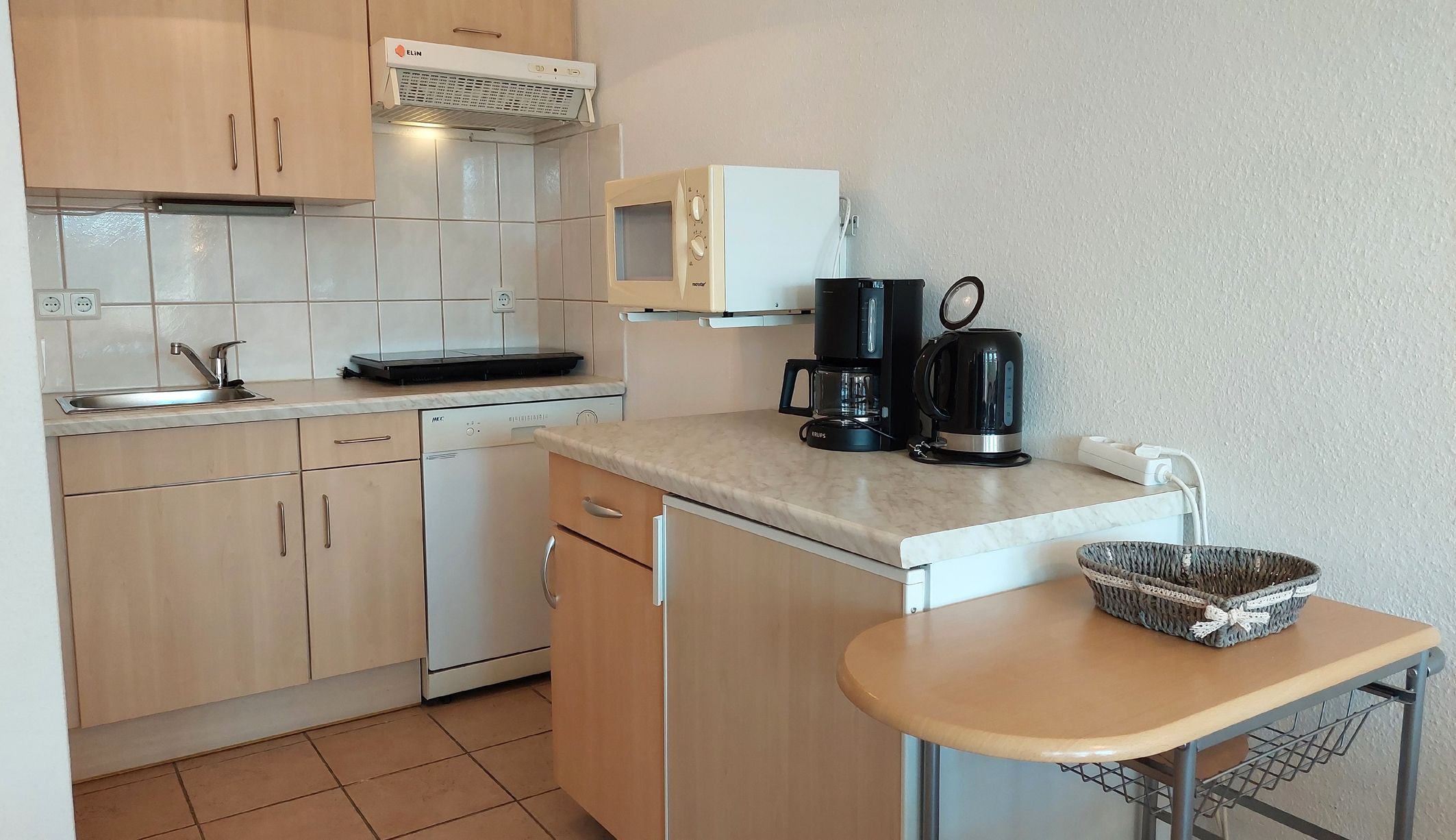 Es gibt einen Esstisch mit vier Sitzgelegenheiten und eine gut ausgestattete Küchenzeile mit 2-Platten-Ceranfeld, Geschirrspüler, Mikrowelle und vielen Küchenutensilien.