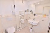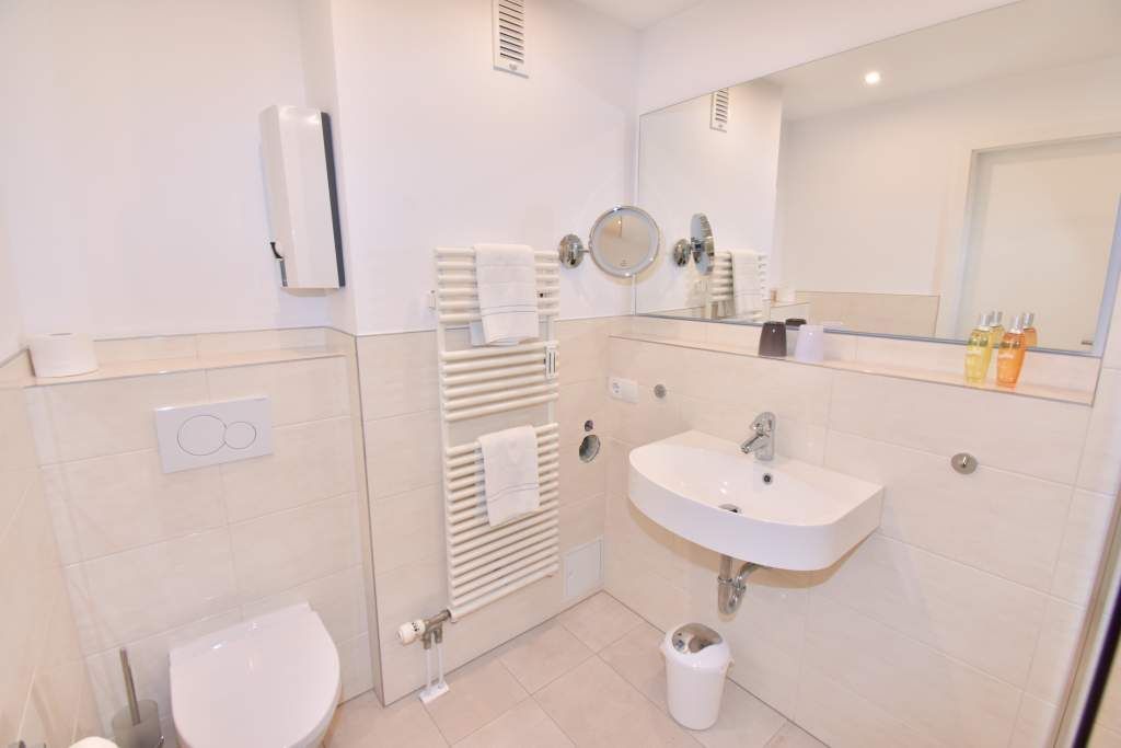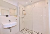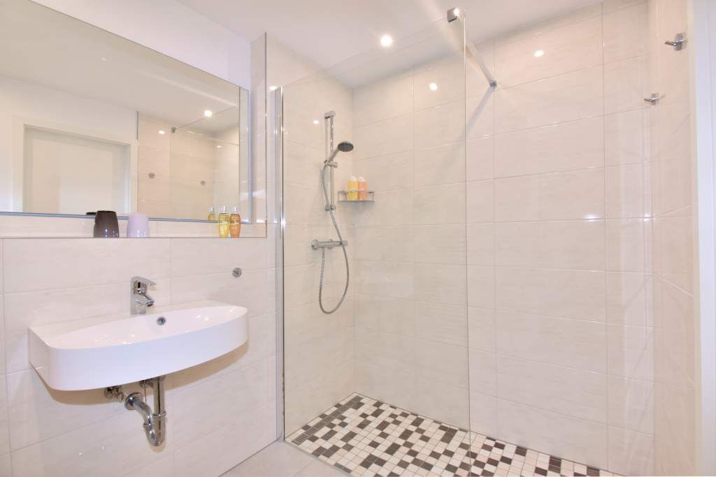 Im kernsanierten Badezimmer befinden sich eine große, ebenerdige Walk-in Dusche, ein Waschtisch, das WC, ein beleuchteter Kosmetikspiegel, Fön und ein Handtuchtrockner.