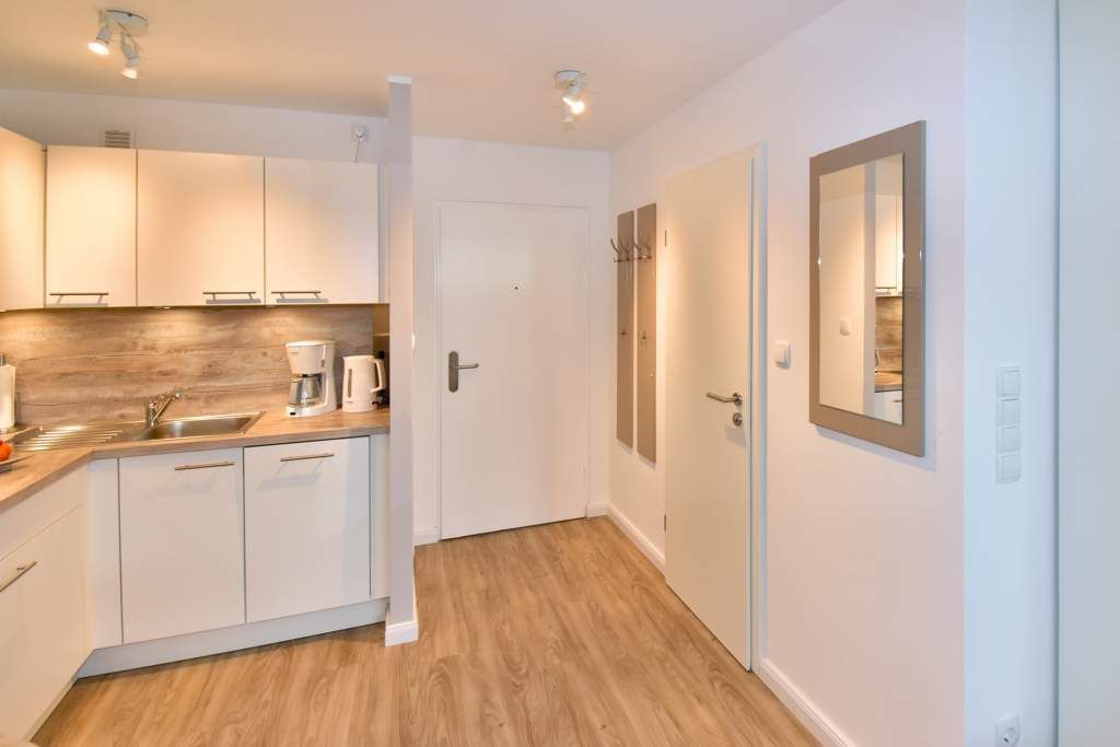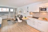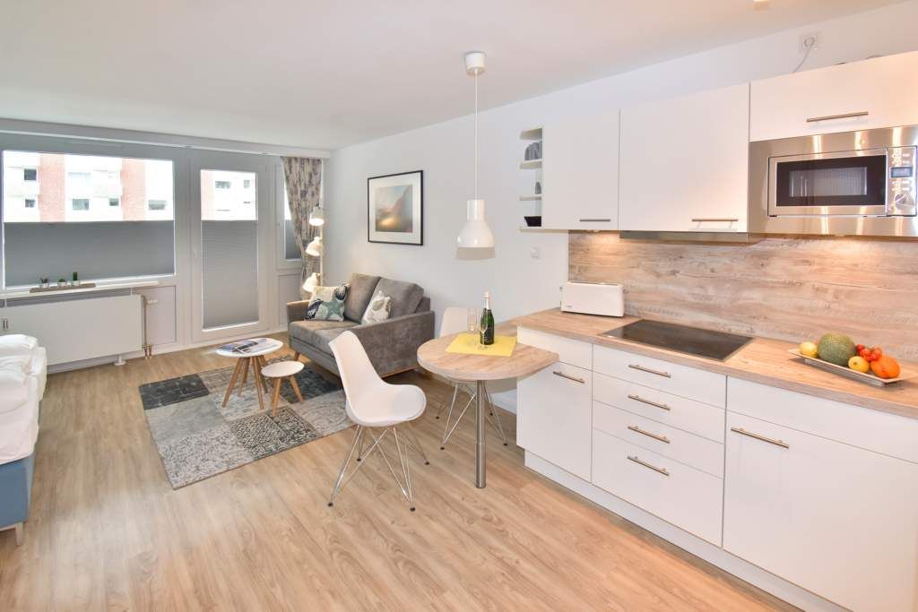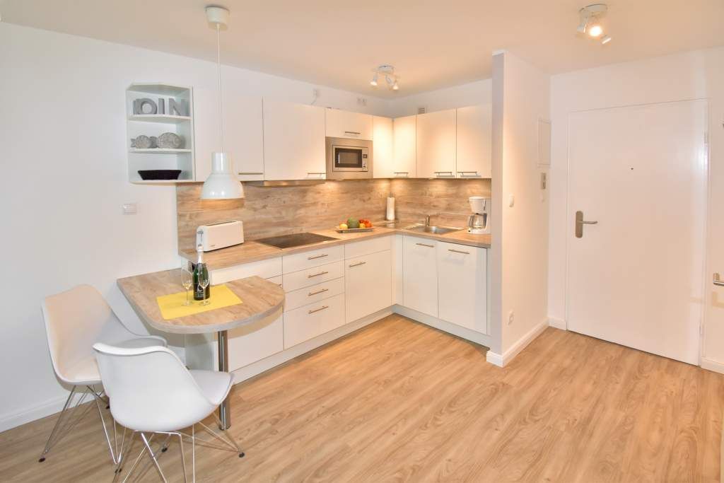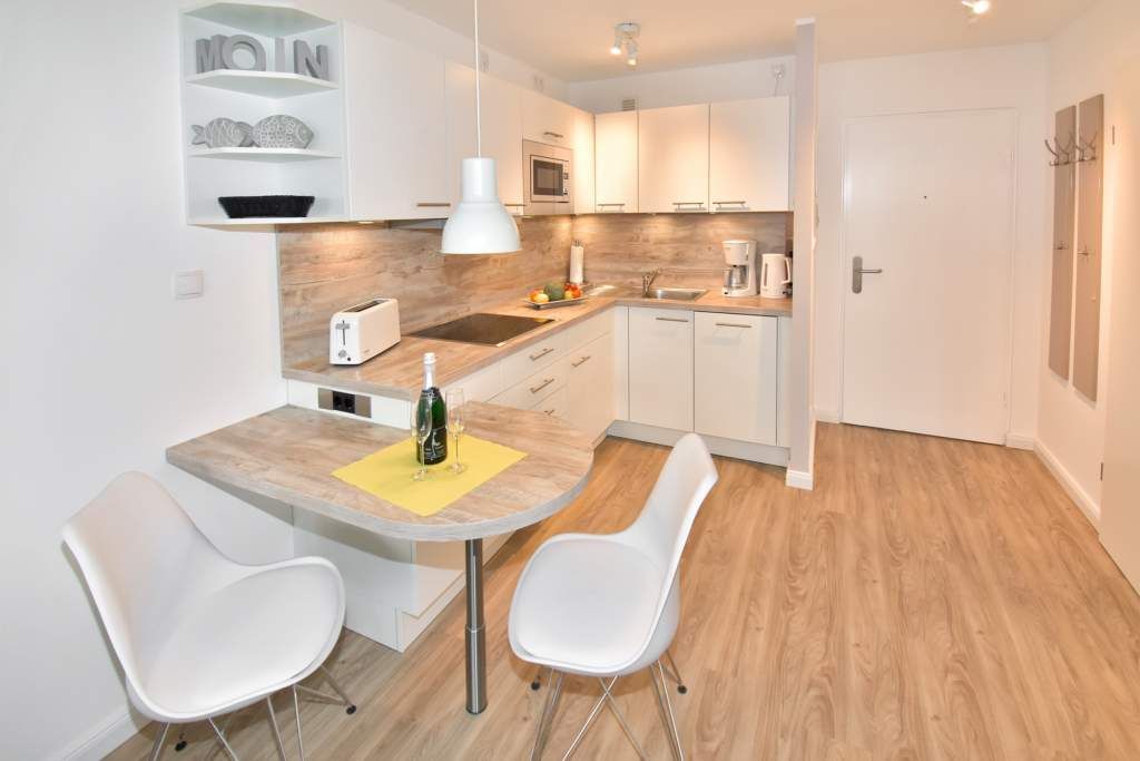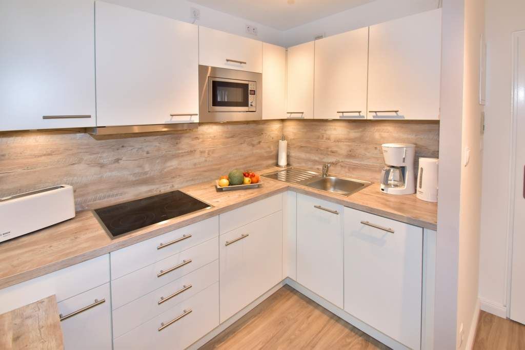 Der offene Küchenbereich ist mit einer neuen L-Küchenzeile mit integriertem Essplatz, einem E-Herd mit vier Ceranfeldern, Geschirrspüler, Kühlschrank mit TK-Fach, Mikrowelle und Abzugshaube ausgestattet. Kaffeemaschine, Wasserkocher und Toaster gehören zur Grundausstattung.