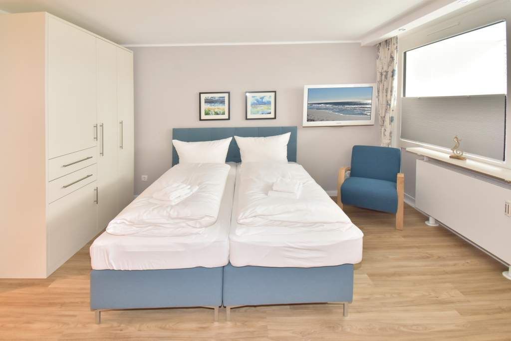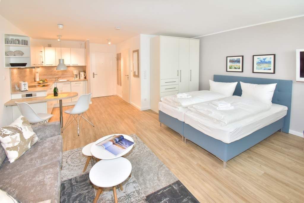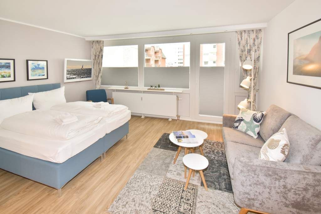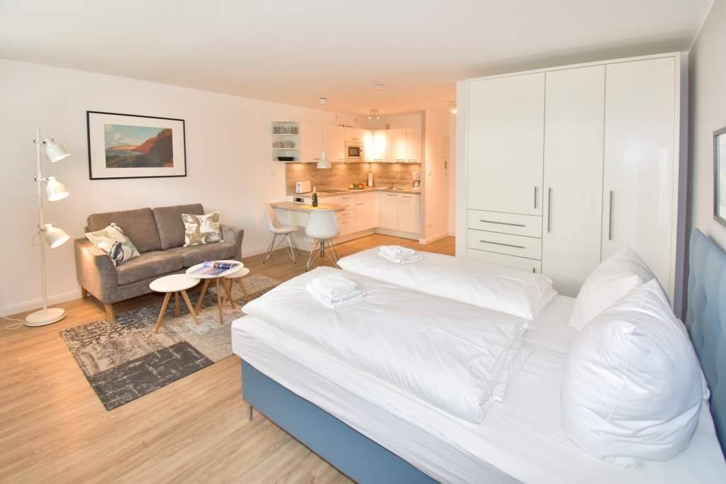Der kombinierte Wohn-/Schlafraum besteht aus einer gemütlichen kleine Sitzgruppe, 1 Sessel, 1 Doppelsitzer, 1 Beistelltisch, 1 freistehendes Doppelbett (Liegefläche 160 x 200 cm, zwei gute Einzelmatratzen), HDTV-Fernsehen (43 Zoll).