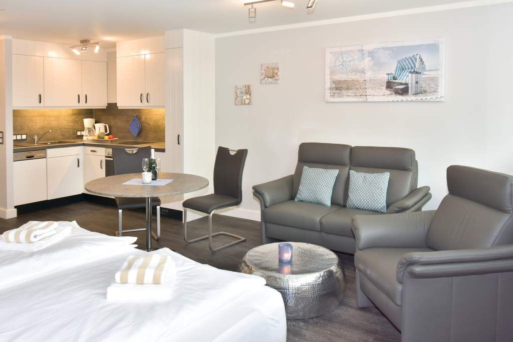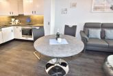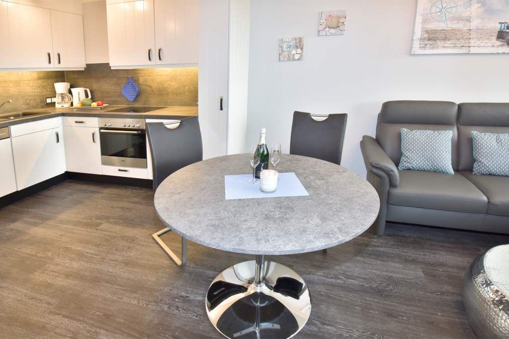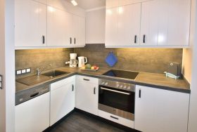 Die offene, moderne Küche ist mit einem Cerankochfeld, einem Geschirrspüler sowie Kaffeemaschine, Wasserkocher und Toaster ausgestattet perfekt für eine unkomplizierte Selbstverpflegung.