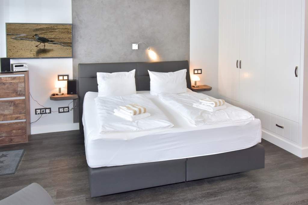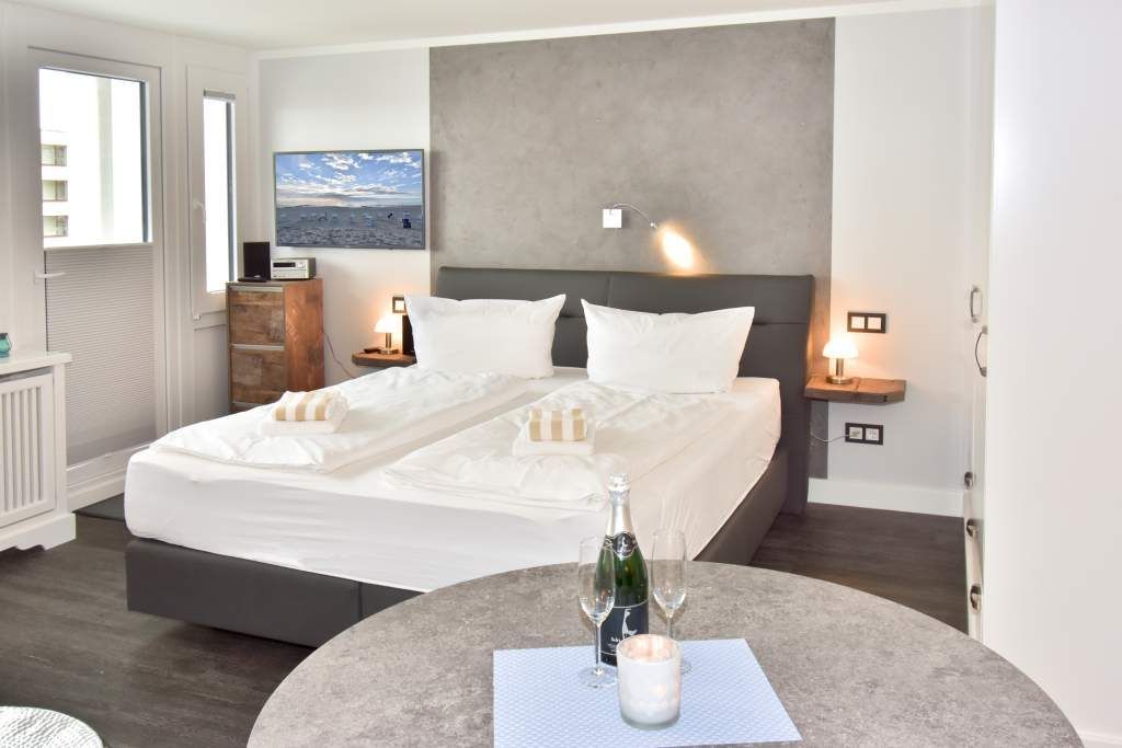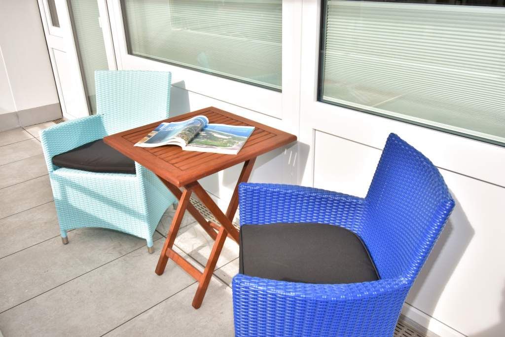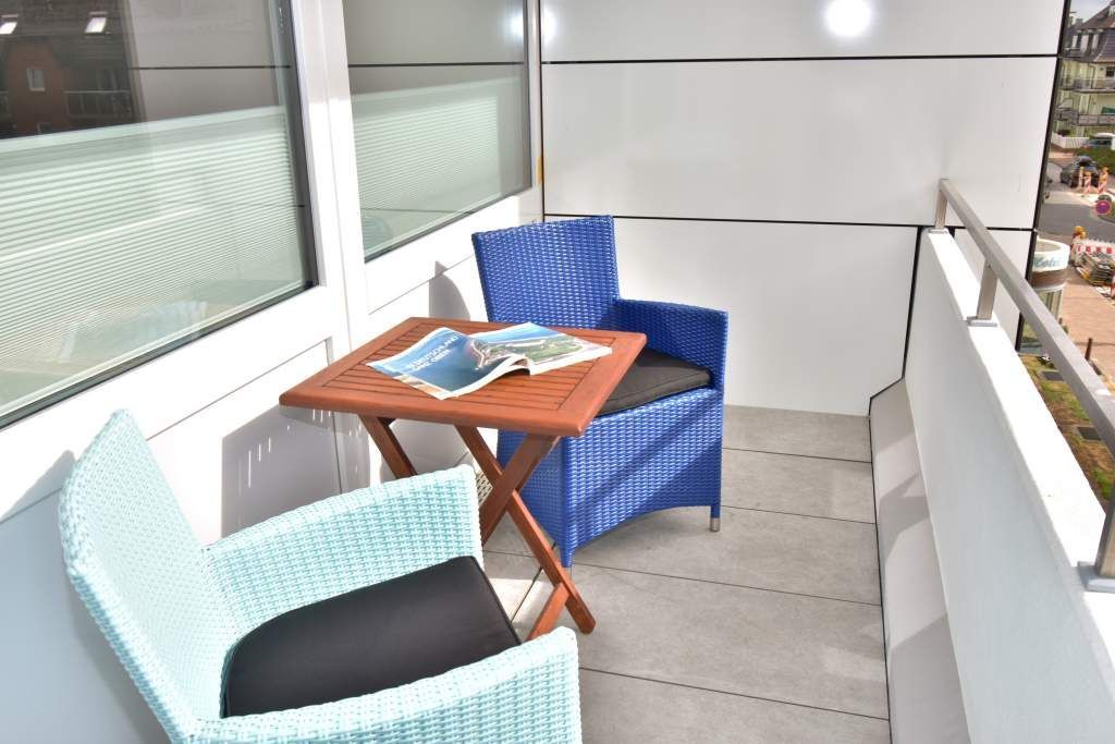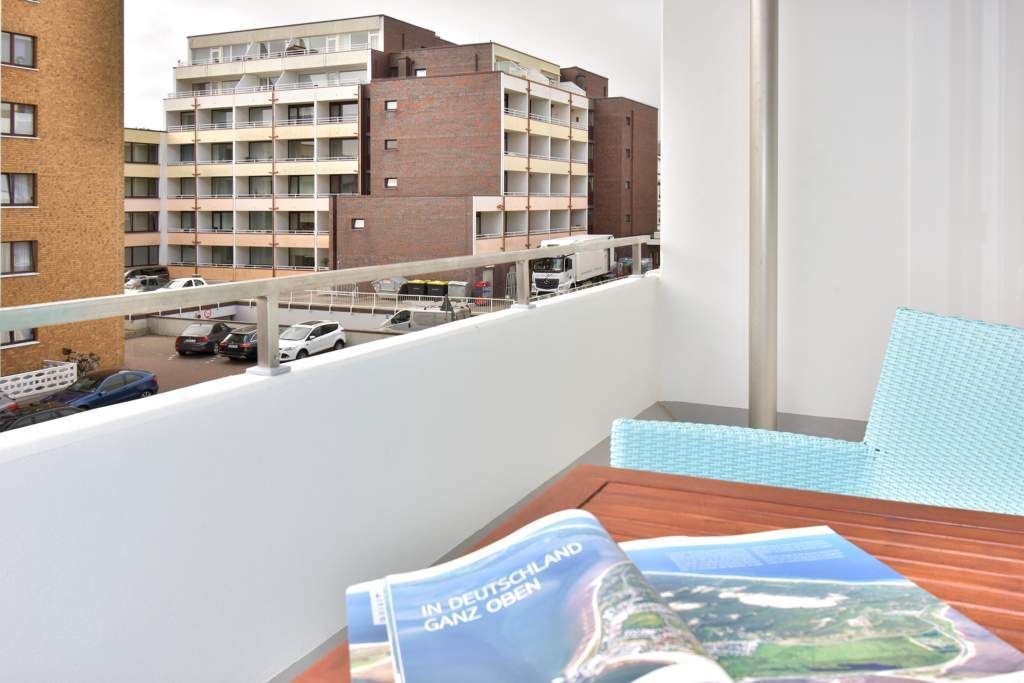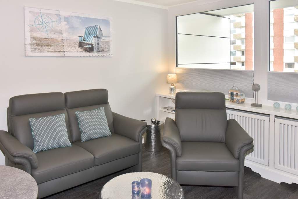 Diese renovierte 1-Zimmer-Nichtraucherwohnung in der 2. Etage bietet auf ca. 38 m² stilvollen Wohnkomfort für zwei Erwachsene ideal für einen entspannten Aufenthalt im Herzen von Westerland. Die nach Osten ausgerichtete Loggia lädt mit Morgensonne, Balkonmöbeln und Auflagen zu einem gemütlichen Start in den Tag ein.
