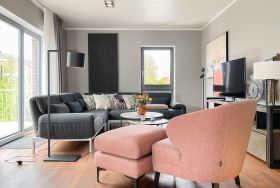 Das Penthouse Deck 2 erstreckt sich über 2 Ebenen im ersten und zweiten Obergeschoss eines Ferienhauses mit nur 2 Wohnungen und bietet auf 180 qm Wohnfläche (zzgl. Terrassen) ausreichend Raum für 6 Personen, um einen erholsamen Ostseeurlaub zu verleben. Der Zugang zur Wohnung erfolgt über das Erdgeschoss mit großzügigem Eingangsbereich, Garderobe und reichlich Stellfläche für Kinderwagen usw. Über die offene Treppe ist das erste Obergeschoss zu erreichen. Hier erwarten Sie lichtdurchflutete, unglaublich großzügige Räumlichkeiten mit bodentiefen Fensterelementen, hochwertig eingerichtet im Hampton Style. Das Leben spielt sich im äußerst weitläufigen Wohn- Essbereich ab, der mit einer hochwertigen Sofalandschaft, einem riesigen Essbereich für gemütliches Beisammensein und einer Leseecke eingerichtet ist. Es gibt drei Zugänge zu den vorgelagerten Dachterrassen, die mit Gartenmöbeln und elektrischer Markise ausgestattet sind. Genießen Sie die Sonne von früh bis spät mit Blick auf den liebevoll gestalteten Garten mit Teichanlage und Goldfischen von der Wohnung Deck 1. Die offene Einbauküche mit Kochinsel bietet viel Platz lädt zum gemeinsamen Kochen ein. Auf dieser Ebene befindet sich weiterhin ein Schlafzimmer mit einem Doppelbett (180x200), Verdunklungsvorhängen, Kinderbettchen und Wickelkommode sowie ein Gäste WC und ein Hauswirtschaftsraum, in dem auch Waschmaschine und Trockner untergebracht sind. Über das offene Treppenhaus ist die zweite Wohnebene zu erreichen. Hier befinden sich zwei weitere Schlafzimmer, ausgestattet mit Doppelbetten, Verdunklungsvorhänge und TV sowie ein großzügig angelegtes Wellnessbad mit Dusche, Badewanne und Sauna. Eines der Schlafzimmer verfügt über ein weiteres Duschbad ensuite und im Flurbereich ist ein Kleiderschrank untergebracht, der reichlich Stauraum für die Urlaubsgarderobe bietet.