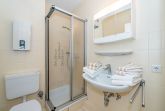 Das Badezimmer ist mit einer Dusche, einem Waschtisch und einem WC ausgestattet.