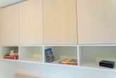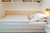 Im Obergeschoss befindet sich ein Schlafzimmer mit Doppelbett sowie ein Kinderzimmer mit zwei Einzelbetten und das Badezimmer mit ebenerdiger Dusche und zwei Waschbecken.
