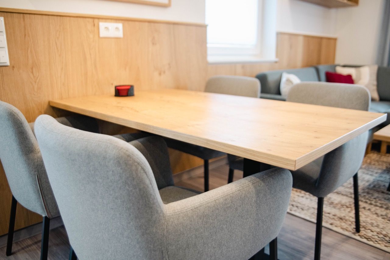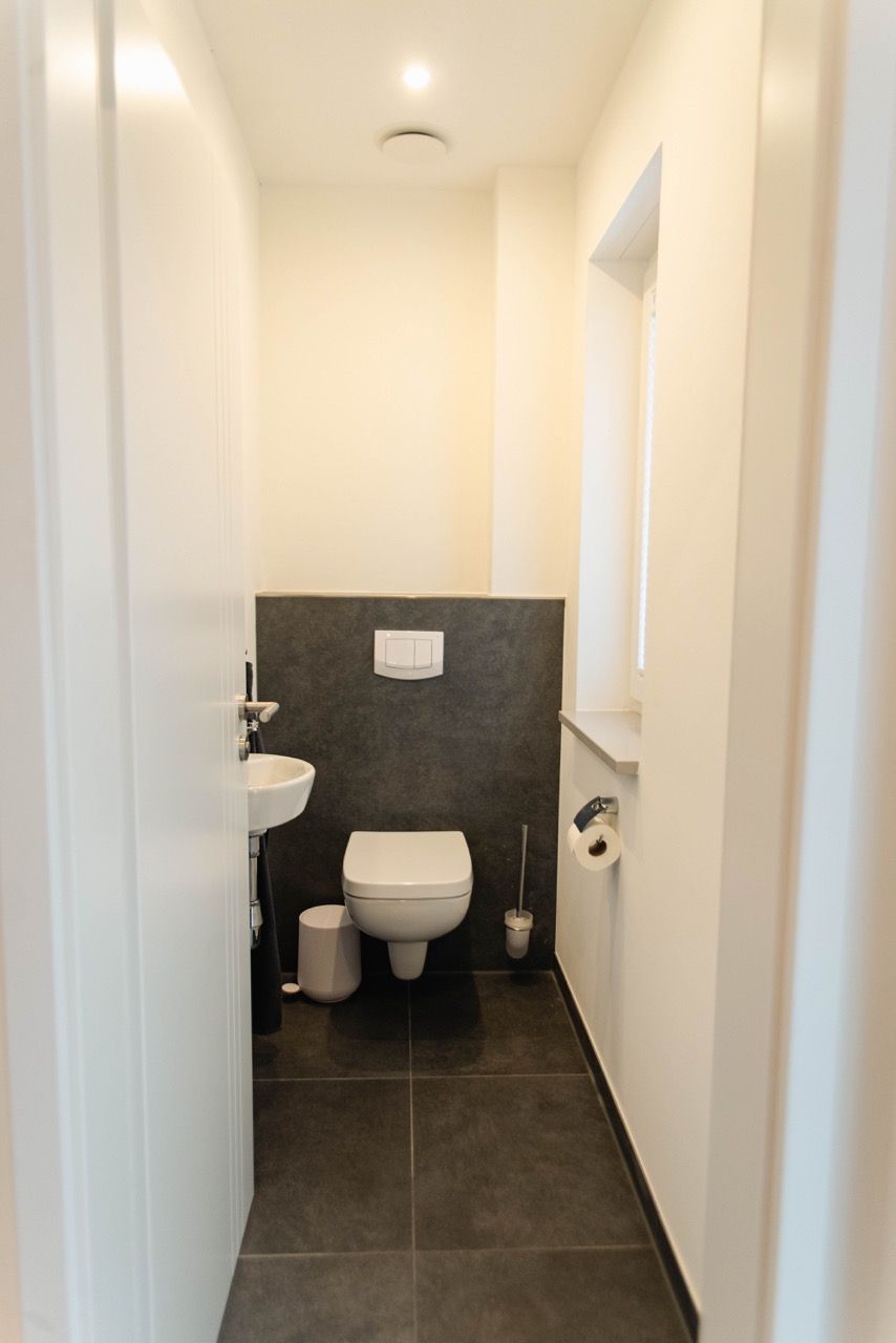 Das Erdgeschoss ist in das Wohn- und Esszimmer mit offener Küche, das Gäste-WC und ein Abstellraum mit Waschtrockner aufgeteilt.