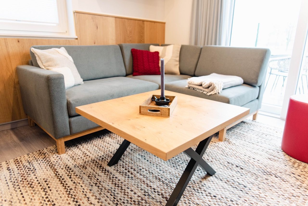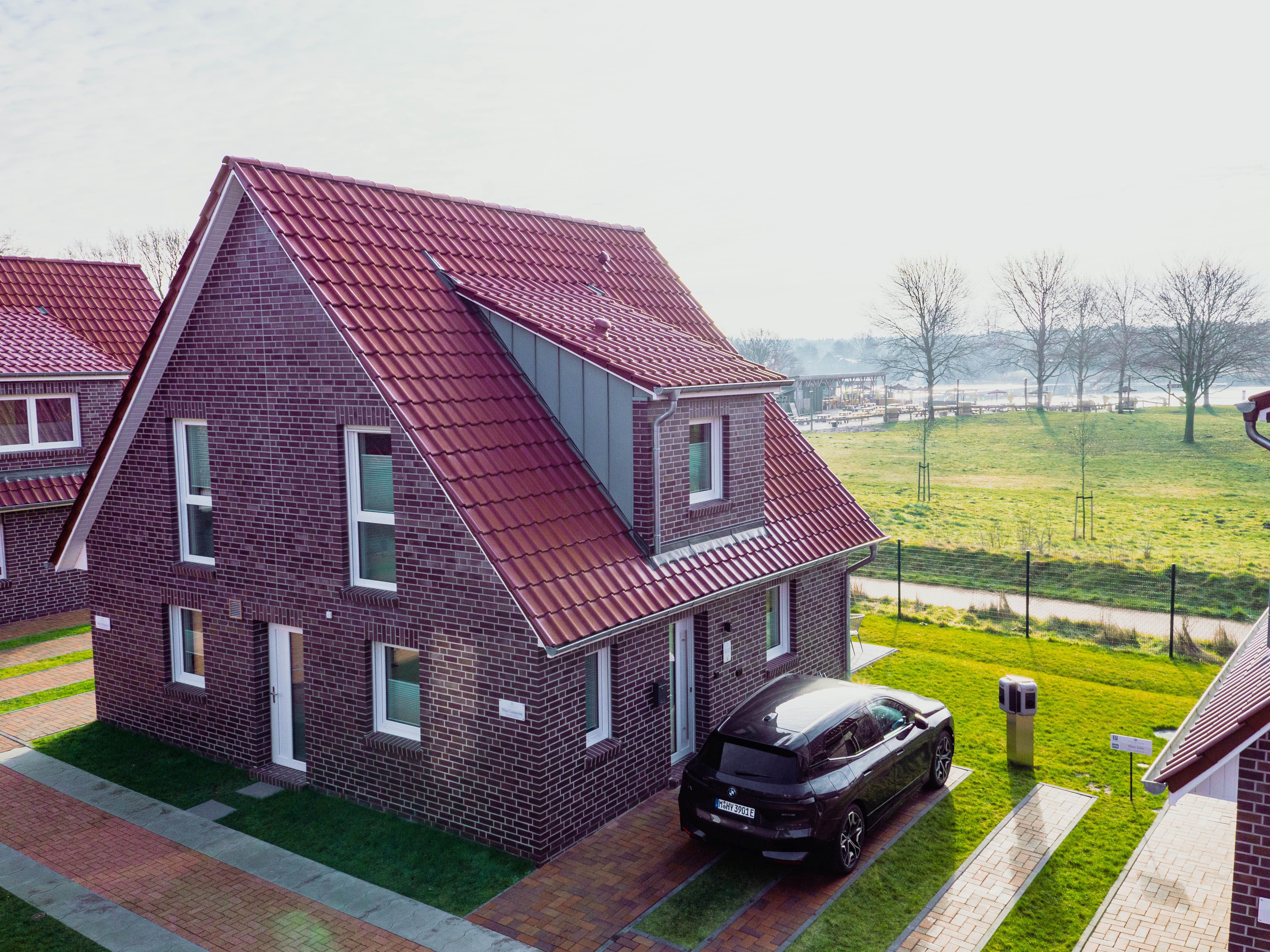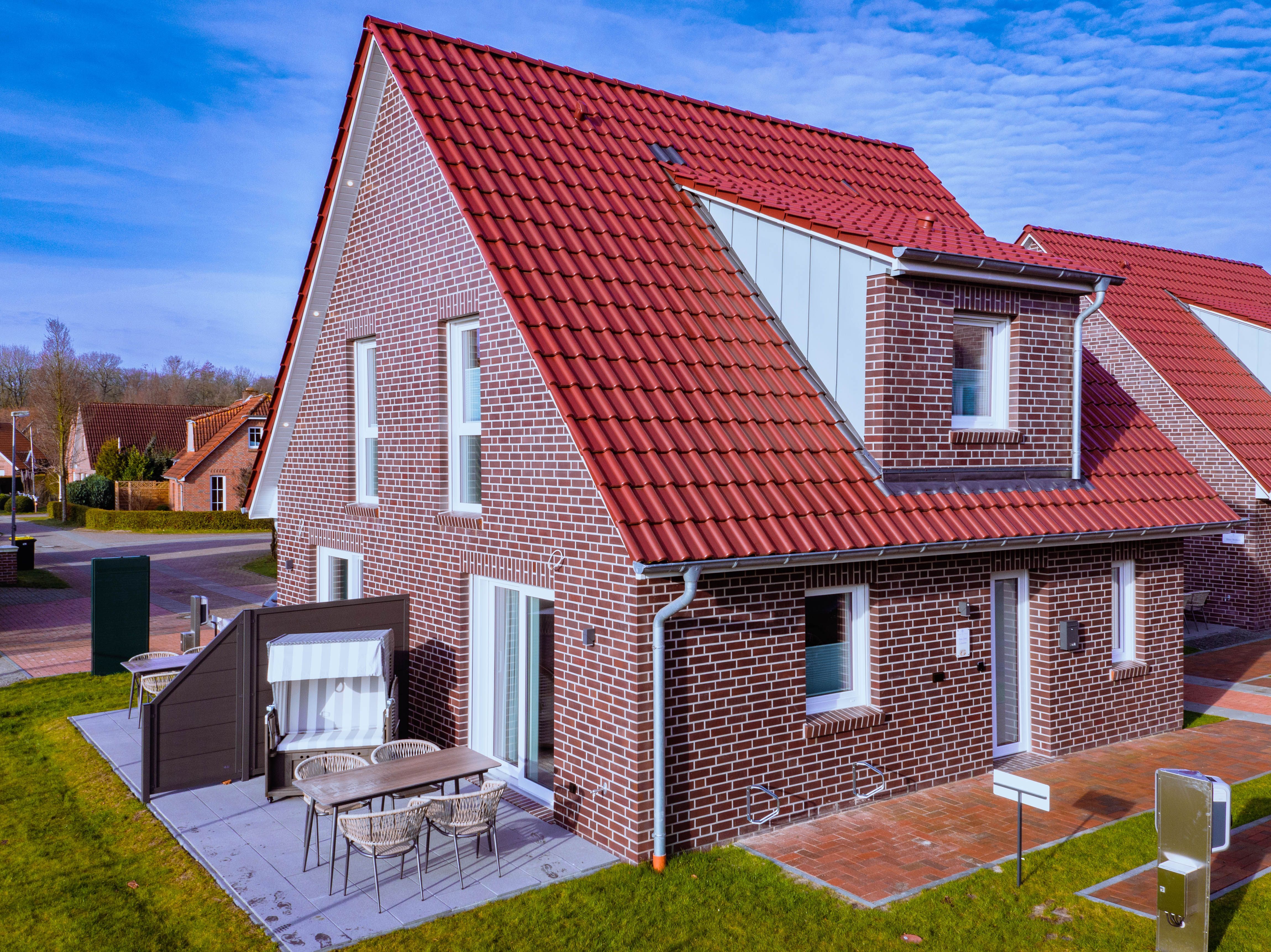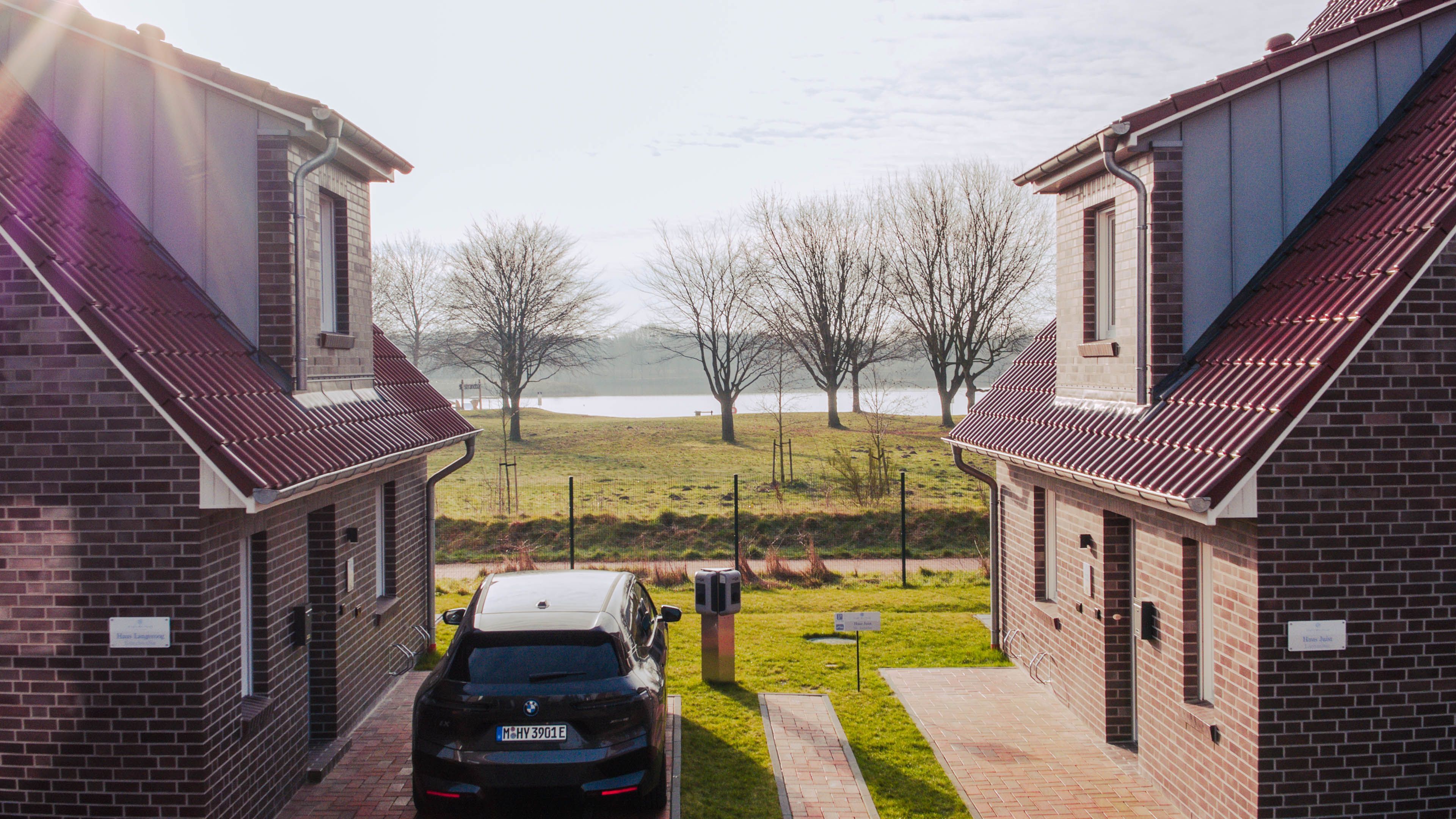 Für jedes Apartment steht ein Parkplatz mit E-Ladesäule zur Verfügung, die Terrassen sind möbliert, außerdem lädt ein gemütlicher Strandkorb zum Verweilen ein.