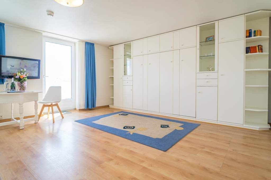 Das kombinierte Wohn-/Schlafzimmer ist mit zwei Wandklappbetten (je 0,85?×?1,95?m, einzeln ausklappbar), einer gemütlichen 2-Sitzer-Couch, einem Sessel sowie einem Kabel-Flachbild-TV ausgestattet. Die große Fensterfront führt direkt auf den Ostbalkon perfekt für ein sonniges Frühstück mit Ausblick.