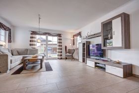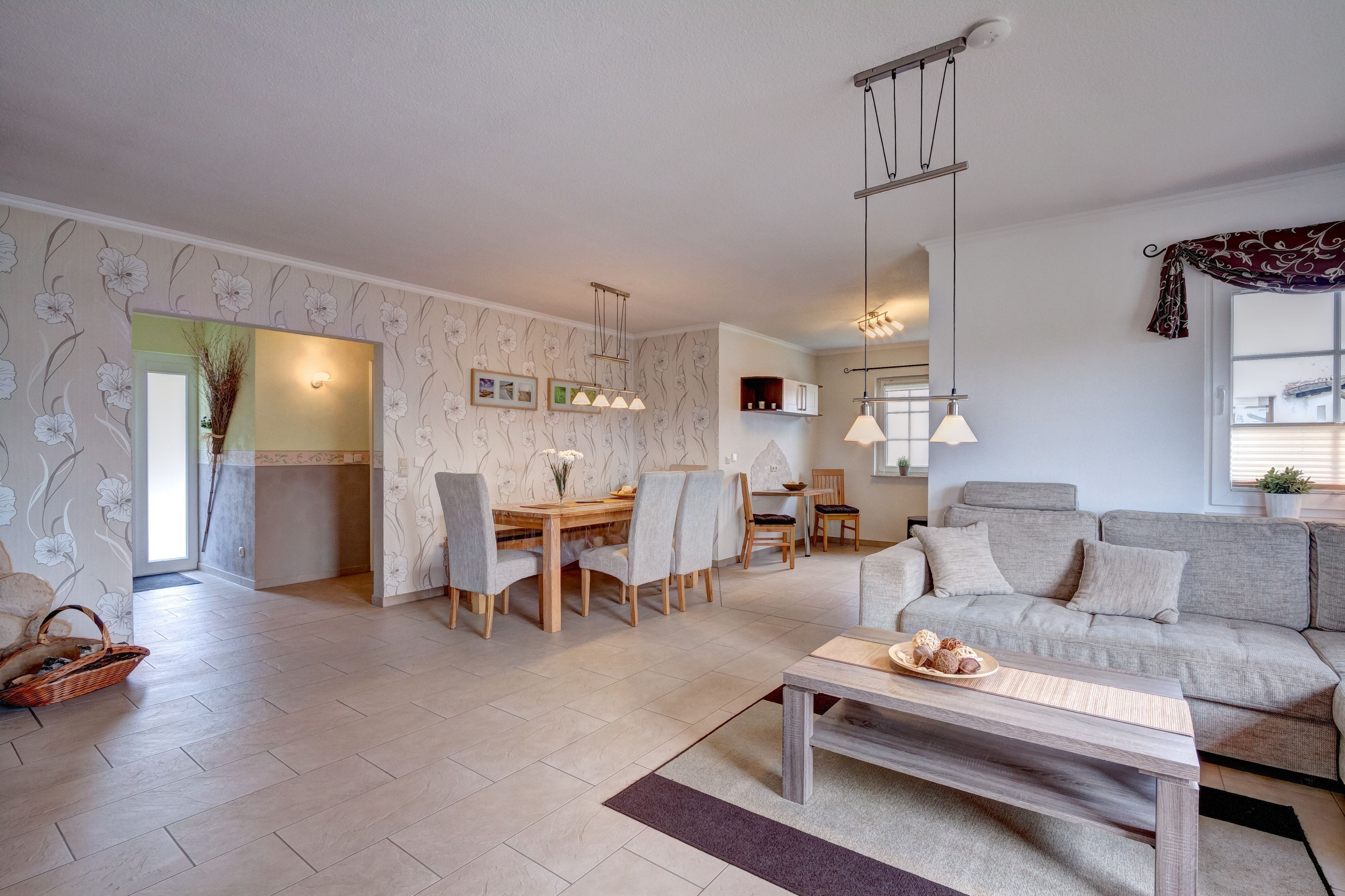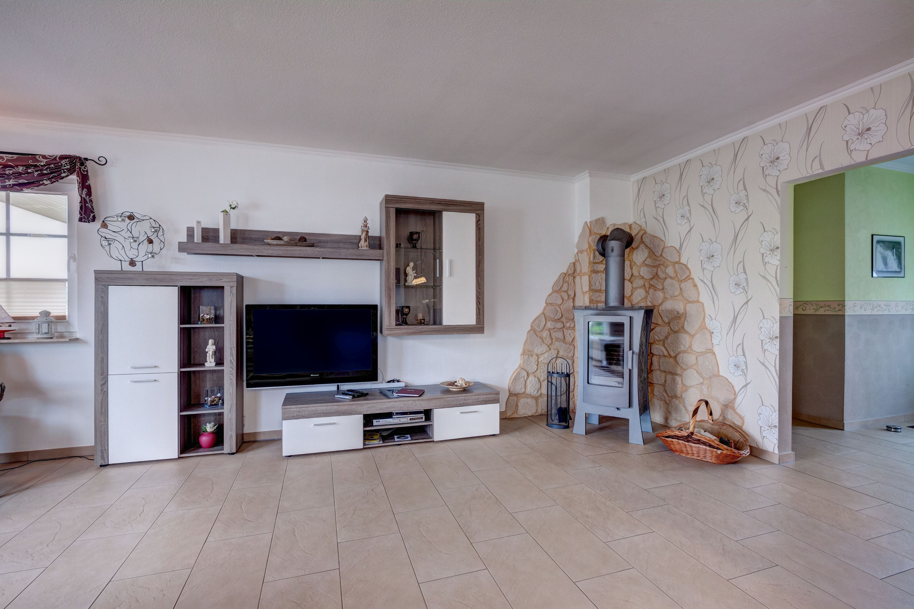 Großer Wohnbereich mit Kamin, ausziehbarem Schlafsofa & offener Küche