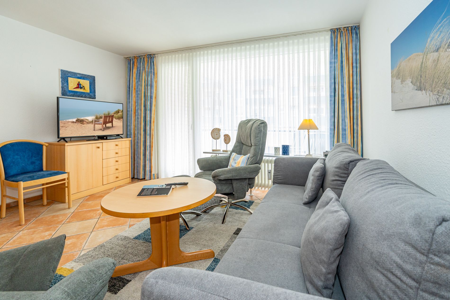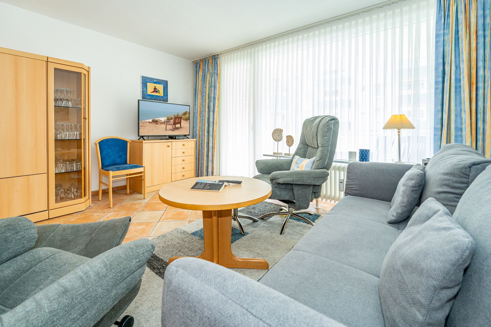 Der Wohnraum besteht aus einer bequemen Sitzgarnitur (2-Sitzer-Couch, 2 Sessel), einem Essplatz, einem Doppelschrankbett (einzeln ausklappbar), Flachbild-TV (HD-Ready mit digitalem Empfang mit ca. 60-100 Radio- und Fernsehprogrammen), DVD-Player, Radio/CD, kostenlose Flatrate ins deutsche Festnetz, W-Lan.
