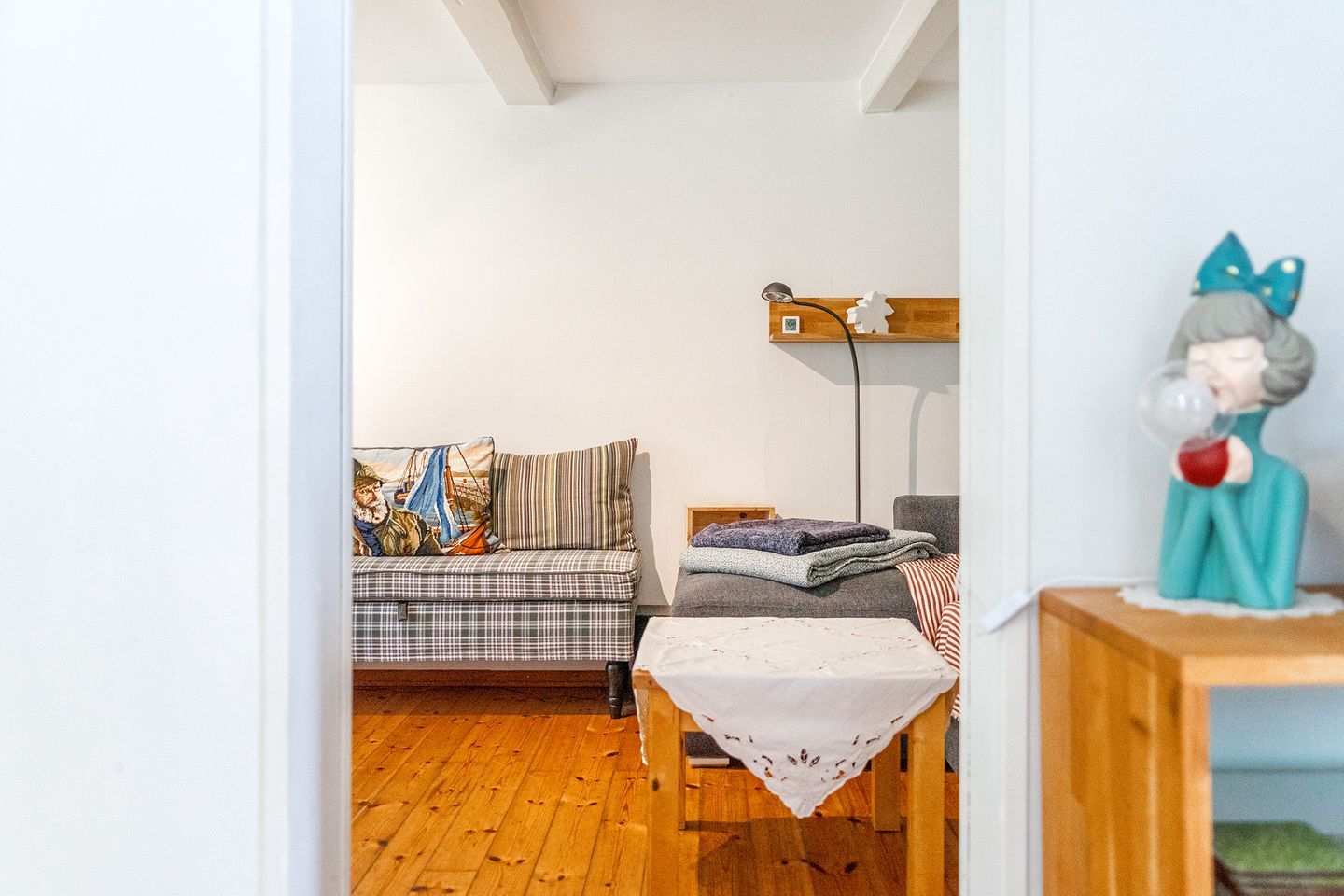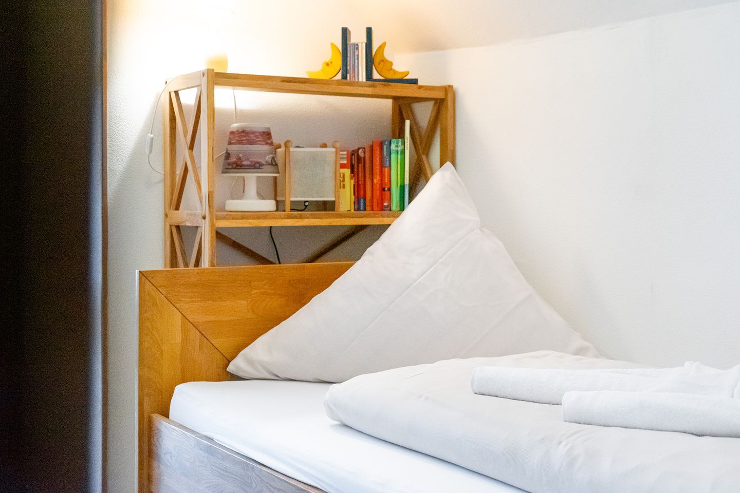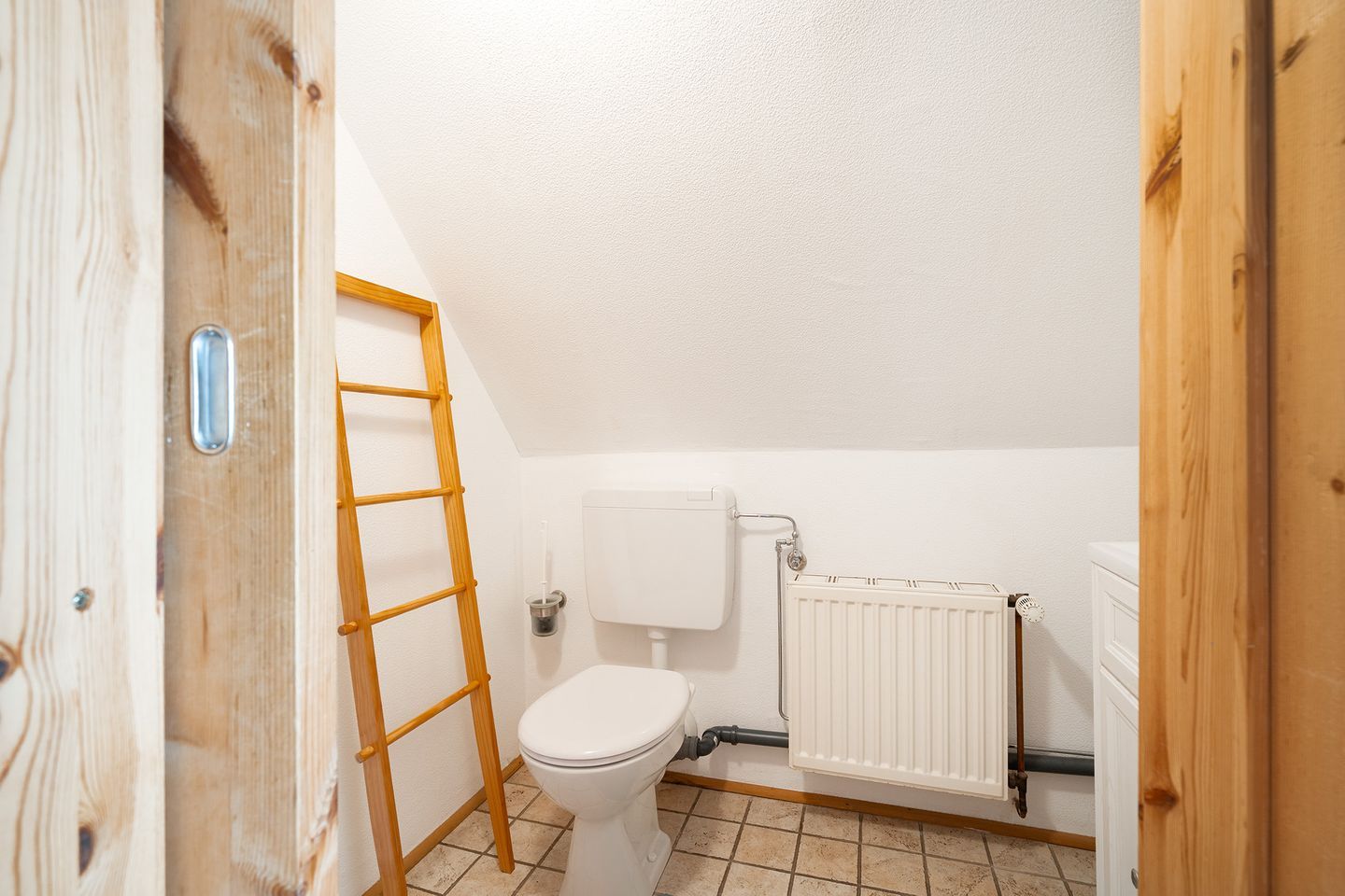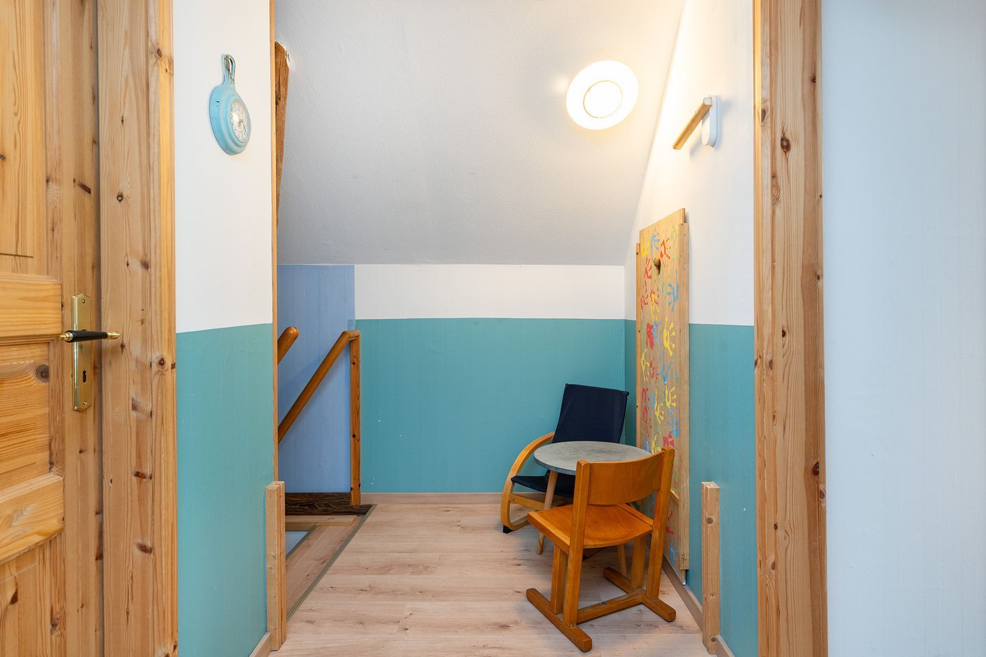 Über eine steile Treppe gelangen Sie in das Obergeschoss mit den beiden Schlafzimmern und einem Gäste-WC (nur kaltes Wasser). Ein Schlafzimmer verfügt über ein Doppelbett, das andere Schlafzimmer verfügt über zwei Einzelbetten, einen Kleiderschrank und Kinderspielzeug. In diesem Zimmer ist auch ein Wickeltisch vorhanden. Eine Treppenabsperrung als Schutz für Kinder ist auch vorhanden.