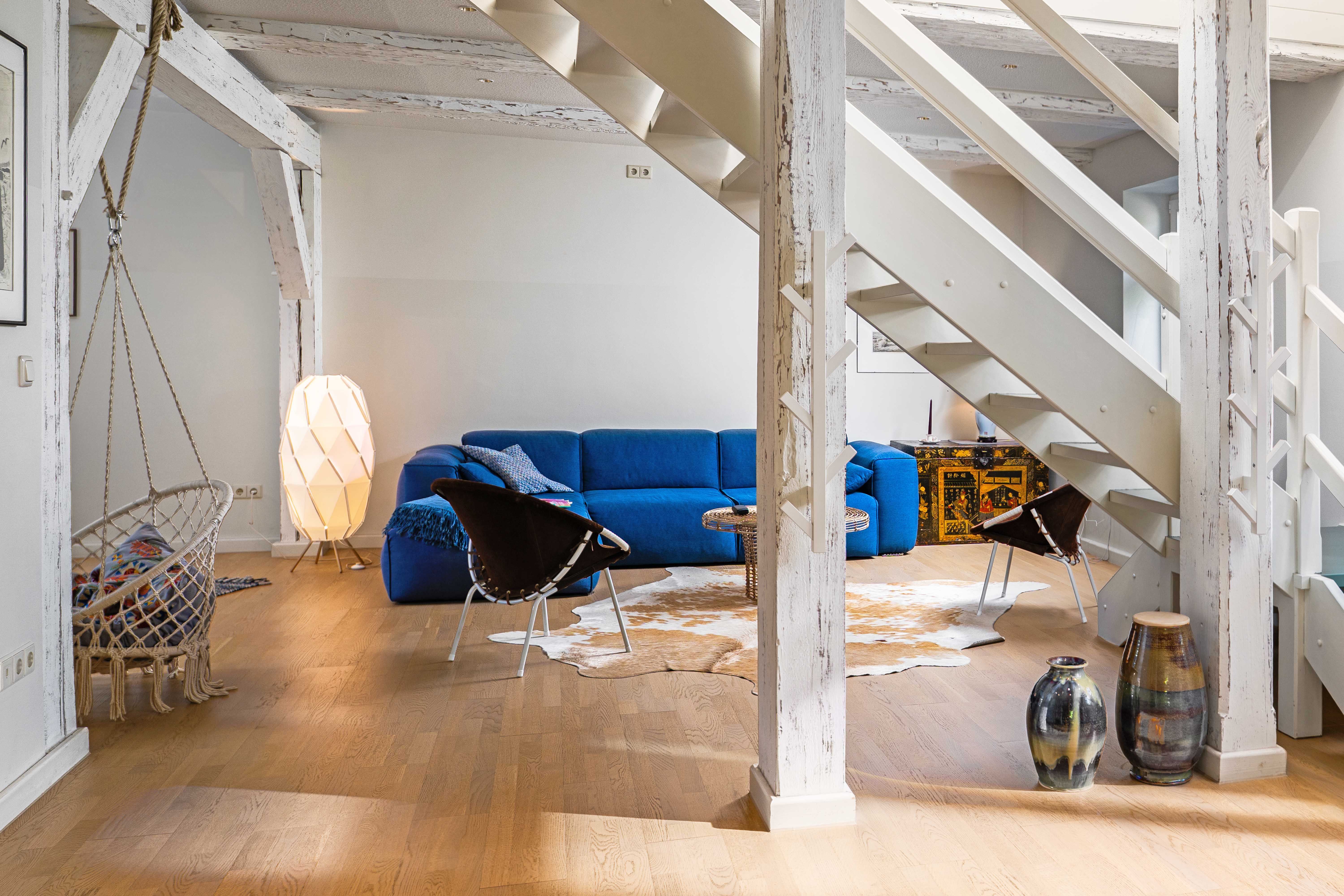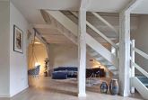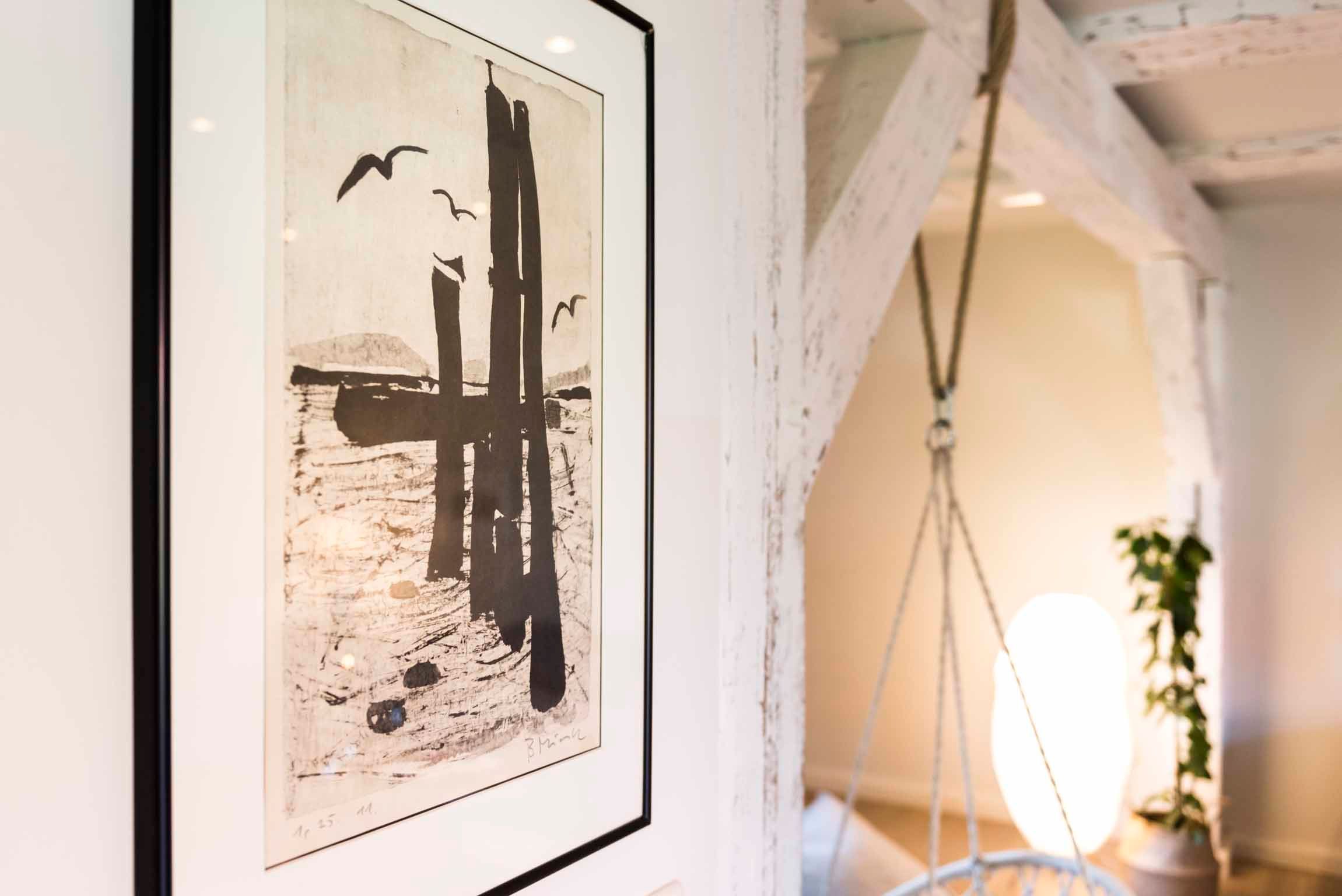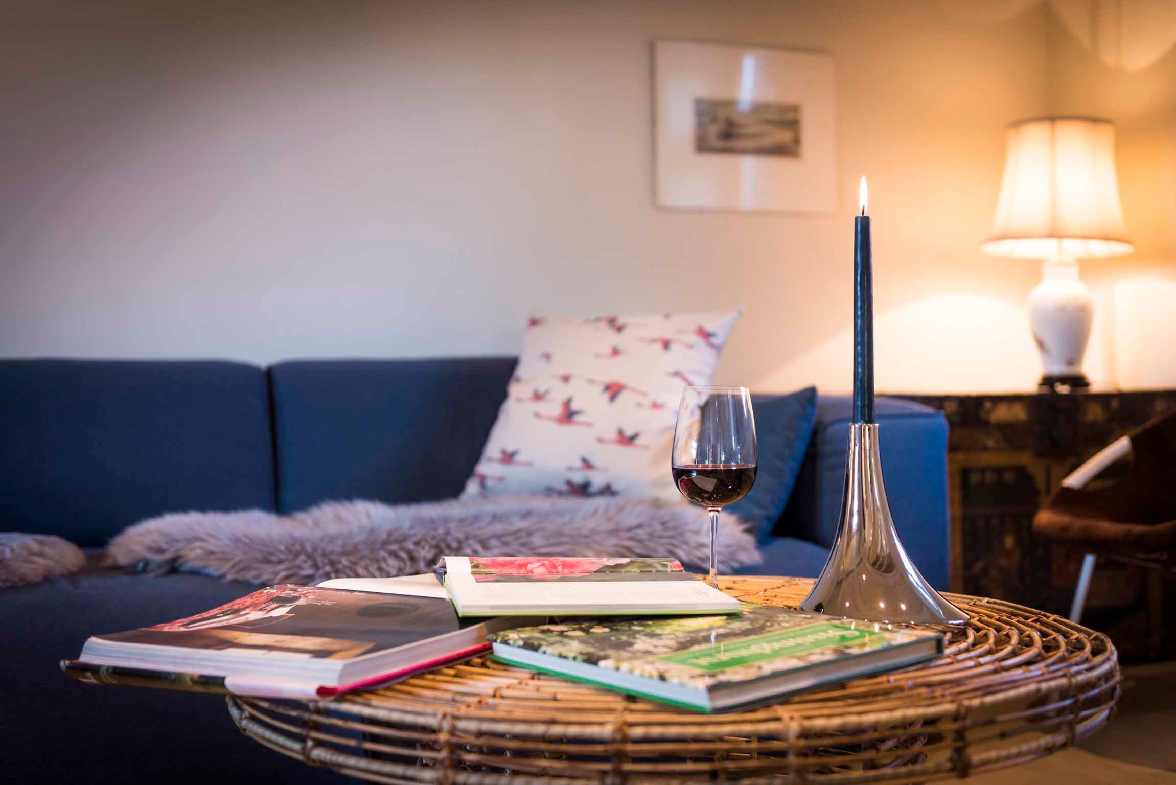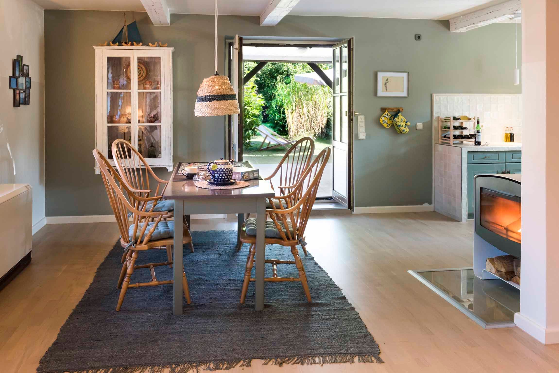 Das Haus empfängt seinen Gast mit einem großen, offenen Wohnraum, auf der einen Seite liegt der gemütliche Wohnbereich mit breitem Loungesofa und Sixties-Designersesseln aus Wildleder, auf der anderen Seite befindet sich der Essplatz mit Kaminofen, vollausgestatteter Küche und Doppelflügeltür zur überdachten Terrasse mit Outdoor-Essplatz. Zwischen den beiden Wohnbereichen liegen das Erdgeschossbad und die galerieartige Treppe ins Obergeschoss. Die beiden Doppelschlafzimmer liegen im Obergeschoss, das zum Wasser hin ausgerichtete blaue Seezimmer und das zum Hof bzw. Garten hingewandte grüne Gartenzimmer, letzteres mit einem Bad ensuite.