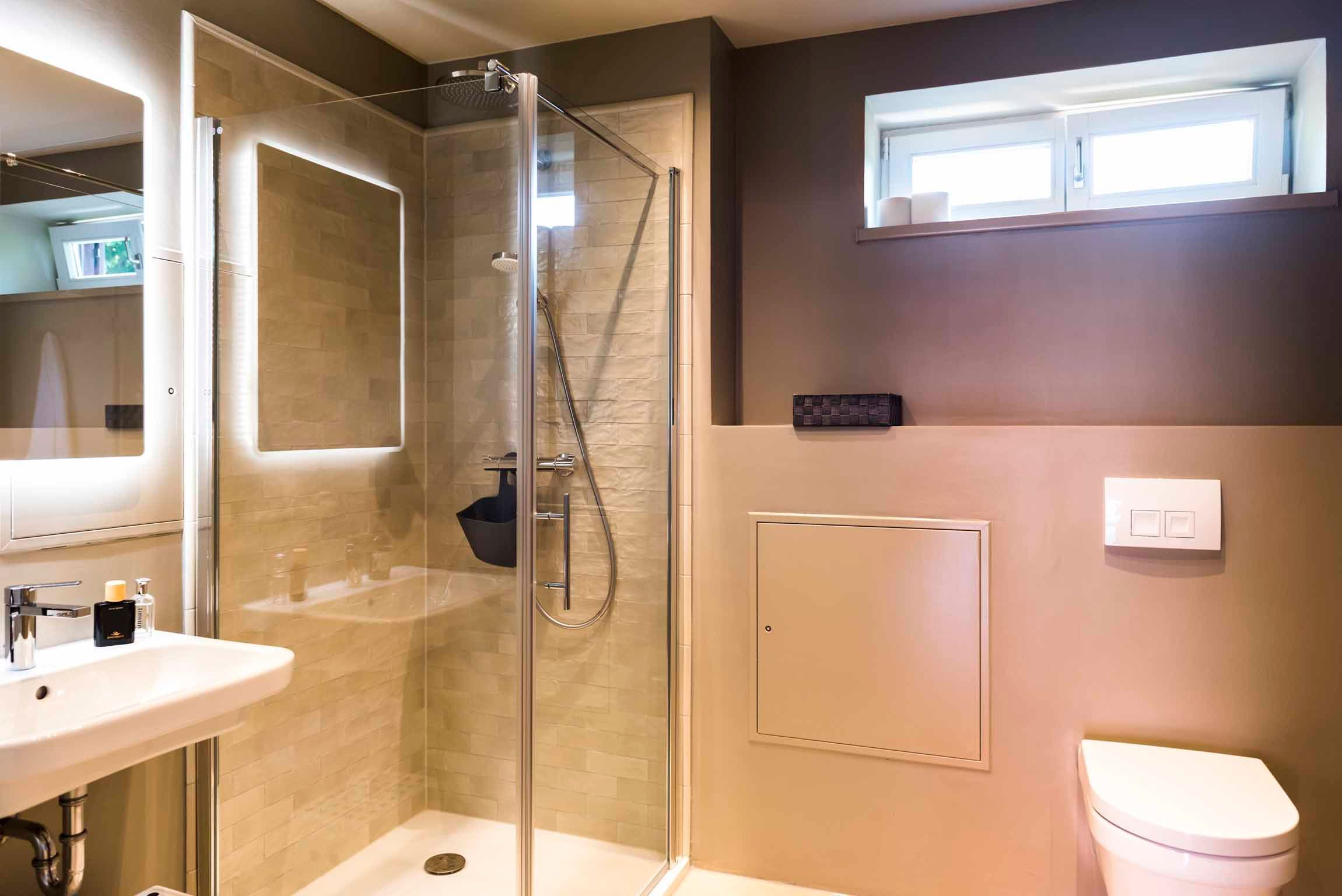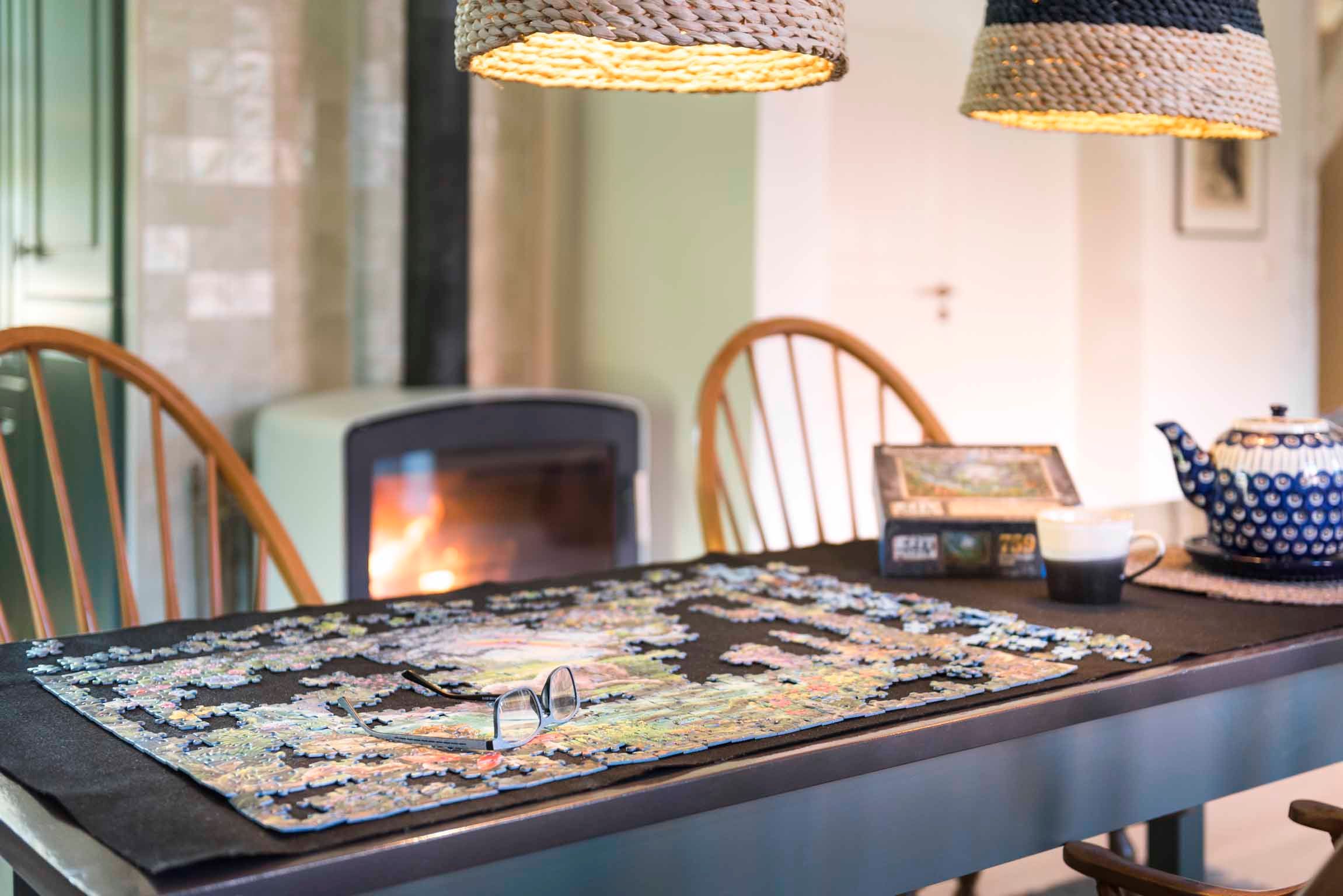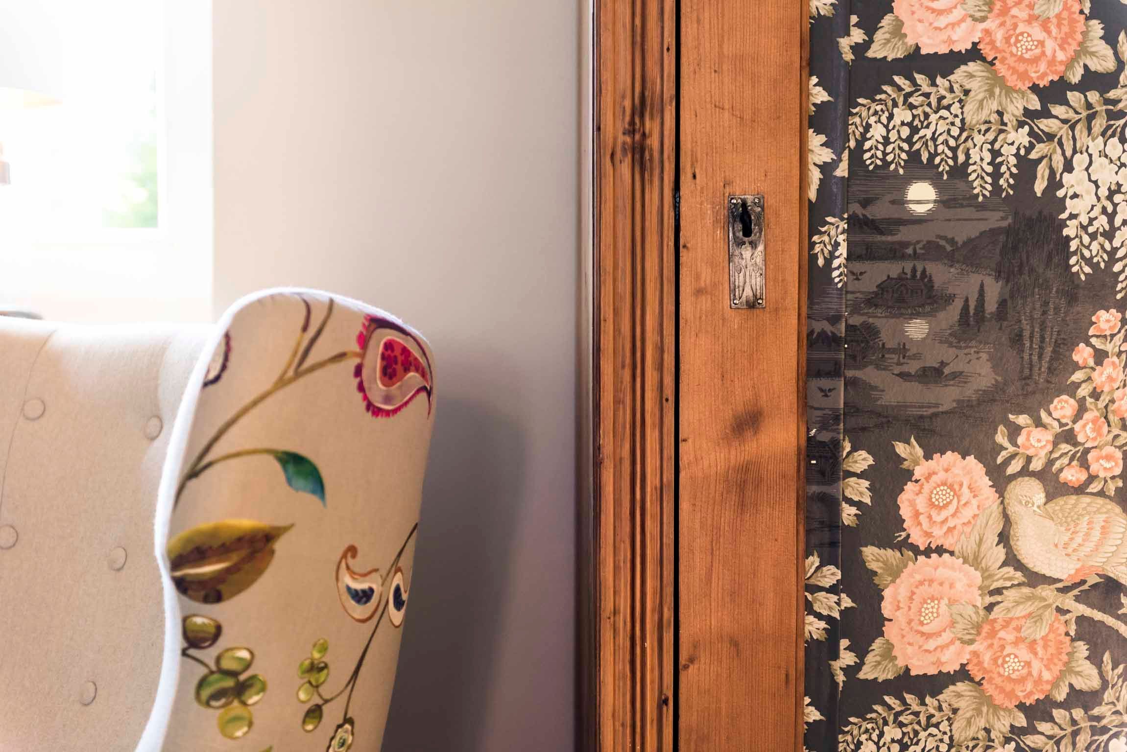 Das Haus empfängt seinen Gast mit einem großen, offenen Wohnraum, auf der einen Seite liegt der gemütliche Wohnbereich mit breitem Loungesofa und Sixties-Designersesseln aus Wildleder, auf der anderen Seite befindet sich der Essplatz mit Kaminofen, vollausgestatteter Küche und Doppelflügeltür zur überdachten Terrasse mit Outdoor-Essplatz. Zwischen den beiden Wohnbereichen liegen das Erdgeschossbad und die galerieartige Treppe ins Obergeschoss. Die beiden Doppelschlafzimmer liegen im Obergeschoss, das zum Wasser hin ausgerichtete blaue Seezimmer und das zum Hof bzw. Garten hingewandte grüne Gartenzimmer, letzteres mit einem Bad ensuite.