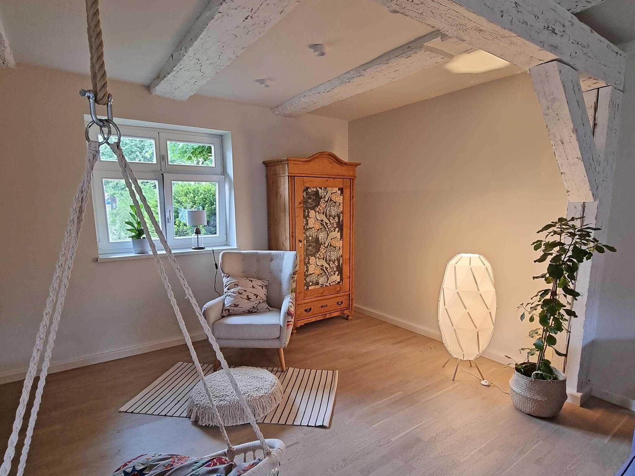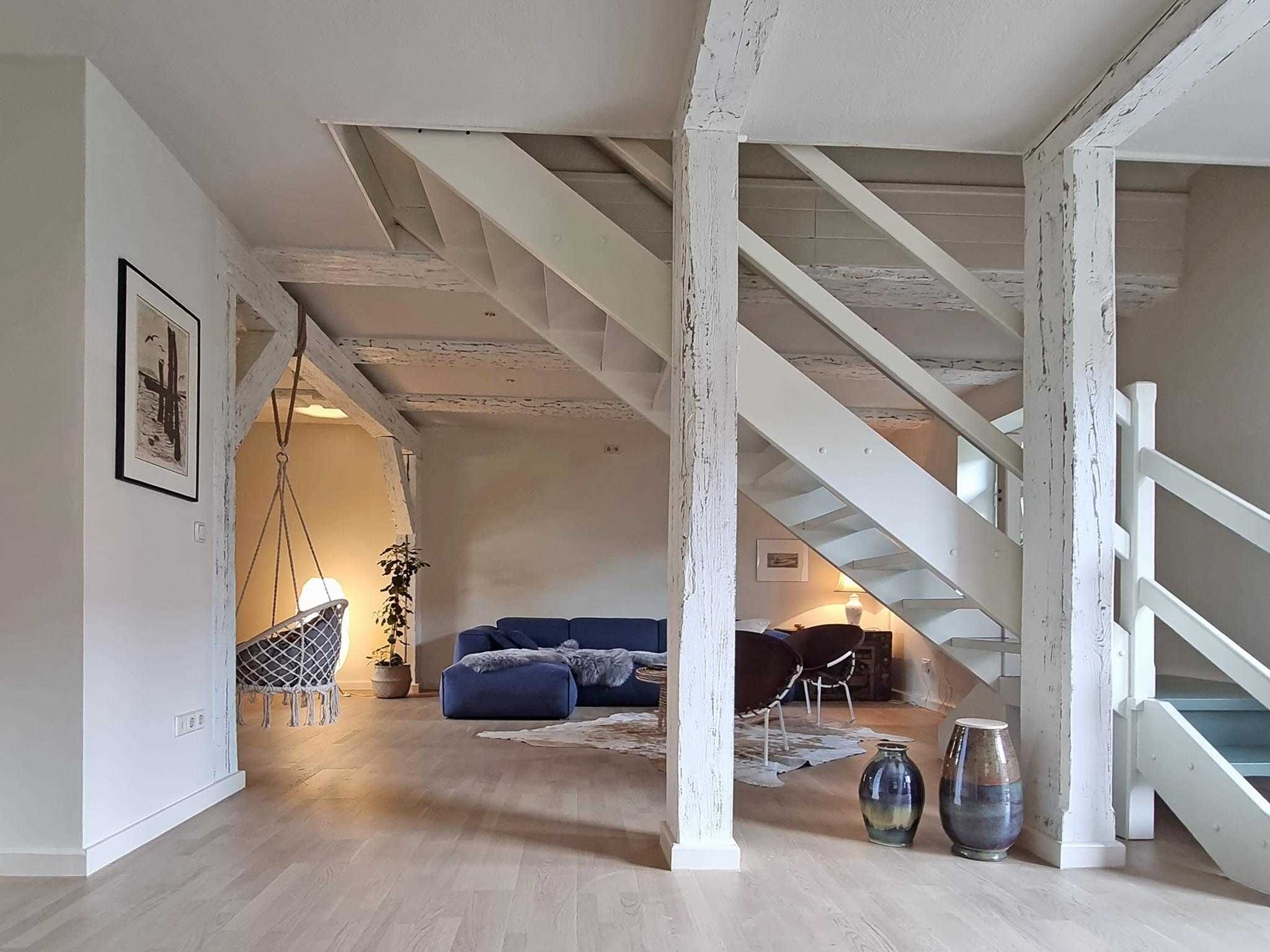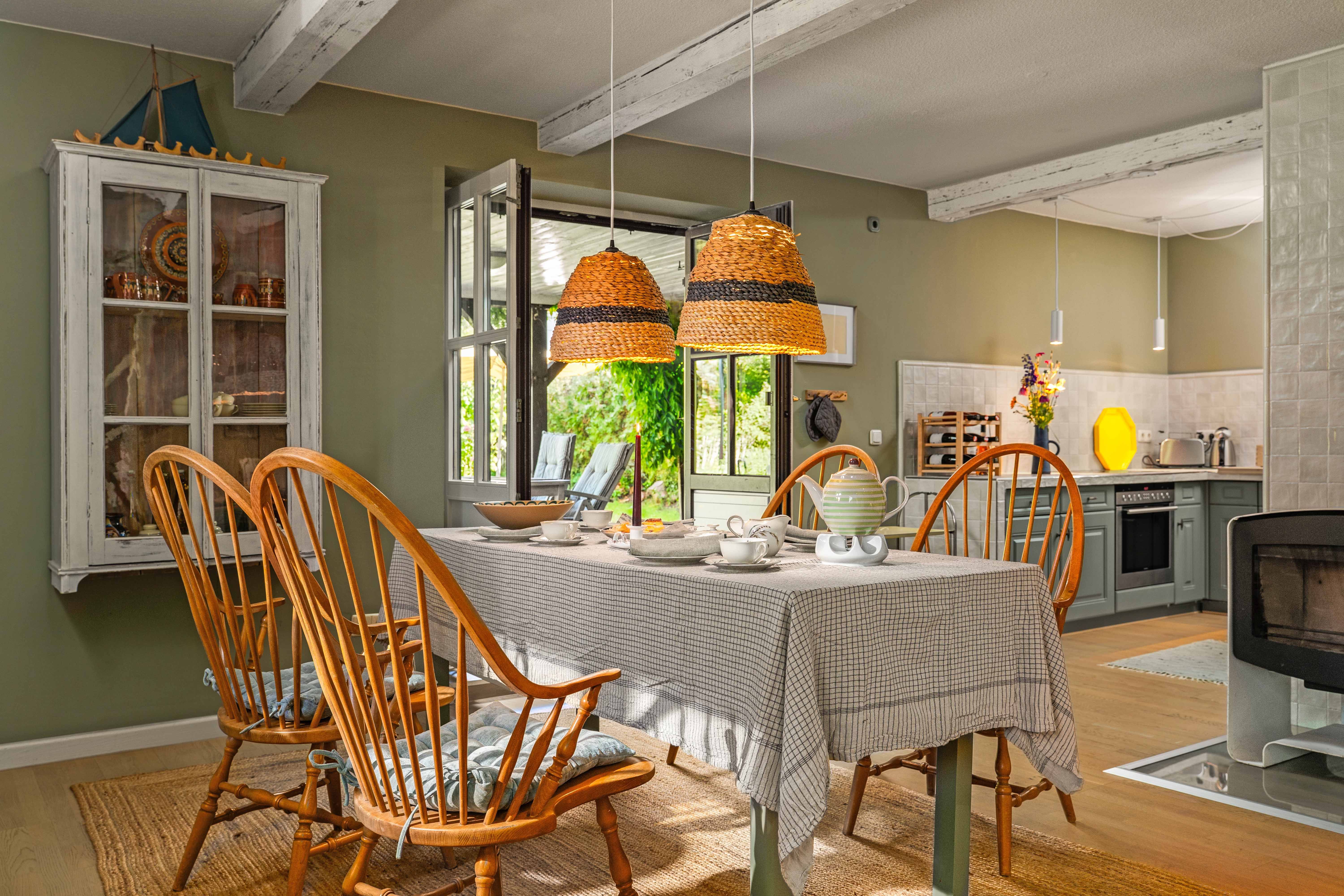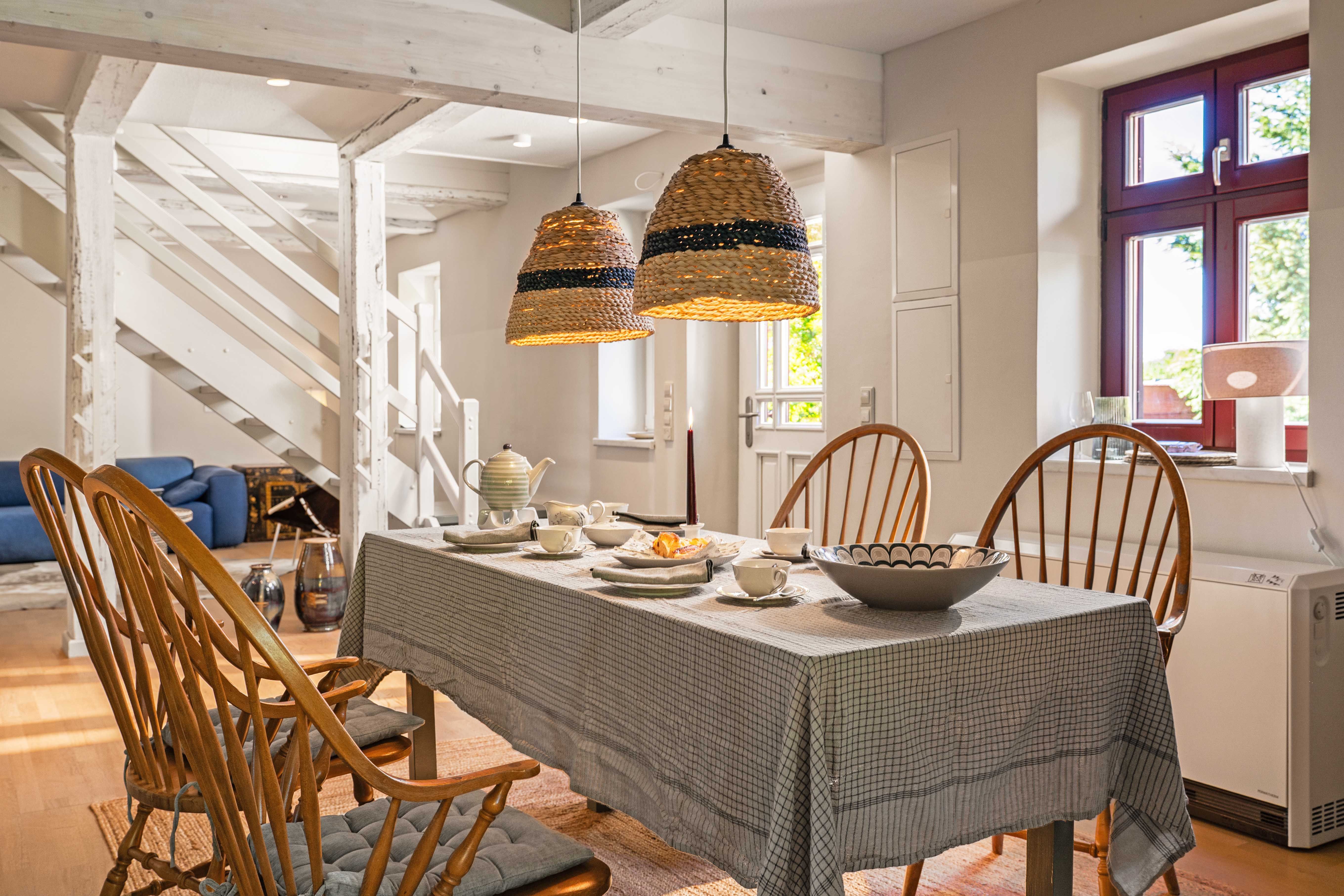 Heute erwartet Sie auf dem Seevogelhof eine lichtdurchflutete Wohlfühlatmosphäre auf 140 Quadratmetern, nur einen Steinwurf vom Ufer des Stettiner Haffs entfernt. Beim Betreten des Hauses werden Sie von einem großzügigen, offenen Wohnraum empfangen. Auf der einen Seite befindet sich der gemütliche Wohnbereich mit einem breiten Loungesofa und Sixties-Designersesseln aus Wildleder. Auf der anderen Seite finden Sie den Essplatz mit einem Kaminofen, einer vollausgestatteten Küche und einer Doppelflügeltür zur überdachten Terrasse mit einem Essplatz im Freien. Zwischen den beiden Wohnbereichen liegen das Badezimmer im Erdgeschoss und die galerieartige Treppe zum Obergeschoss.