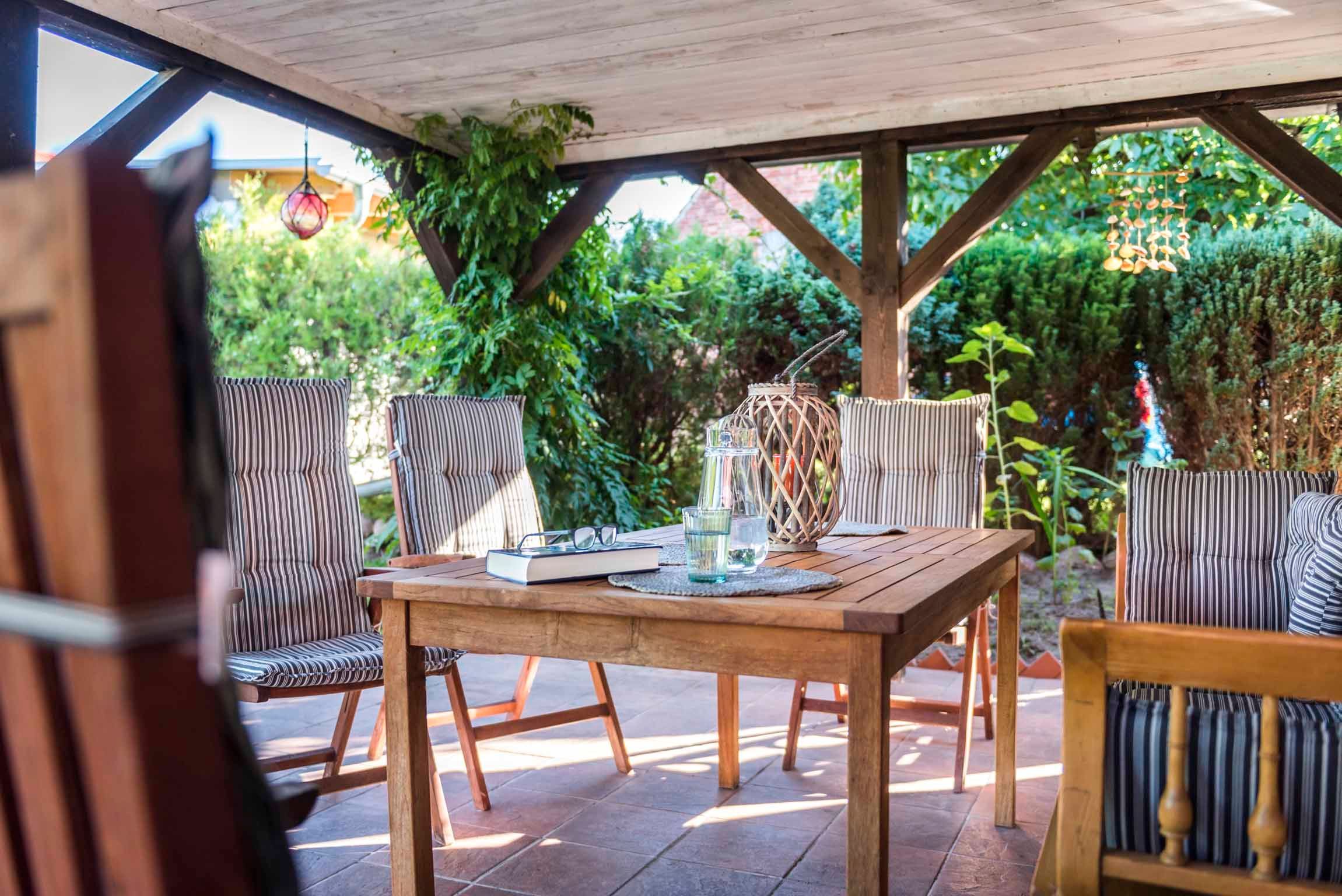 Im komplett umzäunten Hof- und Gartenbereich liegen zwei überdachte Terrassen, auf denen es sich je nach Tageszeit und Sonnenstand wunderbar die Zeit vertrödeln lässt.