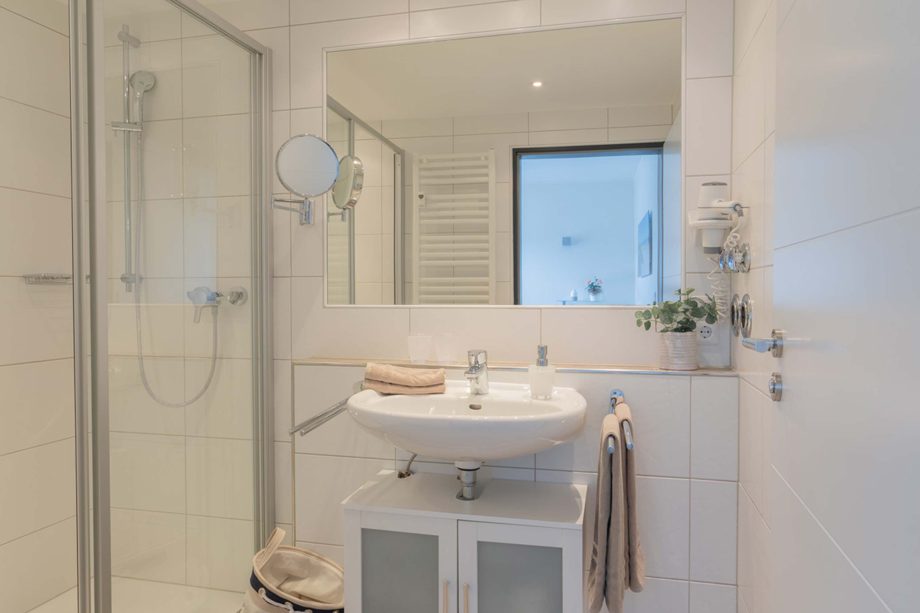 Das moderne Badezimmer verfügt über eine bodentiefe Dusche und ein separat ans Bad angeschlossenes WC.