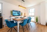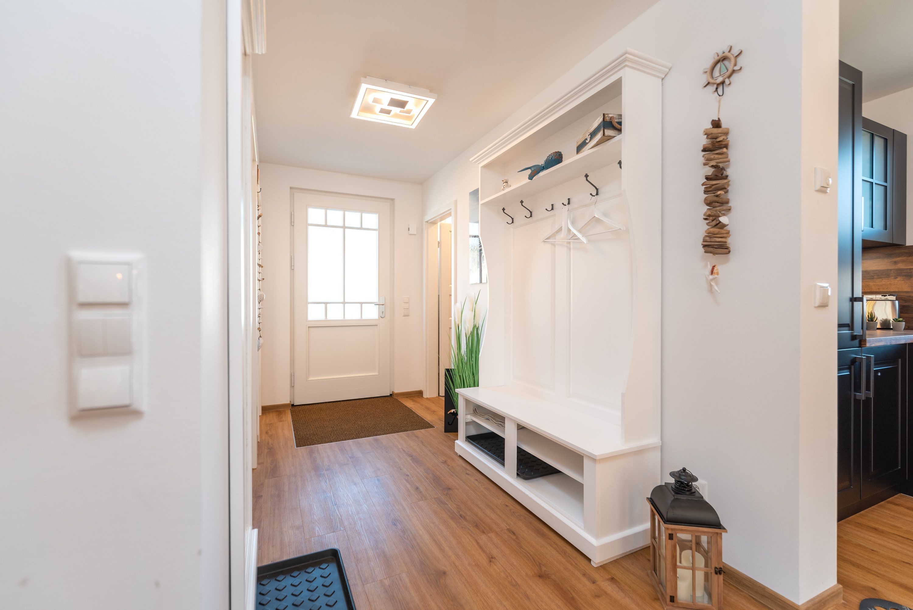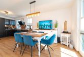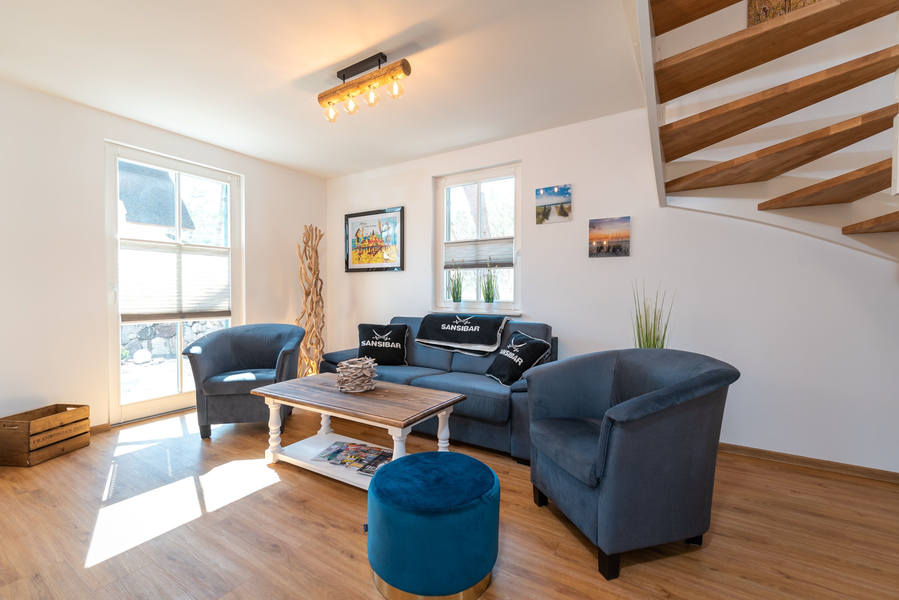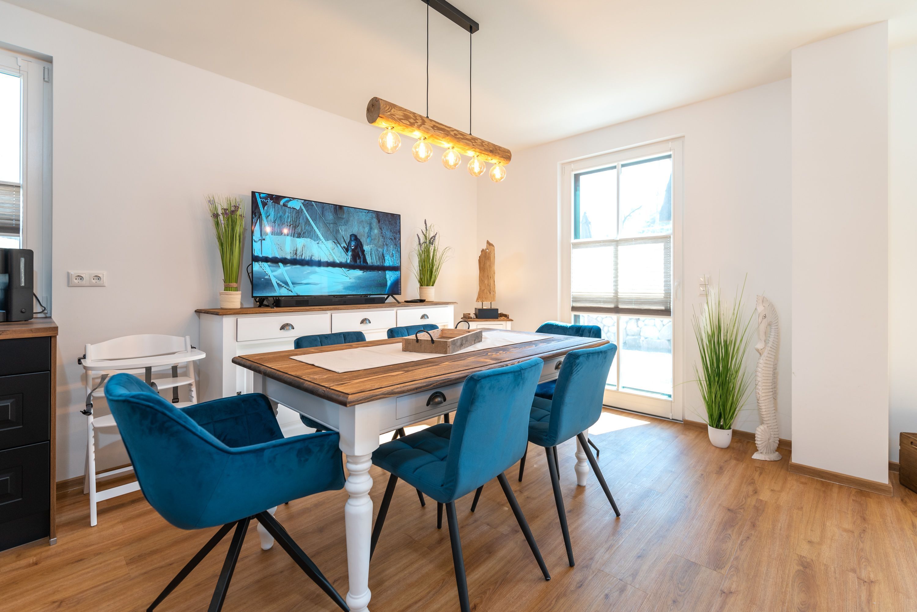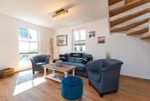 Der offene, helle Wohnbereich lässt entspannte Urlaubstimmung aufkommen. Eine gemütliche Schlafcouch (Aufbettung möglich) mit großem Flatscreen-TV, Ein Kamin, ein Esstisch für bis zu 6 Personen und eine modern ausgestattete Küchenzeile mit Geschirrspüler, Kaffeemaschine, Toaster, Mikrowelle und Wasserkocher bilden einen gelungenen Wohnbereich für die ganze Familie.