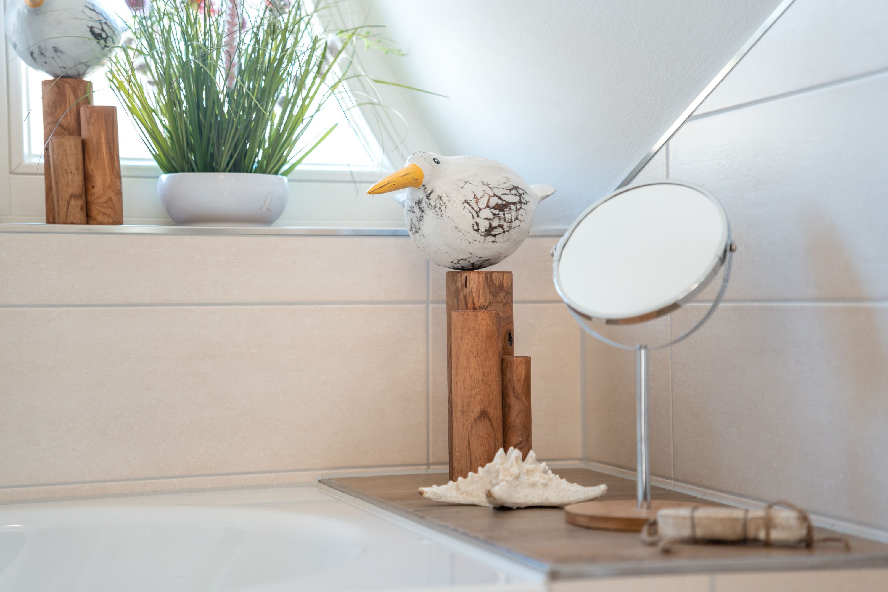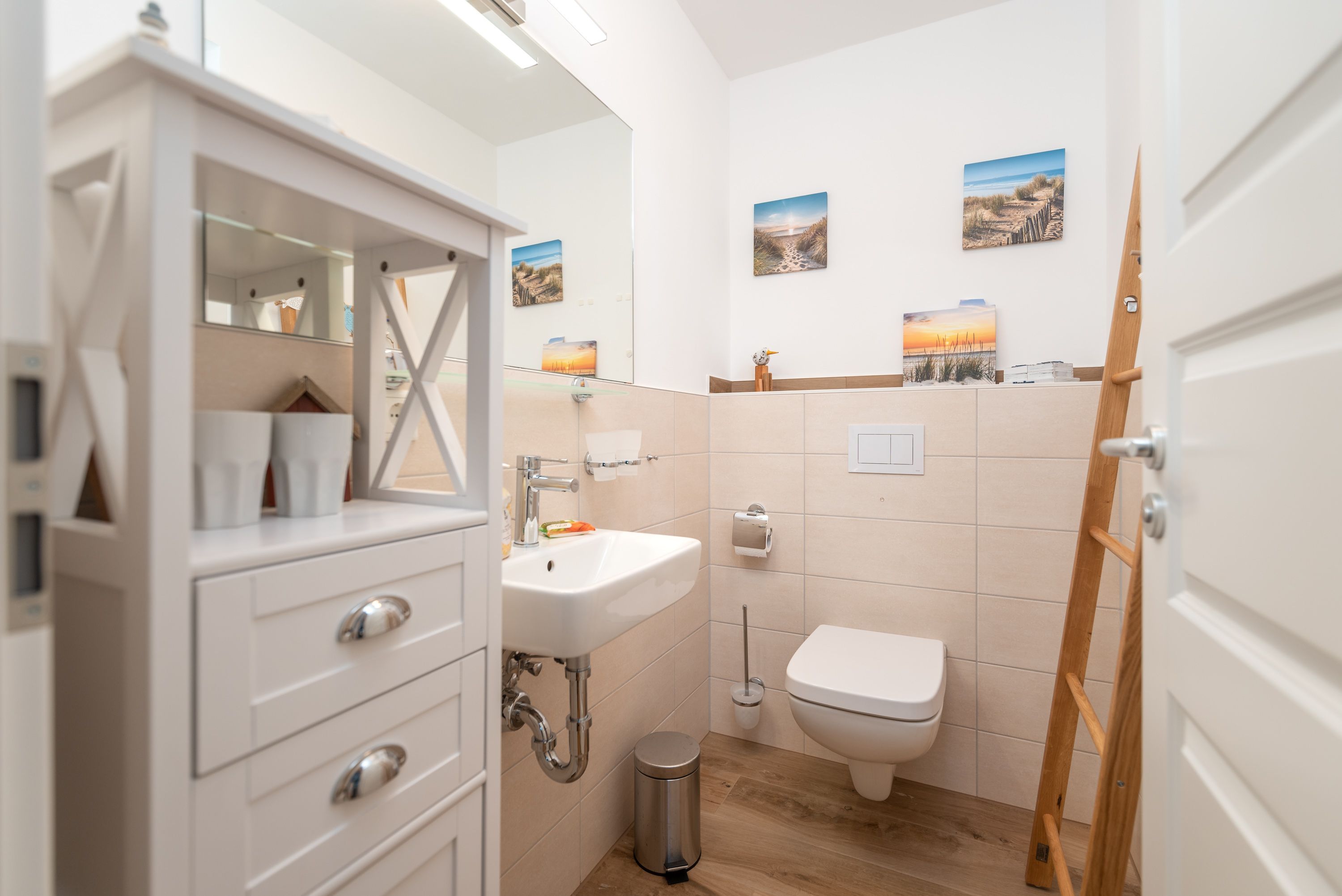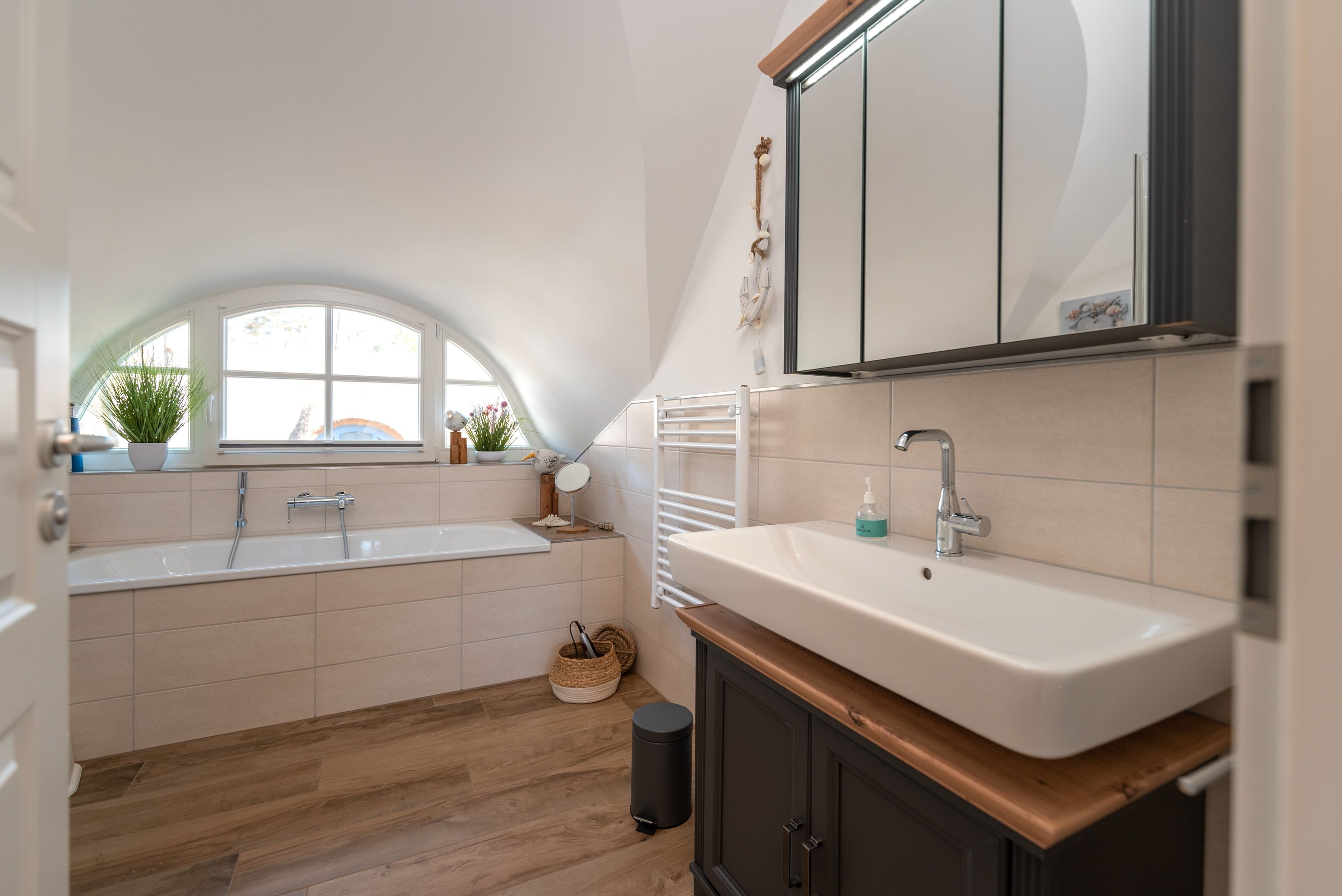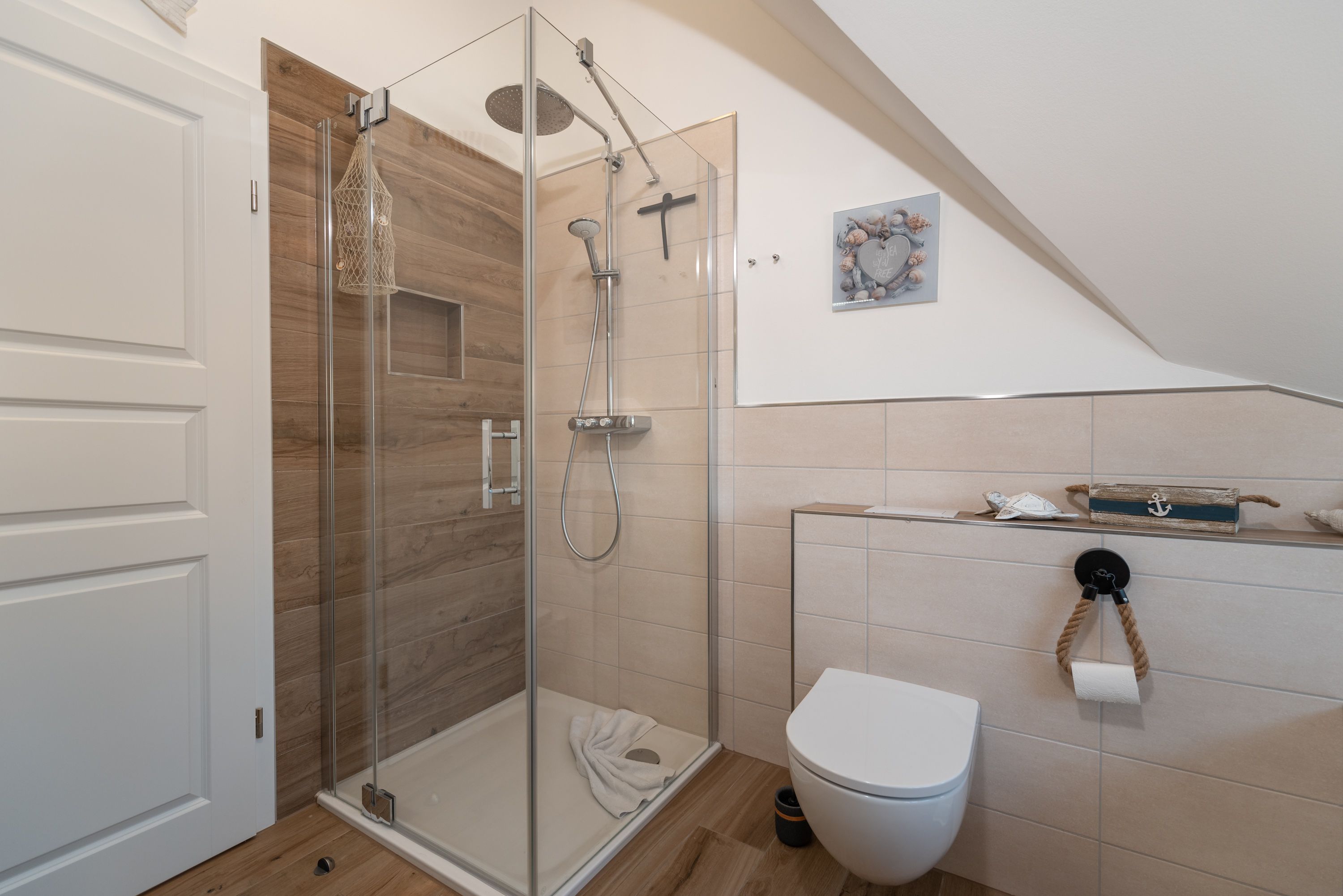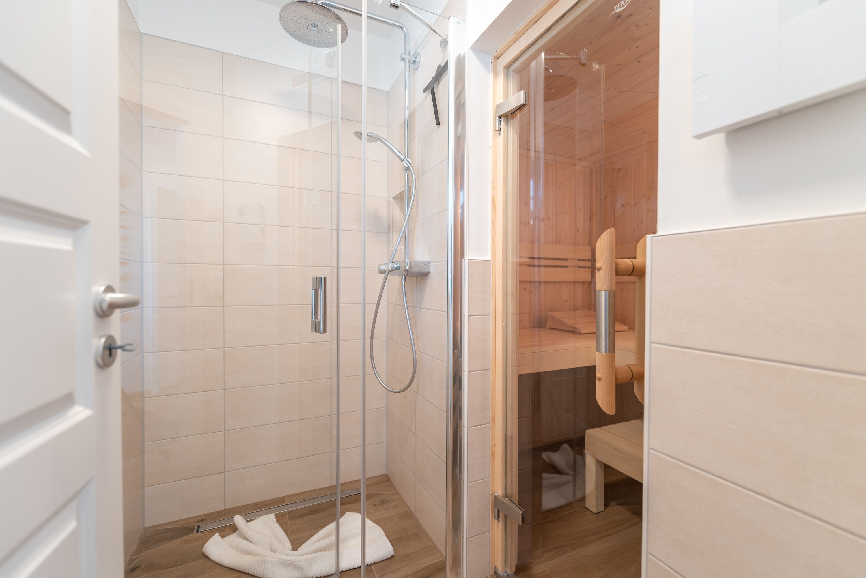 In der ersten Etage befindet sich außerdem ein modernes Badezimmer mit geräumiger Walk-In-Dusche und einer Badewanne. Im Erdgeschoss gibt es noch ein zweites Badezimmer mit Dusche & Sauna. Zusätzlich befindet sich im Erdgeschoss noch ein Gäste-WC.