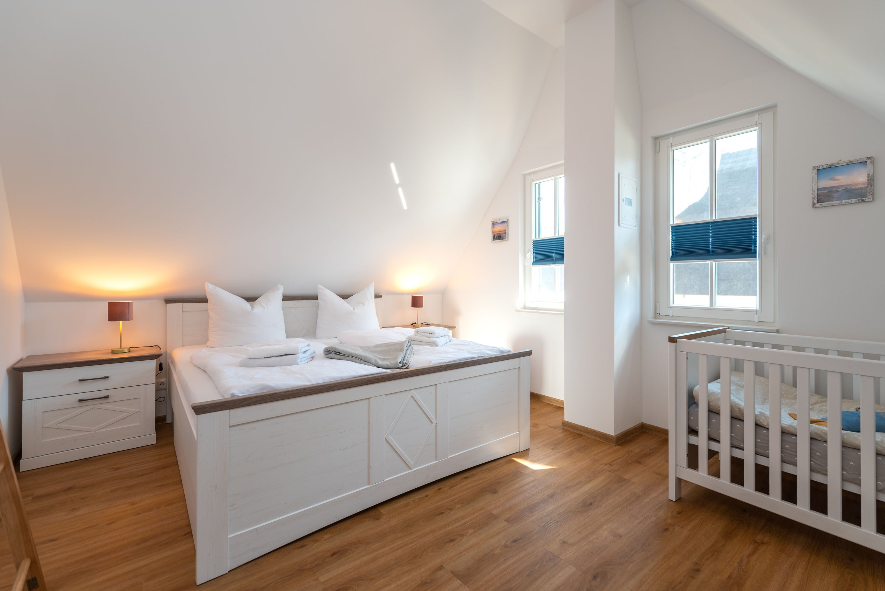 Das charmante, reetgedeckte Ferienhaus „Schmusedom“ versprüht den beliebten Usedomer Inselflair. Auf ca. 97 liebevoll eingerichteten Quadratmetern finden 6 Personen bequem Platz. In der oberen Etage bietet ein Schlafzimmer mit Doppelbett und geräumigem Kleiderschrank Platz zum Träumen und genug Stauraum für die Urlaubsgarderobe. Das zweite Schlafzimmer verfügt zusätzlich zum Doppelbett noch über ein Babybett. Beide Schlafzimmer haben einen Smart-TV.