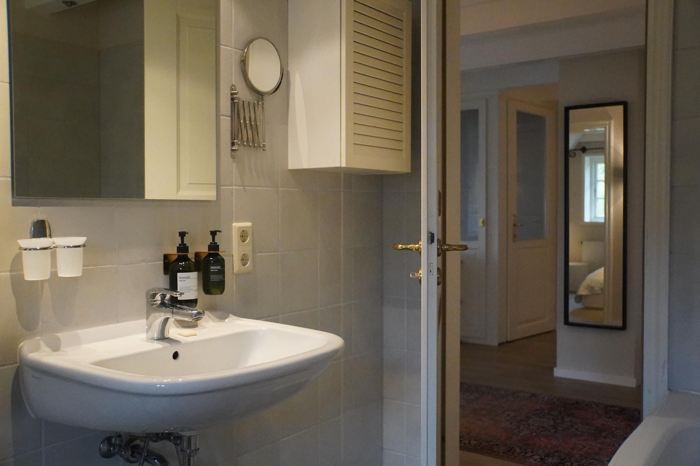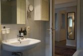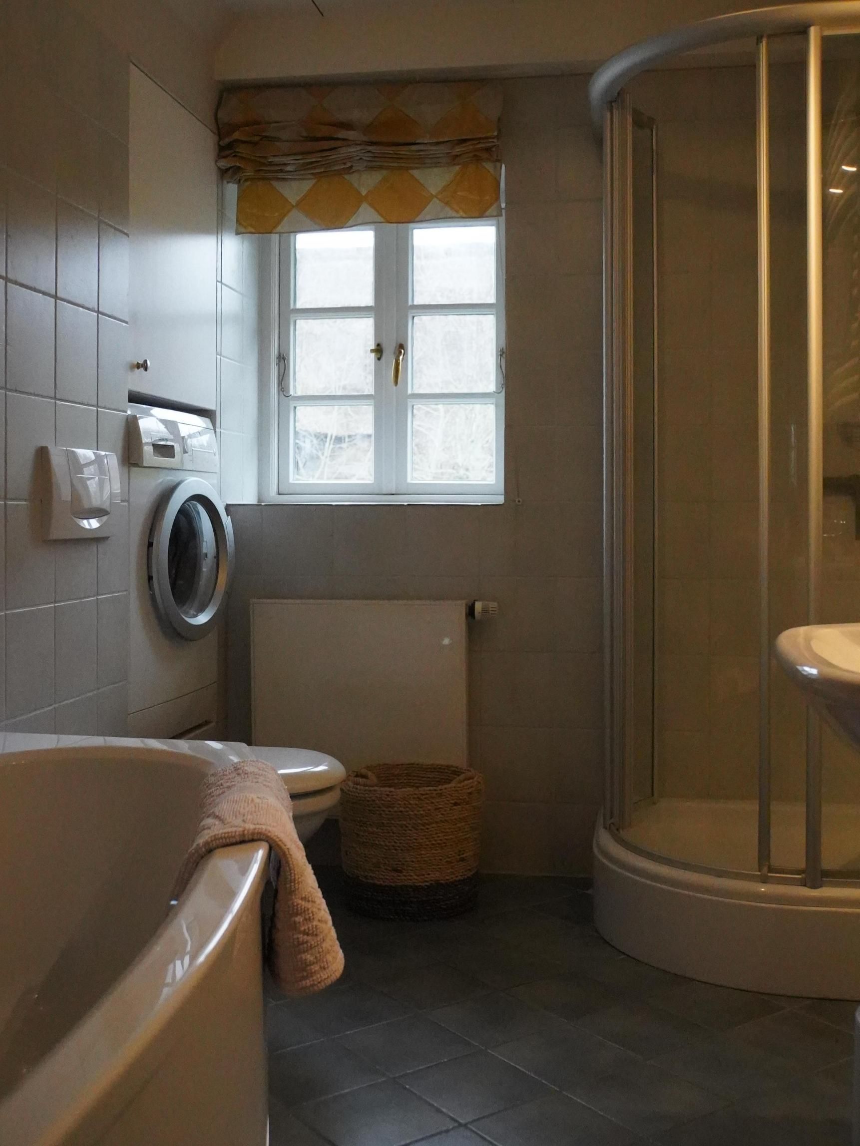Sanitär: bodenebene Dusche, Föhn, Handtuchheizkörper, Schminkspiegel.