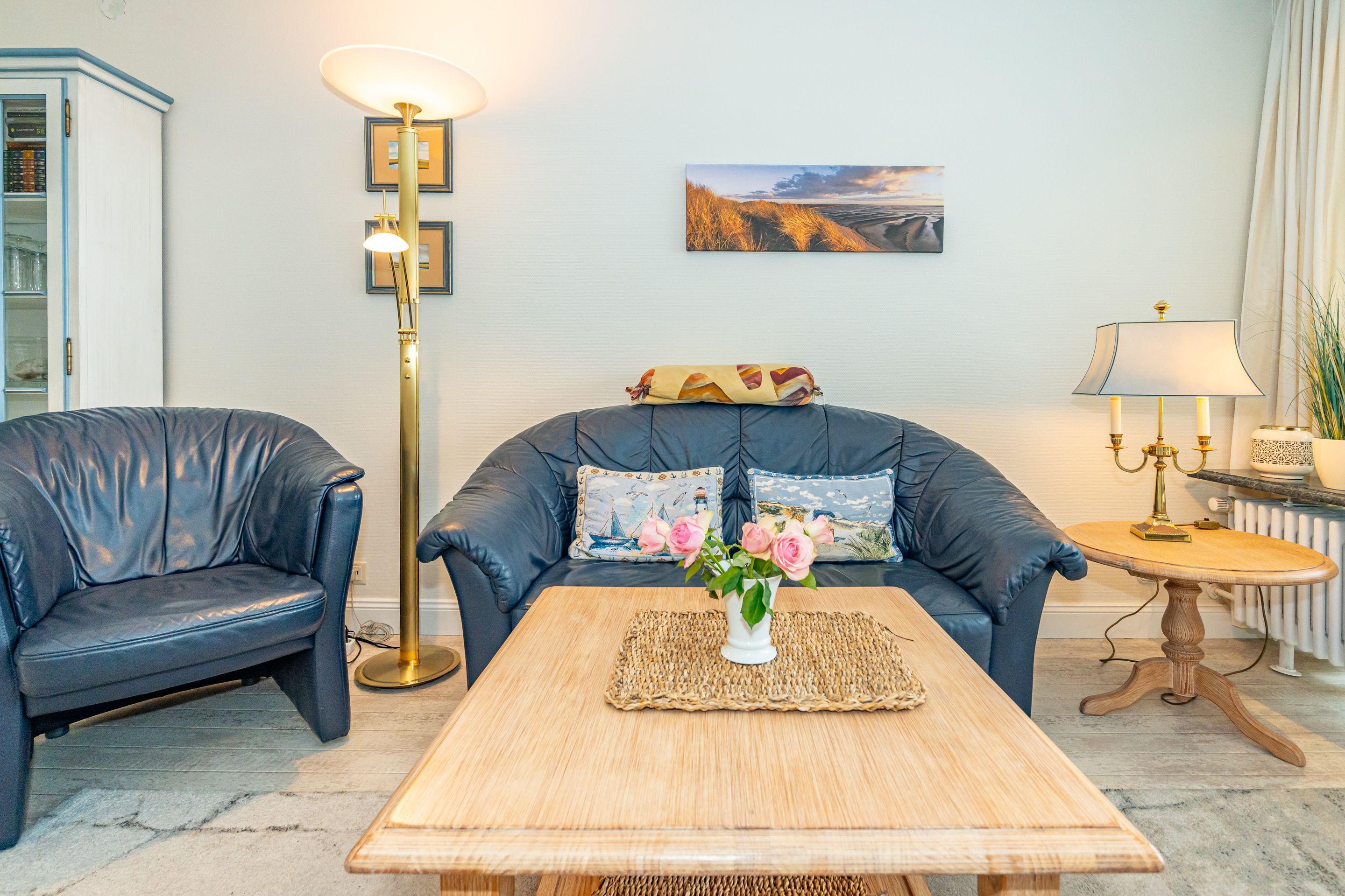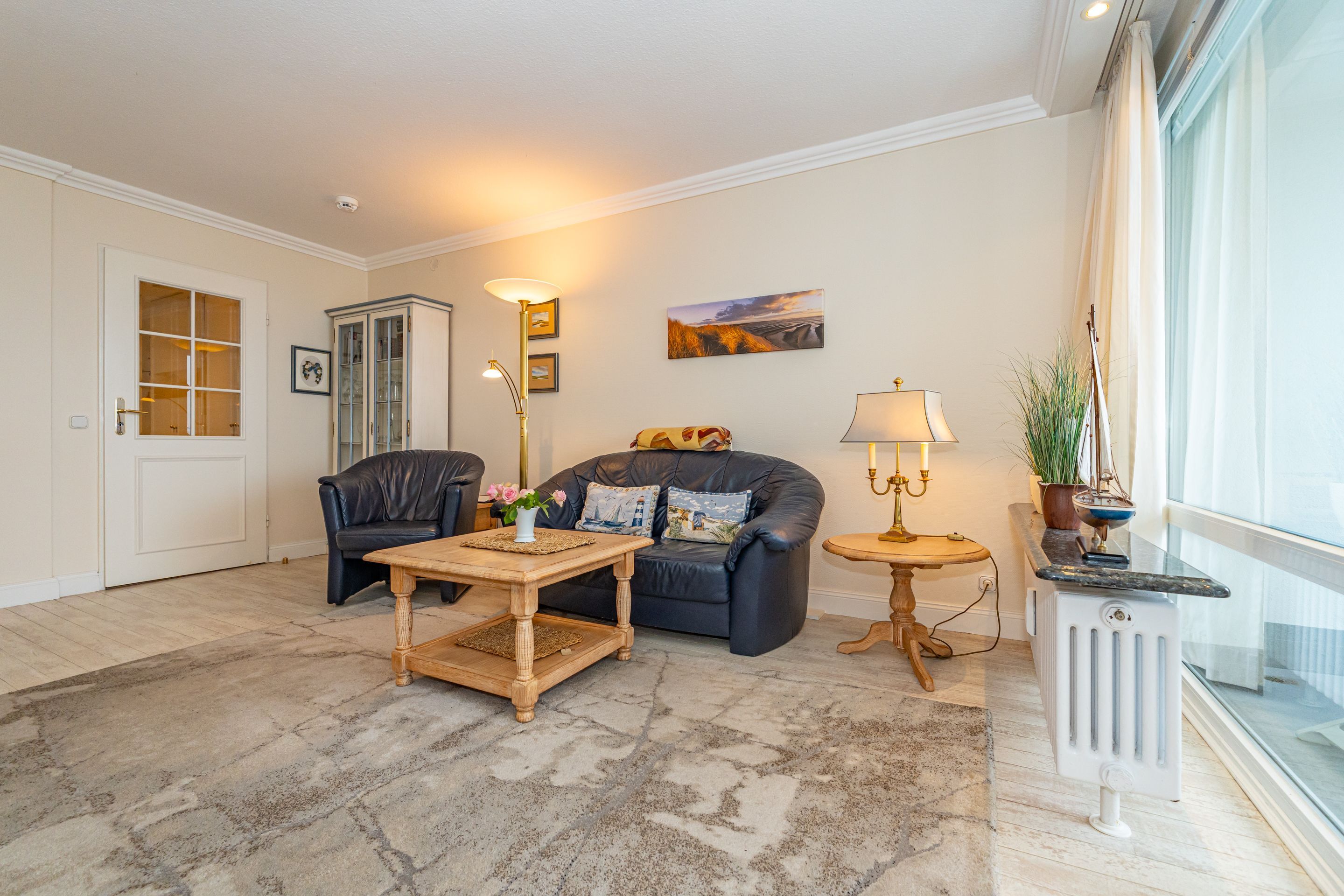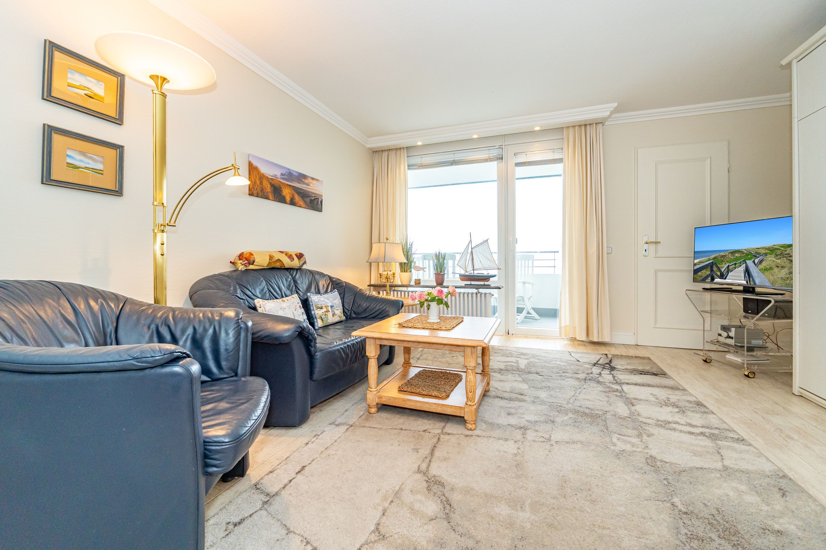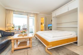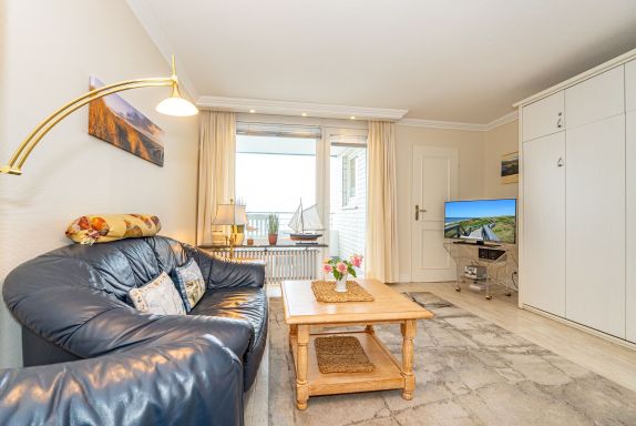 Exklusive 1,5-Zimmer-Nichtraucher-Ferienwohnung, ca. 48 qm, in der 6. Etage zur Seeseite mit herrlichem Meerblick und Westloggia (Nachmittagssonne, mit Balkonmöbeln und Auflagen) für max. 3 Personen.