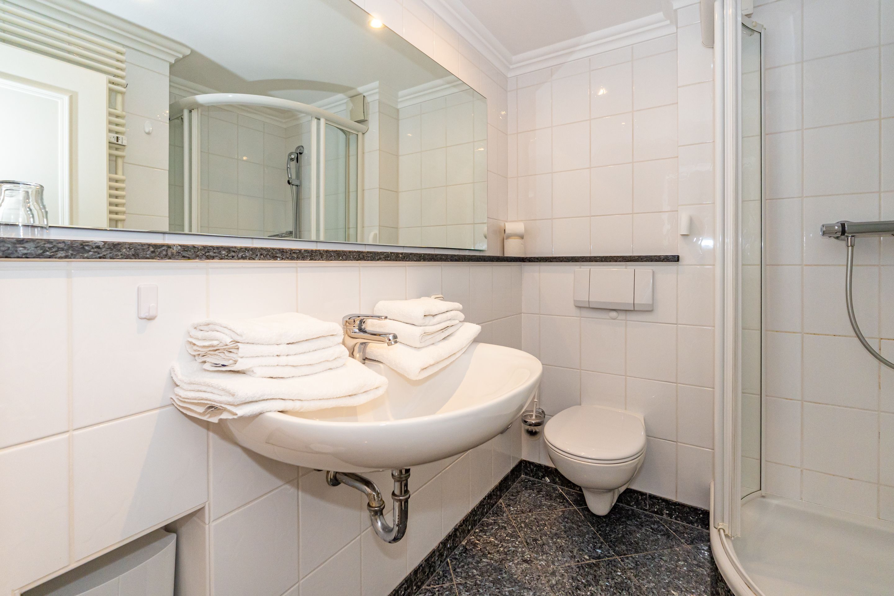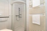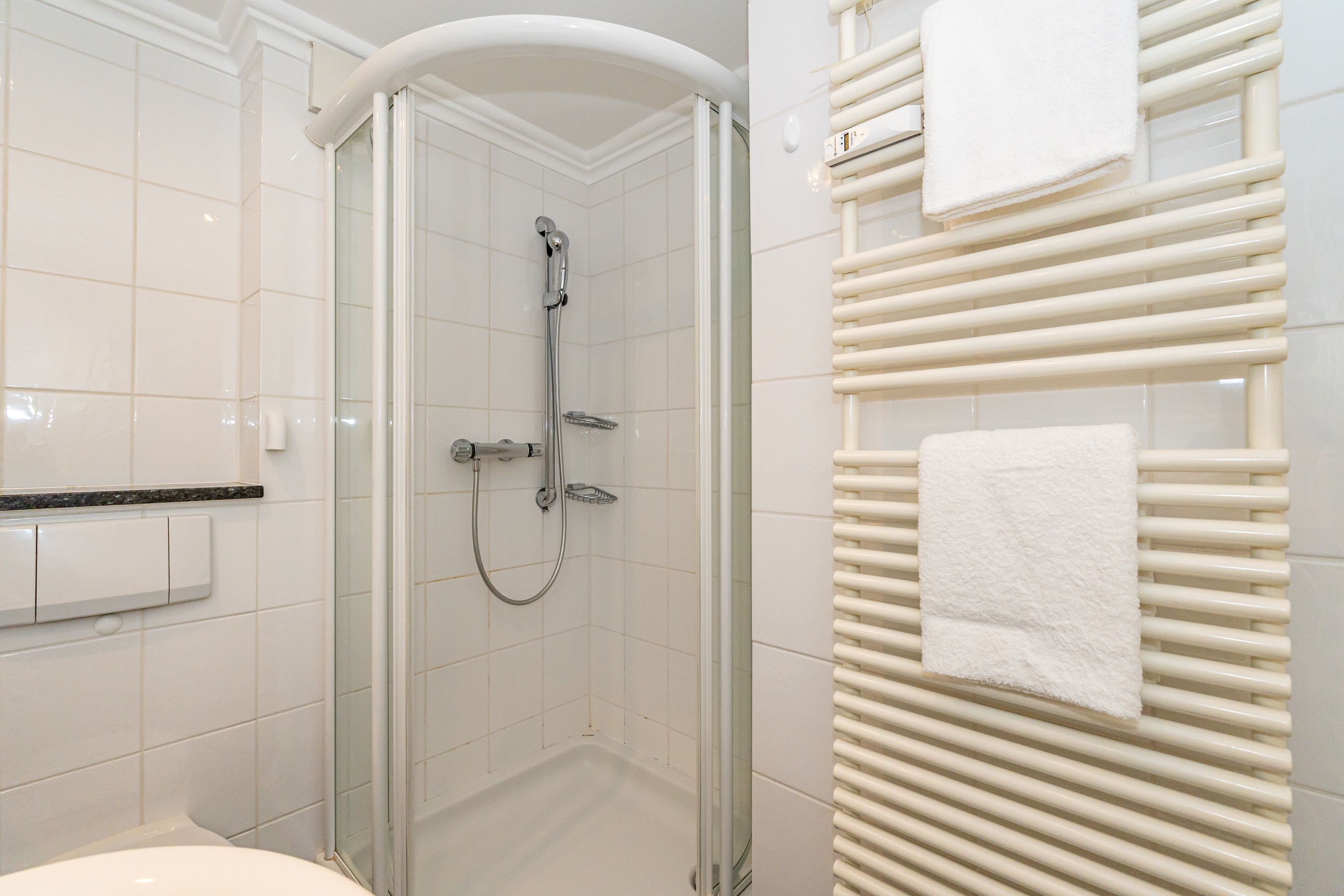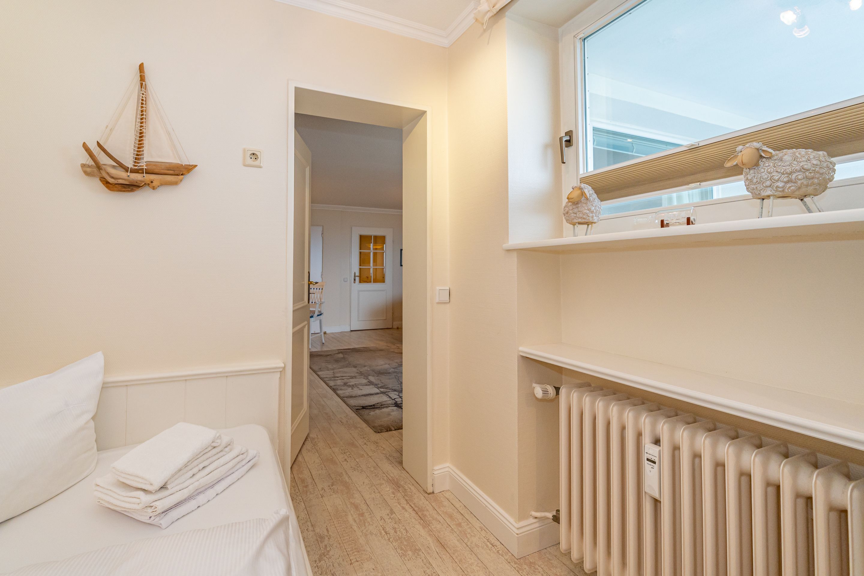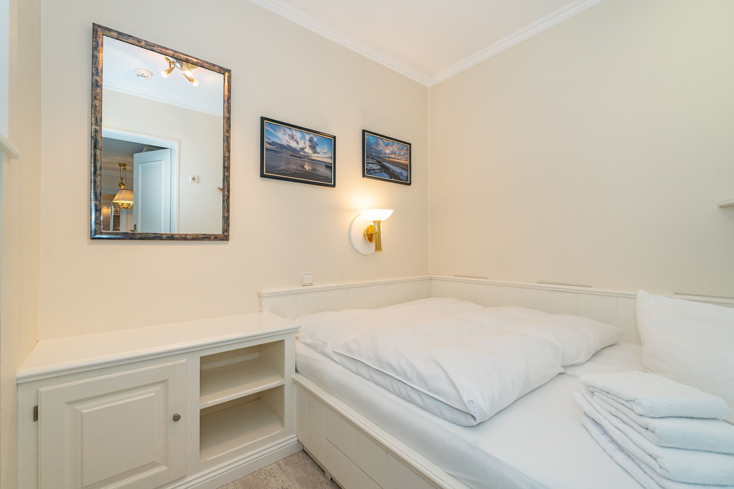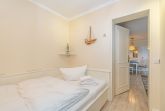Vom Wohnzimmer gelangt man in das kleine Schlafzimmer mit Einzelbett(Maße: 1,40m x 2,00 m). Im Bad befinden sich eine Dusche, ein WC und ein Waschtisch.